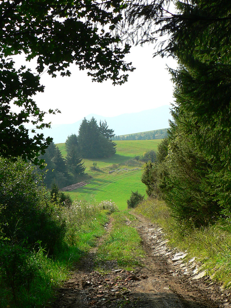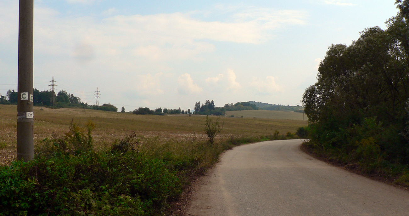 Tak záver už len po parádnych lúčnych cestách. Valím smer Sklabiňa, tu je viac možností, opísané sú v tom druhom článku. Zo Sklabine, z dolinky, zas do kopca pomedzi domy na ďalšie lúky, družstevníci tu majú dokonca asfaltky naťahané. Zjazdík popod elektrické stožiare, intuitívne križujem cestu kúsok za Starou Bôrovou presne na tom mieste, kde som chcel - aby som mohol dať posledný krátky výšľap na paralelný trávnatý hrebienok. Lebo nazad po ceste cez mláky, vysypané tými škridlami, sa mi už druhý raz nechce.