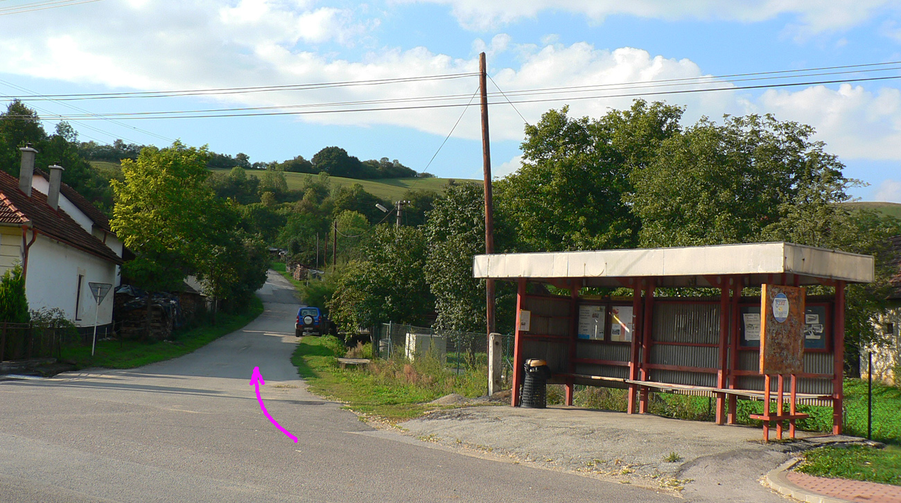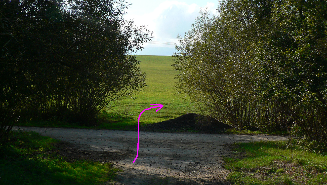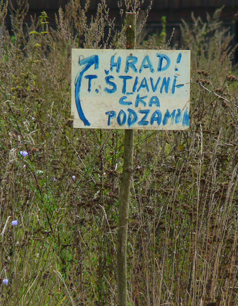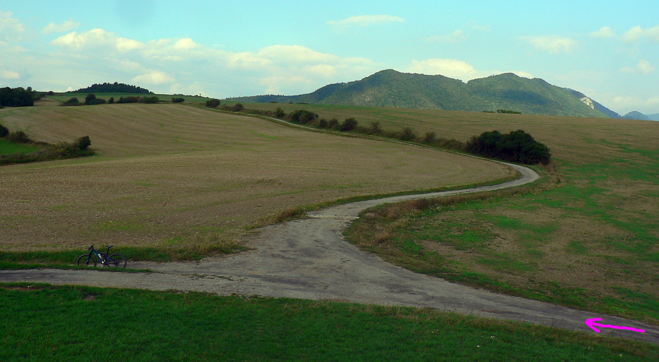 Začiatok je pohodlný: z Košút až po Starú Bôrovú asfalt a neskôr drťou vyspravená poľná cesta. Až na tú hromadu rozbitých škridiel v najväčších mlákach... V Bôrovej domáci zapichli na križovatku tabuľku kade na hrad, aby im tam bajkeri neblúdili pomedzi maštale :-) Takže smer jasný. Trochu blata v prvom lese a na lúke dilema: strmo hore k hradu alebo lesom dole na asfaltku? Pohodlnejší variant zvíťazil, nastúpam dnes ešte dosť.