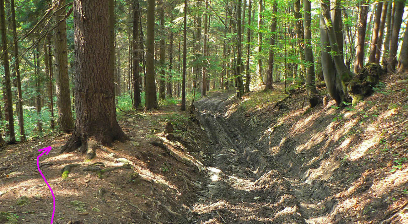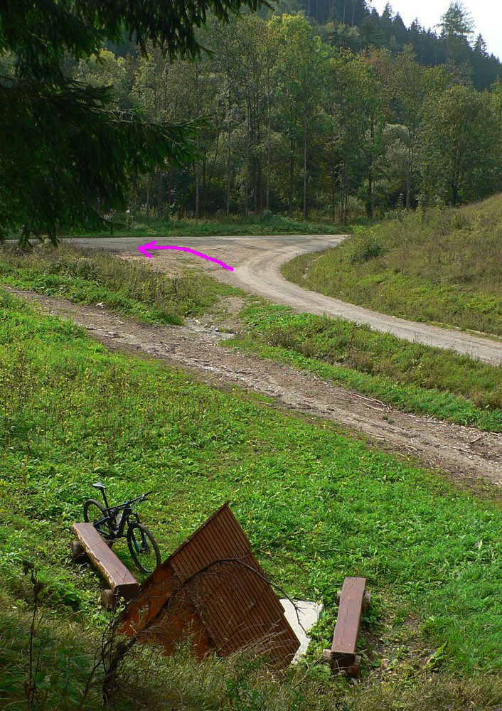 Zosvištím dolinou a moja by mala byť prvá výrazná odbočka doľava, popod Lučenec. Mala by ma doviesť na žltú značku a po nej dole do Sklabinskej doliny (ku smerovníku Medzi mníchmi). Tak aj je, odbočka sa nedá minúť. Len tu už je o dosť viac blata, raz aj prenášať musím. Potom žltá - chvíľu na parádu, ale akonáhle sa skloní do strminy, je to katastrofa, tankodrom a mordor. Zjazdné len v tomto smere, aj to len tak – tak. Dole studnička a zatáčam doľava, hore Sklabinskou dolinou, po modrej. Malo by to už byť v pohode.
