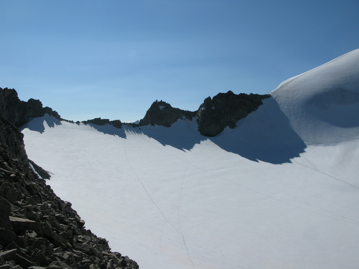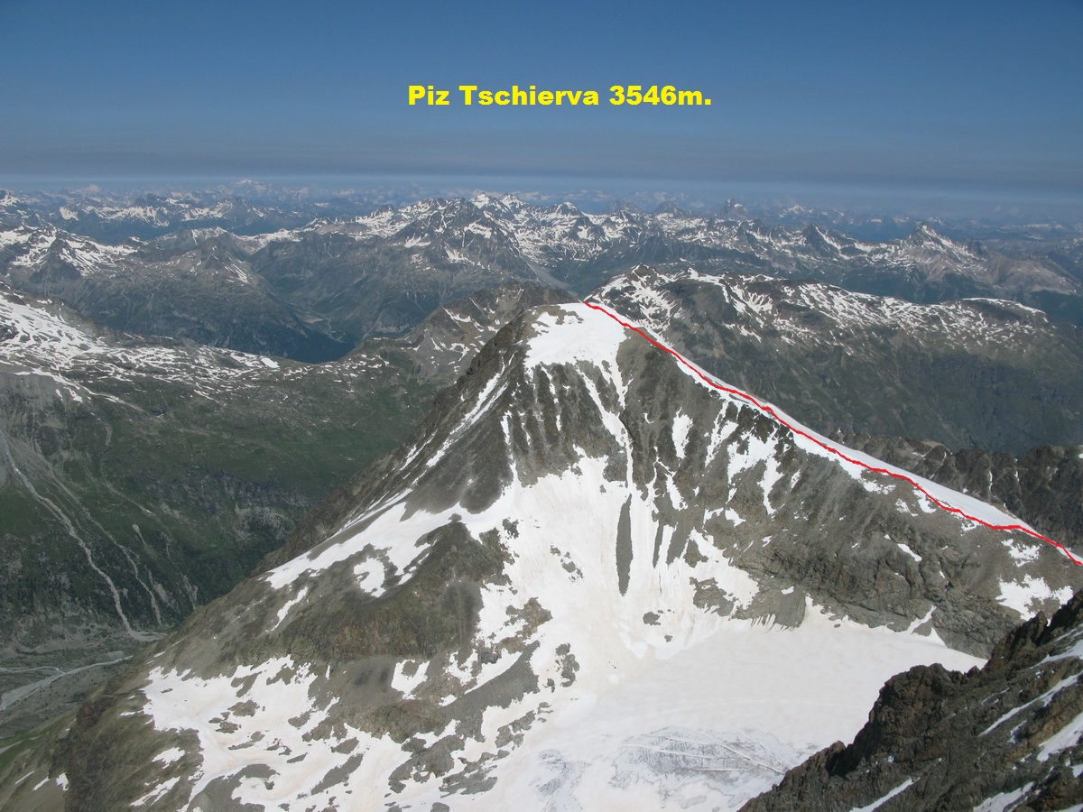 Výstup vedie sčasti aj po ľadovci. Nie sú tu však nejaké nebezpečné trhliny a hlavne na Tschiervu sa dá v pohode dostať aj bez použitia lana, prípadne mačiek (závisí od stavu snehu). Výhľady z Tschiervy sú luxusné... :) Ako som sa tak kochal a pozoroval lanové družstvá, zostupujúce z Morteratschu, rozhodol som sa využiť nastúpanú výšku a odskočil som si ešte na jeho vrchol. Aj keď som v ten deň mačky nepoužil, rozhodne ich na tento výstup treba mať pribalené so sebou...