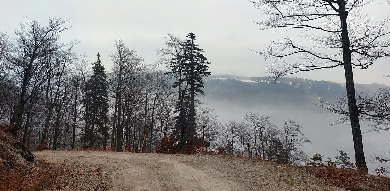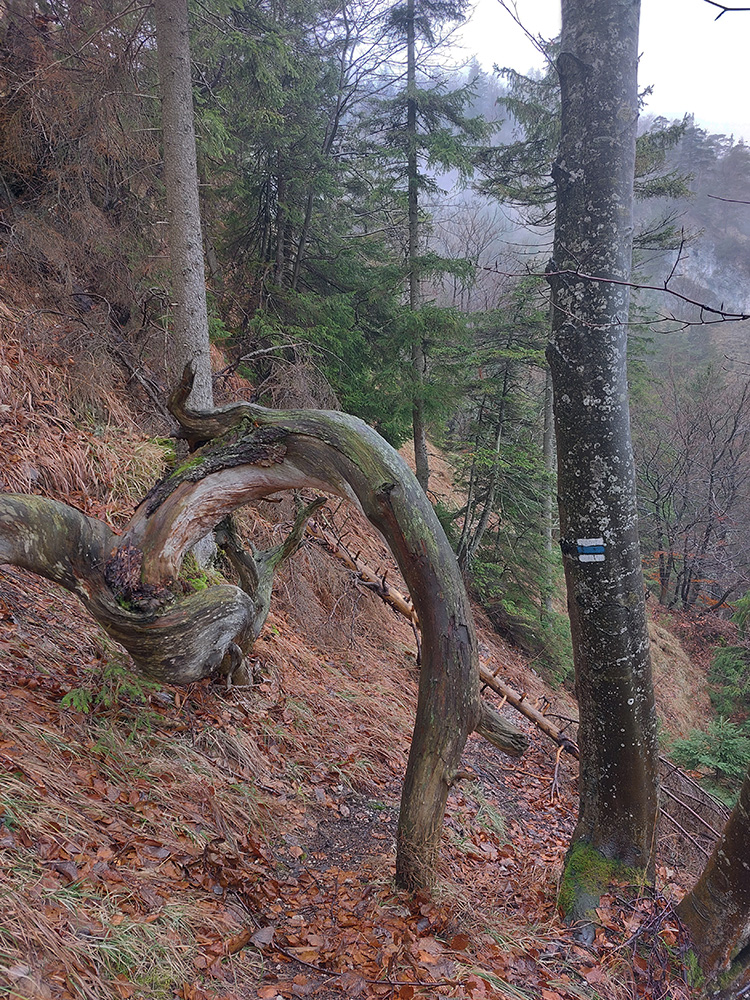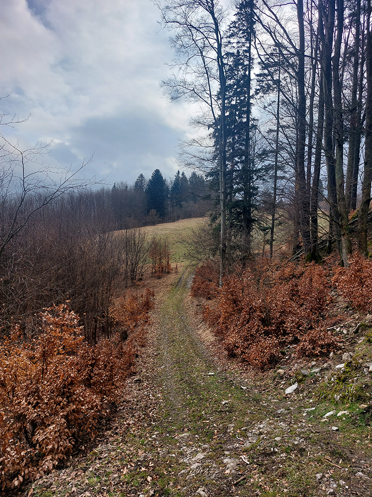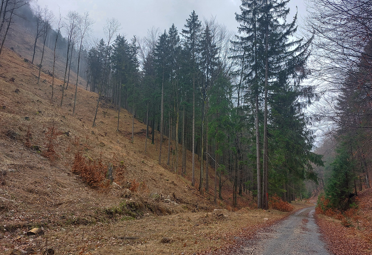 Už z diaľky vidím, že na Drienku sedí mrak (nižšie sú mraky tiež, som v nejakej medzivrstve), no ešte nie som rozhodnutý, kade dole, tak idem hore. Prestalo konečne mrholiť, ale chodník aj tak suchý (aj predtým), veď ako na vápencoch bralnej Fatry. Hore len fotím to pravé, plnotučné mlieko a davaj nazad. Neznačený poľovnícky chodník si odpustím, lebo keď si pomyslím, do akého lesohospodárskeho mordoru dole ústi...