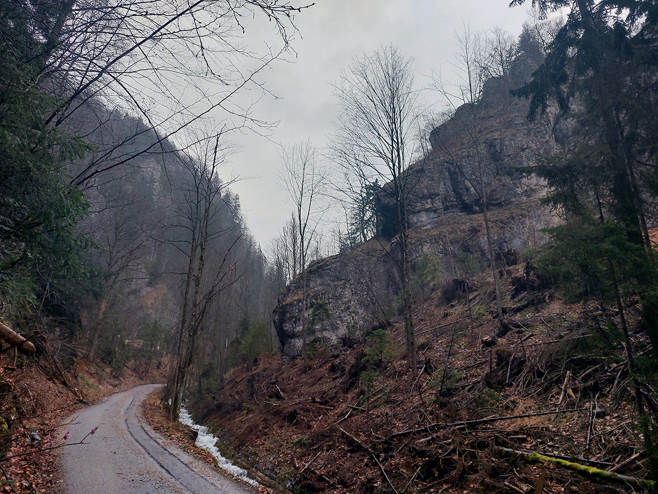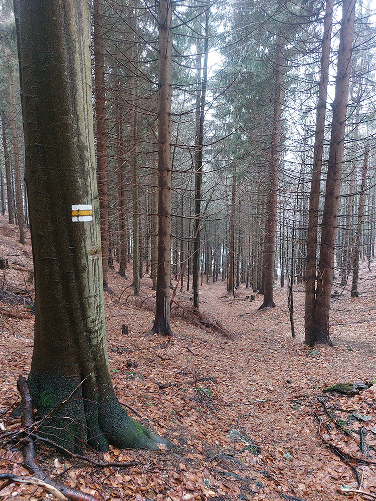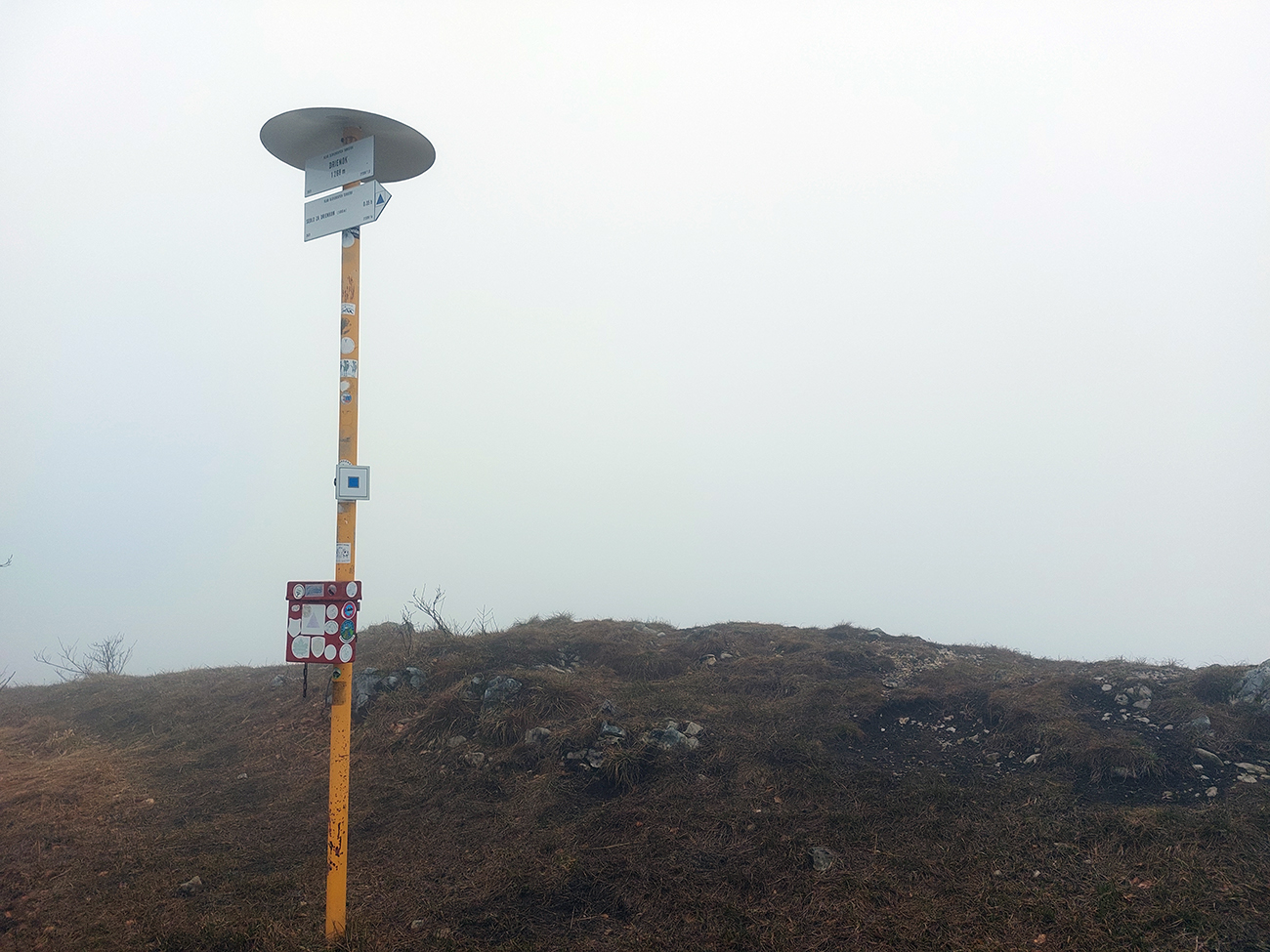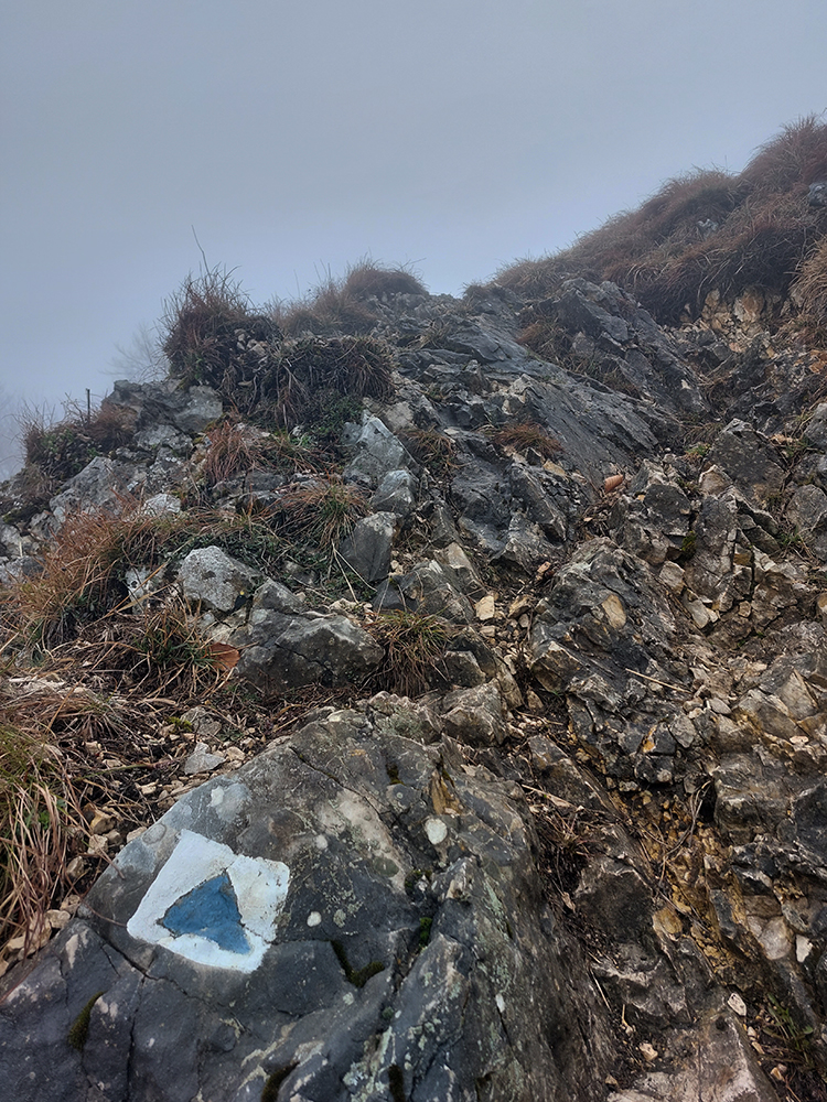 Už z diaľky vidím, že na Drienku sedí mrak (nižšie sú mraky tiež, som v nejakej medzivrstve), no ešte nie som rozhodnutý, kade dole, tak idem hore. Prestalo konečne mrholiť, ale chodník aj tak suchý (aj predtým), veď ako na vápencoch bralnej Fatry. Hore len fotím to pravé, plnotučné mlieko a davaj nazad. Neznačený poľovnícky chodník si odpustím, lebo keď si pomyslím, do akého lesohospodárskeho mordoru dole ústi...