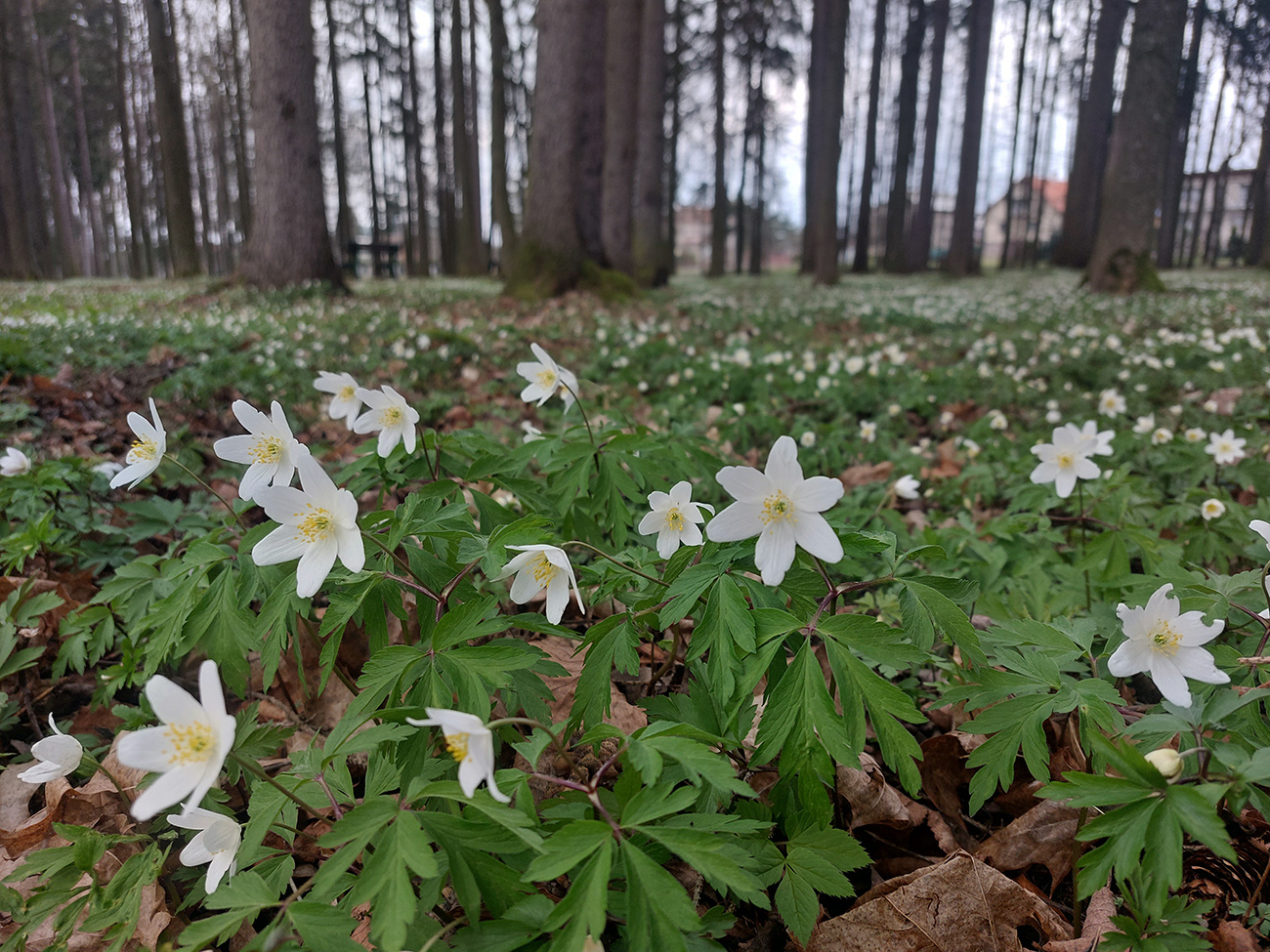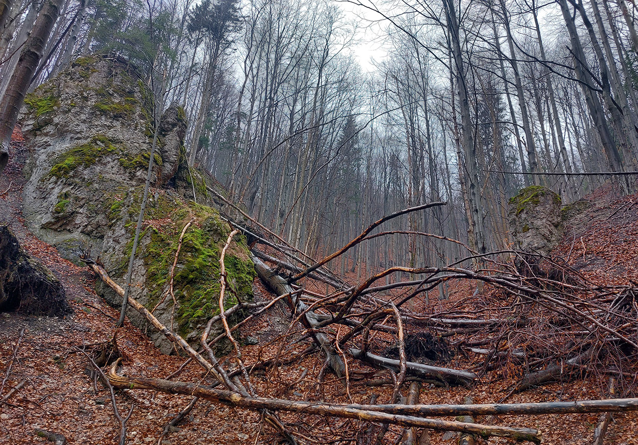 A tak aj je – od konca cesty pokračuje zreteľný poľovnícky chodníček, pomedzi pekné skalky. Síce sa po chvíli stratí v spleti jeleních prtí, ale neva. O chvíľu už vidím naproti na Čremošnianskych lazoch „Kráľov dvor“ a k nemu viem, ako sa z doliny dostanem. Takže z jednej vyhliadkovej skalky valím priamo dole, po hrebienku, po hranici porastov, pohodlne, aj keď strmo. Zostup mi spríjemňujú kvitnúce lykovce.
