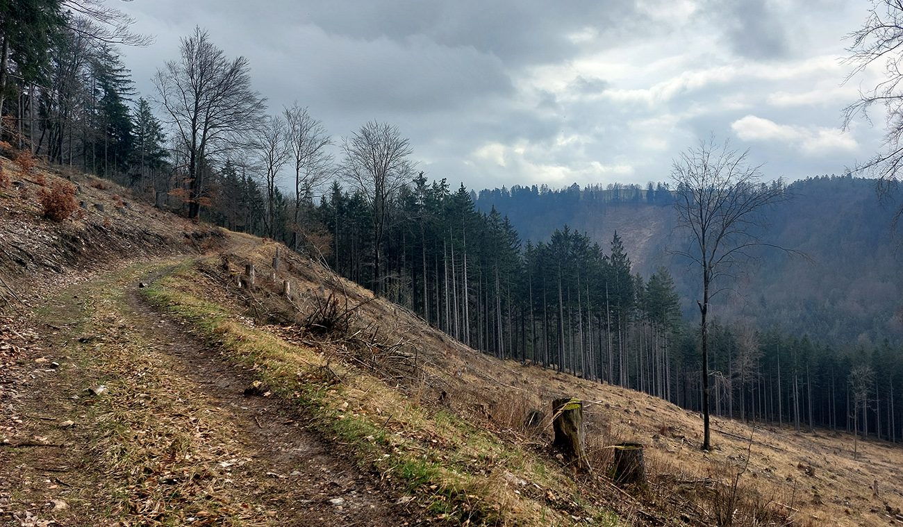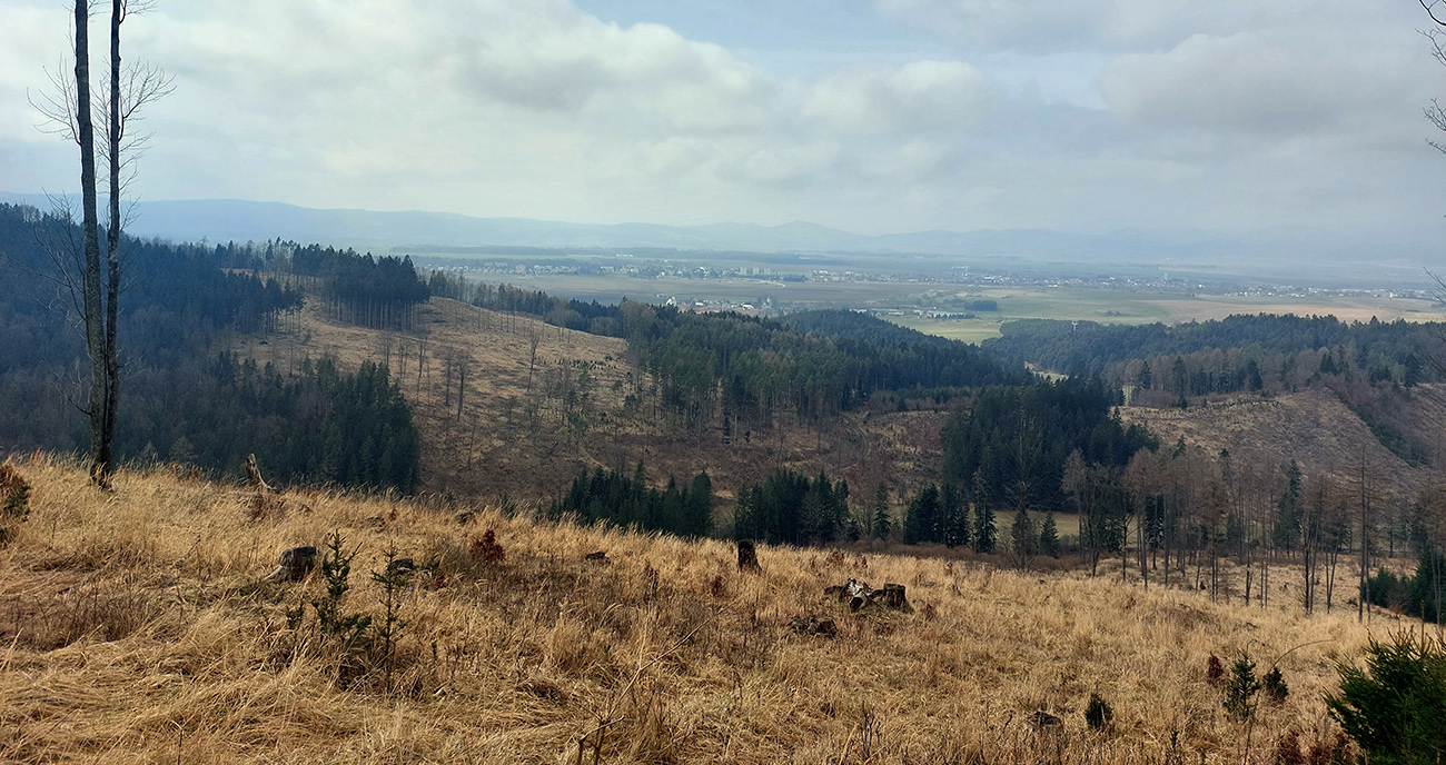 Modrá z Drienka do doliny Mača nie je už taká romanticky divoká, zato si užívam dlhééé asfaltovanie. A potom síce mäkšiu šotolinu Rakšianskej doliny, ale zase okolo tie megarúbaniská... Ako v savane, aj nejaké gazely sa v diaľke pasú. Aj slnko vyliezlo a začína vyprážať. Alebo skôr dusiť, ako je vlhko. Už dosť pomaly (nohám to dnes nie moc chutí) stúpam po lesnej ceste, výhľady ku Tepliciam sa ponad tie holiny otvárajú široké a pomaly hľadám zostupovú trasu do Nedozorskej doliny. Dalo by sa, sklon je mierny a terén savany prehľadný. Ale tuším, že sa bude dať niečo vymyslieť aj za koncom cesty.
