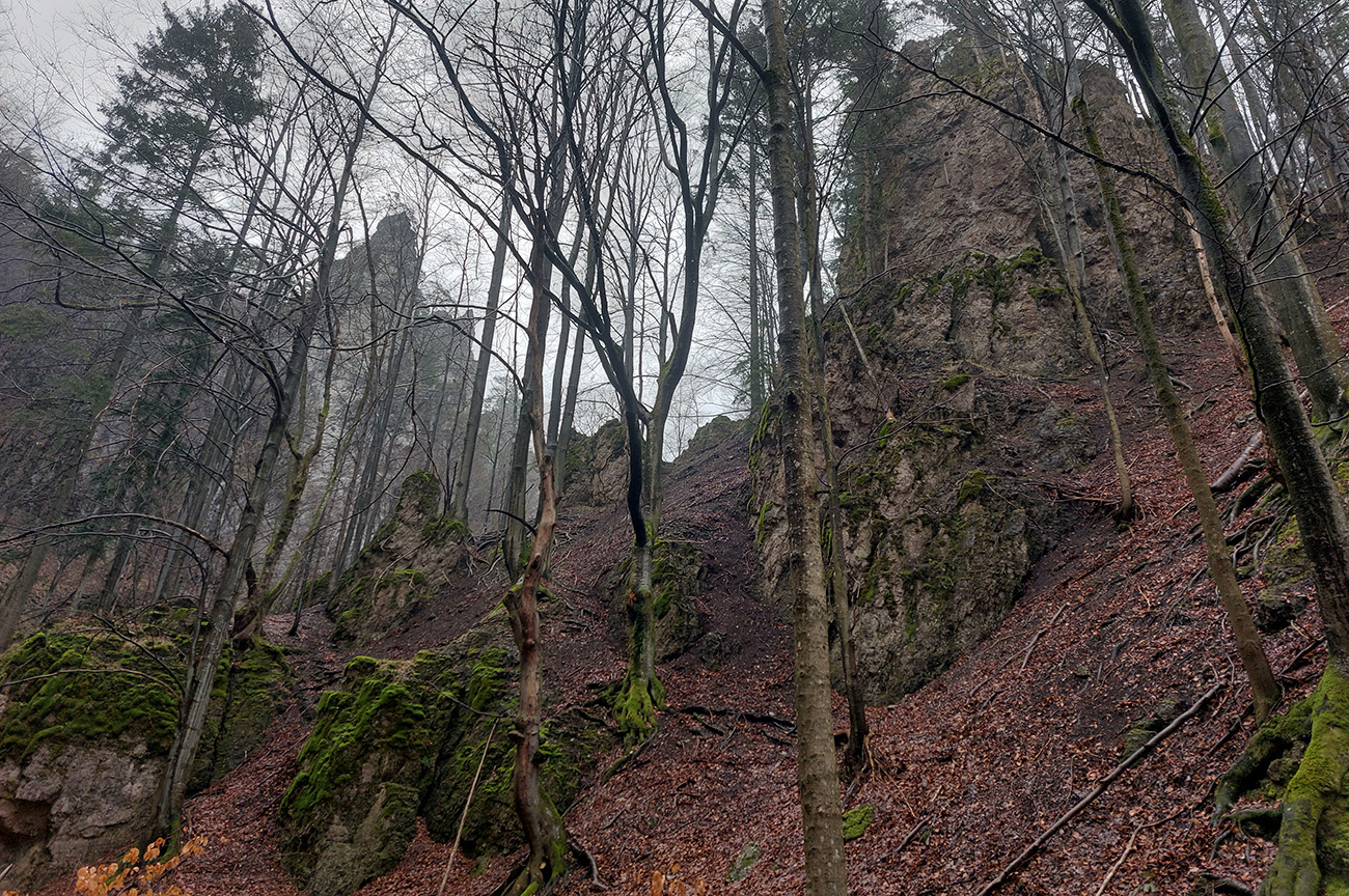 Pri ruinách pionierskeho tábora (či čo to bolo) hybaj doprava na modrú a Rožkovou dolinou (alebo Veľkou Skalnou) stále strmšie do Rakytovského sedla. Ale popod krásne zostavy veží, brál a skalných stien. Až hlavu ide vykĺbiť, len mi pri tom do očí prší. Zase. Vietor aktuálne do doliny naukladal aj zopár serióznych preliezačiek, tak o zábavu postarané.