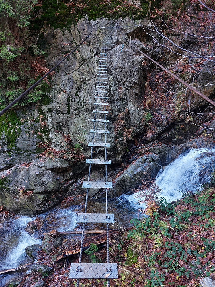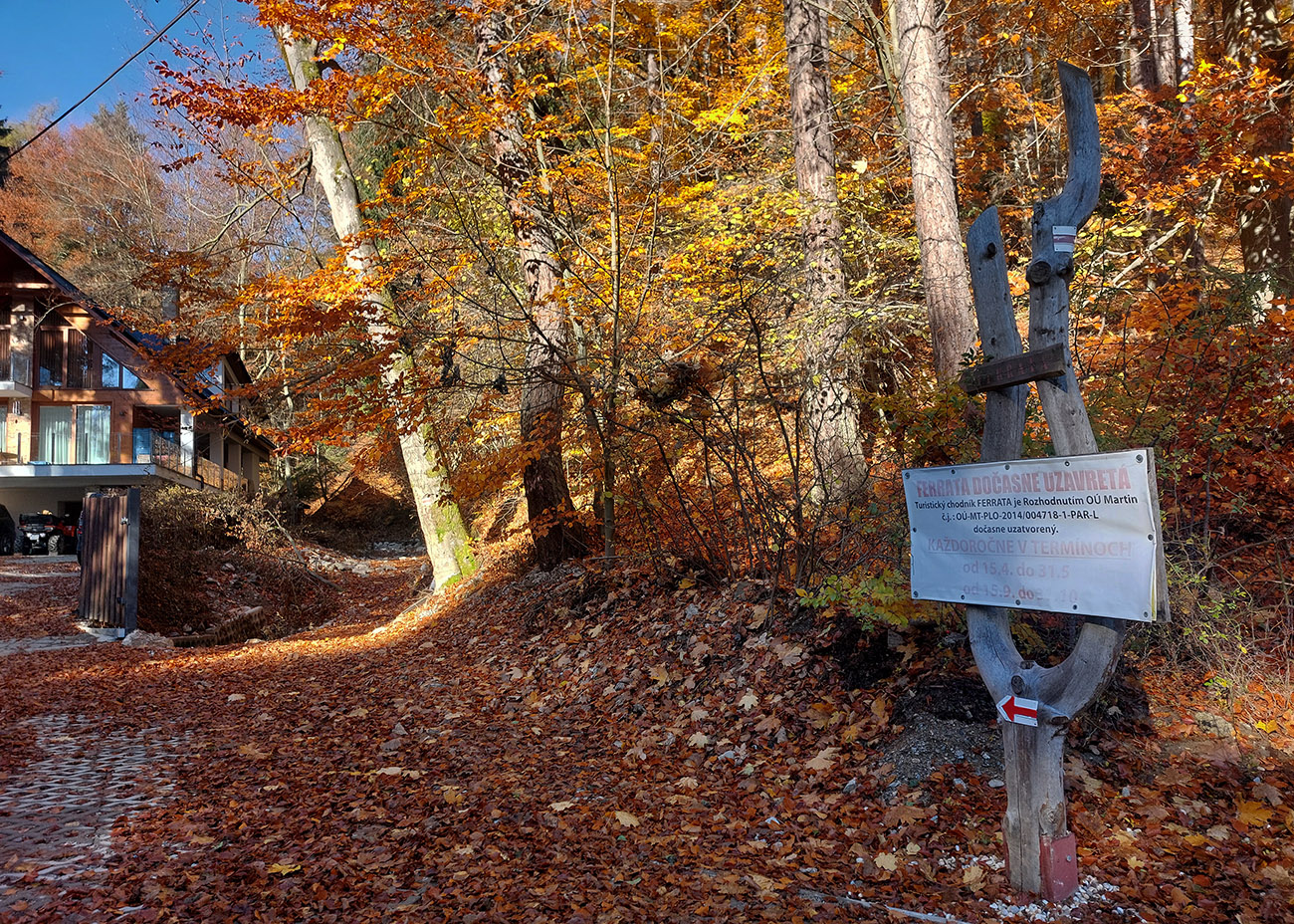 Napríklad niektoré pôvodné drevené mostíky dávno doslúžili, dnes sú všetky hliníkové. Aj technické prvky boli na niektorých miestach nahradené a niekde aj trochu posunuté. Takže vychutnajte si fotečky z celej, vynovenej, opravenej a hlavne miestami aj jesenne plnofarebnej feratky, najstaršej na Slovensku. Popisy som pod fotky moc nedával, len tam, kam treba, žeby bolo všetko jasné :-) Šťastnú cestu!