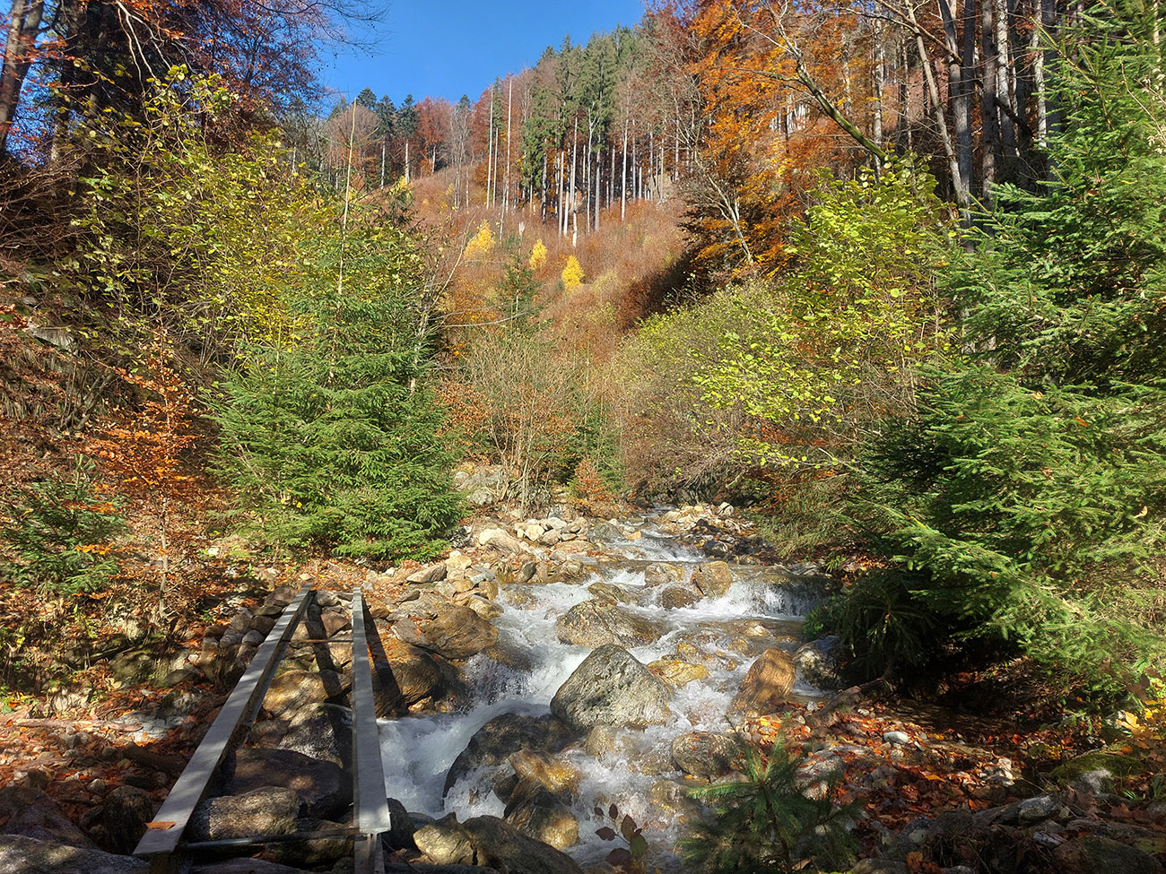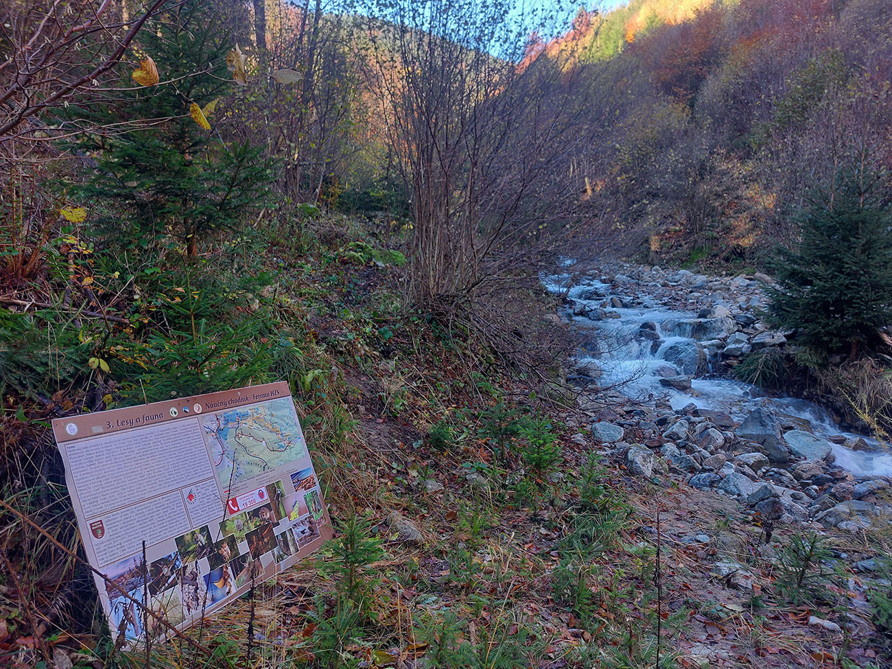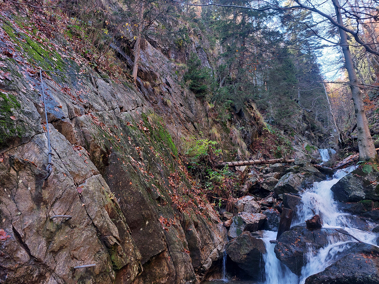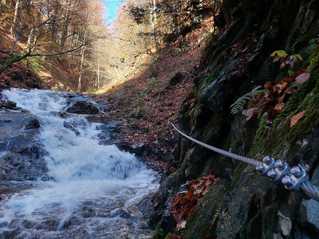 Po silných búrkach v polovici septembra sa Mlynskou dolinou a jej Pivovarským potokom prehnala blesková povodeň a trochu to tam „upratala“. Potok si na pár miestach preložil koryto, najmä v spodnej časti červeno značeného chodníka, hneď nad chatami. Aj parkovisko trochu „upravil“ a pobabral pár kusov vybavenia ferraty. Bežala zbierka na Donio.sk a jesennú sezónnu uzáveru využili dobrovoľníci na pár nevyhnutných opráv a aj úprav chodníka. Potom už jelene doručali, tak od 1.11. je ferrata otvorená znovu, je komfortne priechodná v celej dĺžke: niečo vyše štyroch kilometrov a 750 výškových metrov. Viac údajov škoda dávať, všetko je na STRÁNKE ferraty, a aj tak to tam už všetci poznajú :-) Jesenné usmoklené počasie sa ale pred dušičkovým víkendom konečne umúdrilo a nechalo prírode naplno sa vyfarbiť, no nechoď tam...
