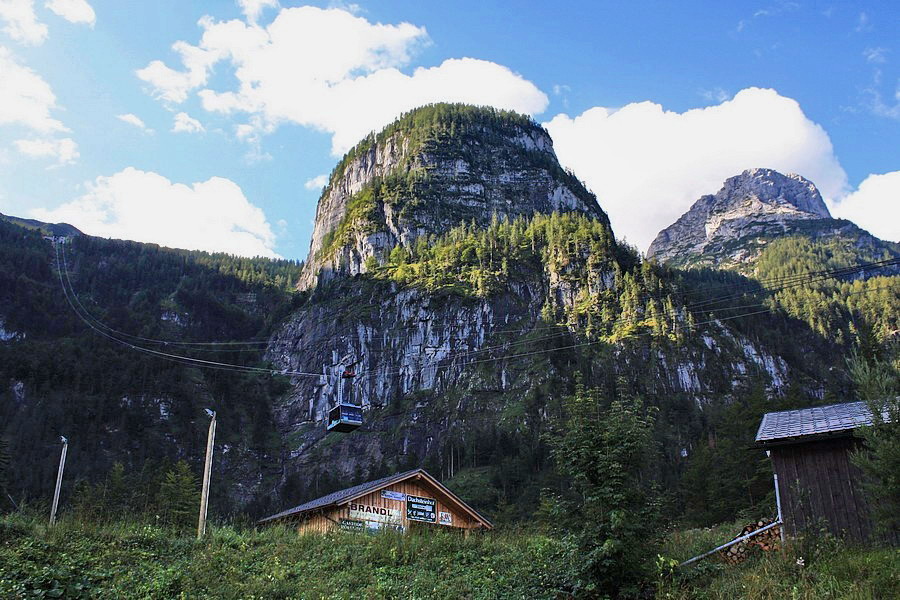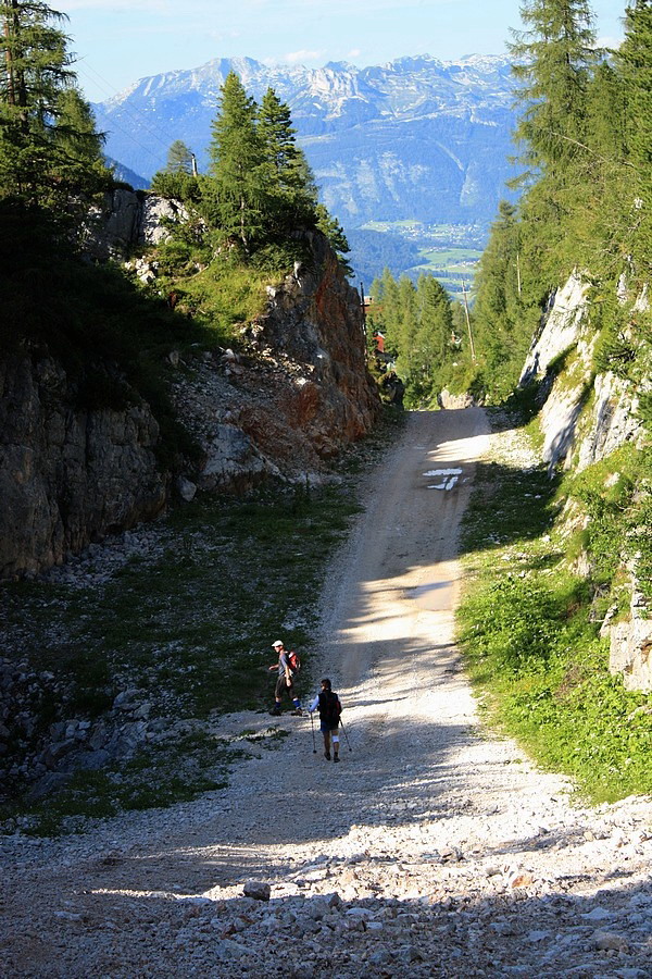 Naše dobývanie Krippensteinu začína aj končí v Obertraune, malebnej dedinke na brehoch Hallstattského jazera. Auto nechávame na parkovisku pri stanici lanovky. Pri pohľade na svahy, ktorými sa máme podľa mapy štverať, začínam pochybovať o niektorých fyzikálnych zákonoch. Chodník štartuje pekne zostra a serpentínami sa škriabe stále vyššie. Vedie väčšinou lesom, len občas spestrí cestu nejaký ten čiastkový výhľad do doliny, krátky tunel v skale alebo vodopád potoka Miesenbach. Asi po dvoch hodinách prichádzame k medzistanici lanovky Schönbergalm. V jej okolí sa nachádzajú dve známe jaskyne, ktoré sa (vraj) oplatí vidieť: Eishöhle a Mammuthöhle.