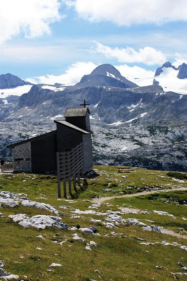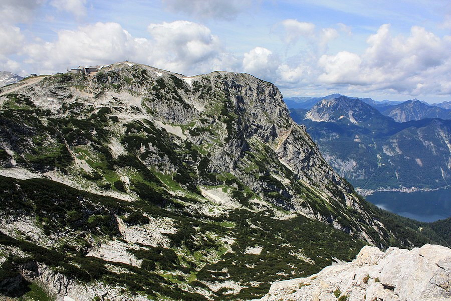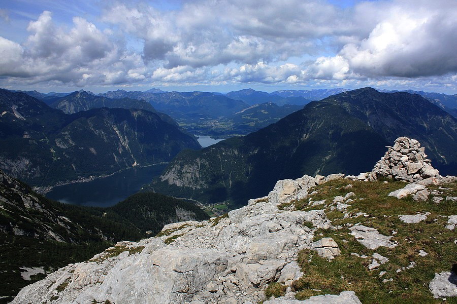Aj odtiaľto ďalej sa dá vyviezť lanovkou, my však viac dôverujeme vlastným nohám. Terén už nie je taký strmý, aj výhľadov stále pribúda. Najviac pohľadov na seba priťahuje súmerný vŕšok po ľavej strane. Na jeho vrchole vidieť kríž. Podľa mapy je to Däumelkogel a hoci je neznačený a mimo našej trasy, rozhodneme sa ho pokoriť. Výškou len o kúsok prevyšuje hranicu 2000 m, ale kruhový výhľad je odtiaľ božský. Rozoznávame Dachstein, Krippenstein, Plassen aj Hallstattské jazero. Ostatné kopce nepoznáme, takú kapacitu naša mozgová kôra nemá.