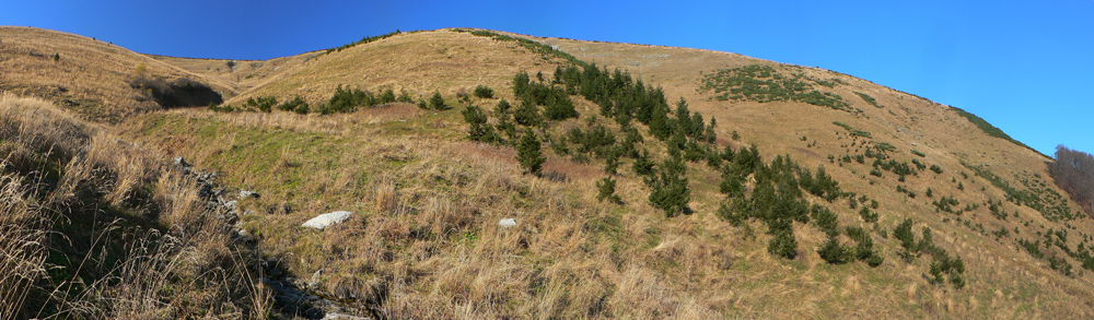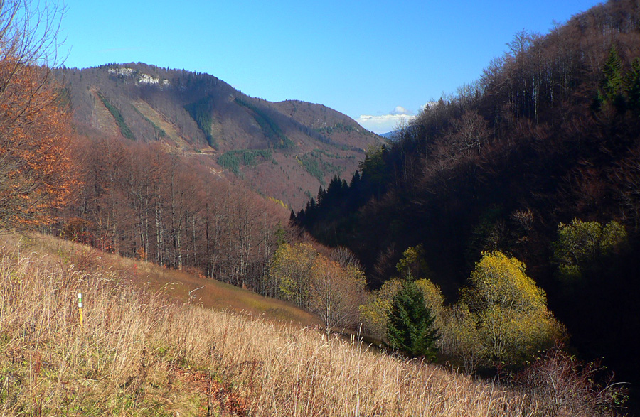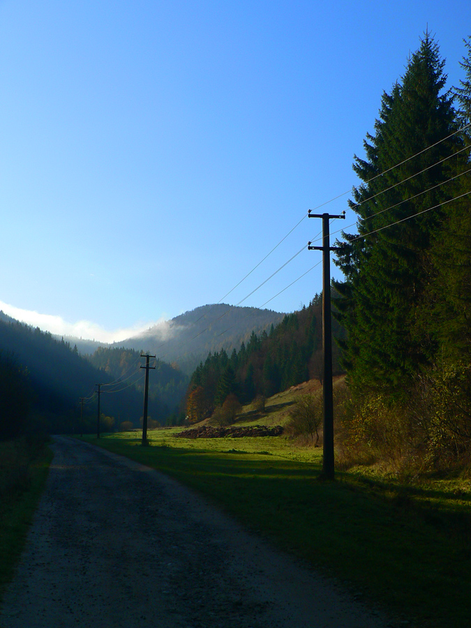 Najskôr síce len rúbanisko, ale potom už lúky okolo Motyčskej hole s výhľadmi na mliečne more na Donovaloch. Pripomína to kráter sopky pred erupciou, z hmly sa totiž nesie poriadny hukot hlavnej cesty a hladina sa hýbe vo vlnách - ako jazero lávy. Hrebeň „krátera“ tvoria Motyčská hoľa, kde sedím na okraji lúky, Zvolen, Prašivá, Kozí chrbát a Kečka. Len na juhozápad je „sopka“ otvorená, ale to mi zakrývajú stromy. Dole musí byť hnusne, veď si to večer vychutnám... Ale tu je ticho a teplúčko v zapadajúcom slnku.