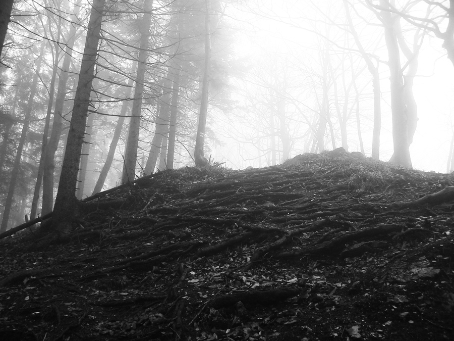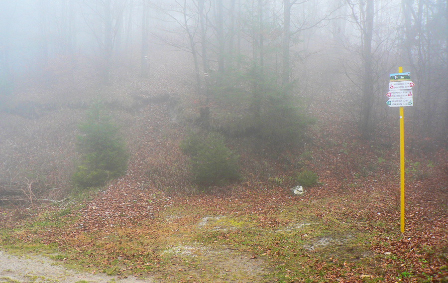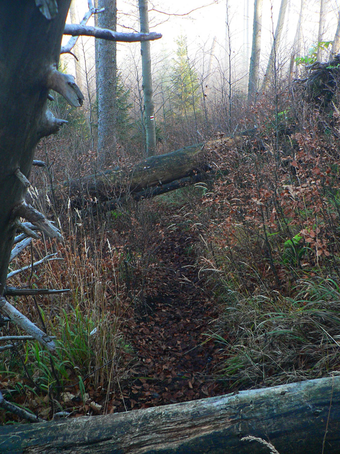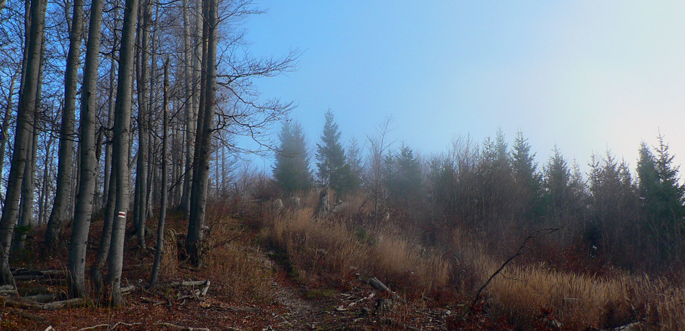 V Rybovskom sedle som takto asi o 2 hodiny, čaká ma asi polhodinka pochodu po holiach s výhľadmi a potom ponor do lesa, najmenej na dve hodiny. V mojom prípade aj do hmly, ktorá sa ako vodopád tlačí z Horehronia do Revúckej doliny. Aj s patričnými „efektami“: kým na holiach je sucho a teplo, v hmle fúka, zo stromov regulérne prší, zima zalieza za nechty. Podvedome zrýchľujem. Tretíkrát tadeto idem a zatiaľ som vždy zmokol :-)