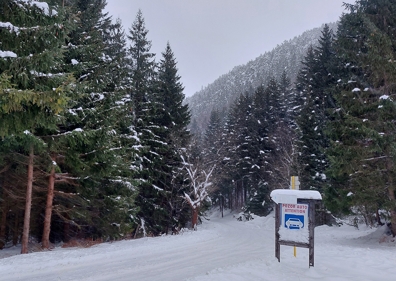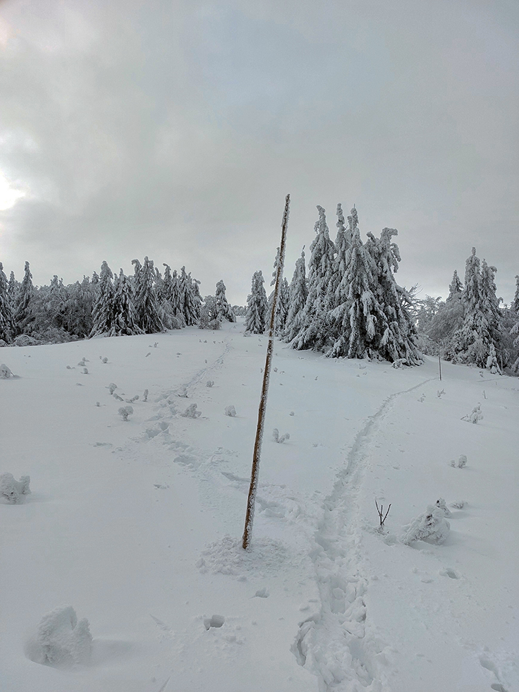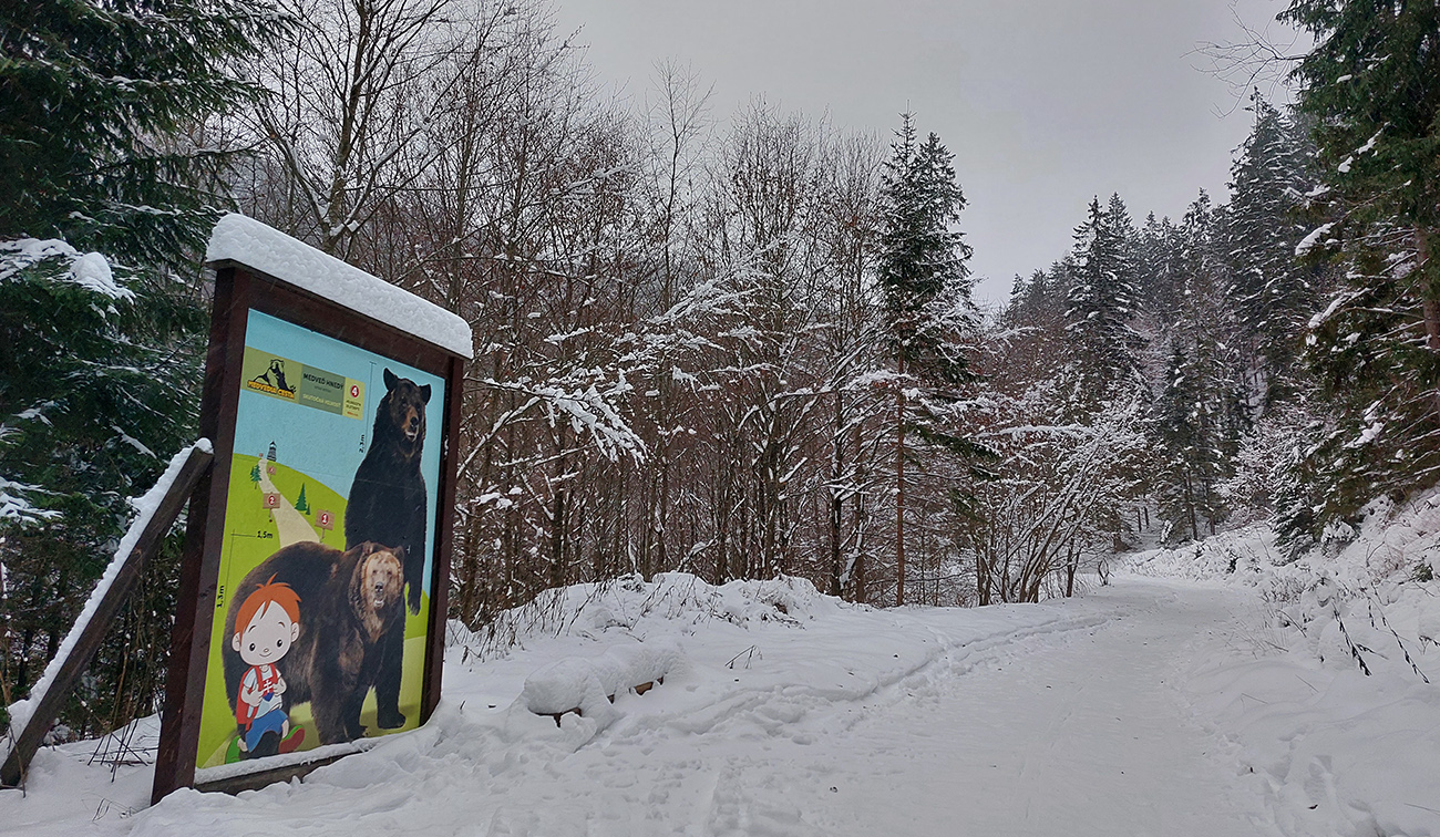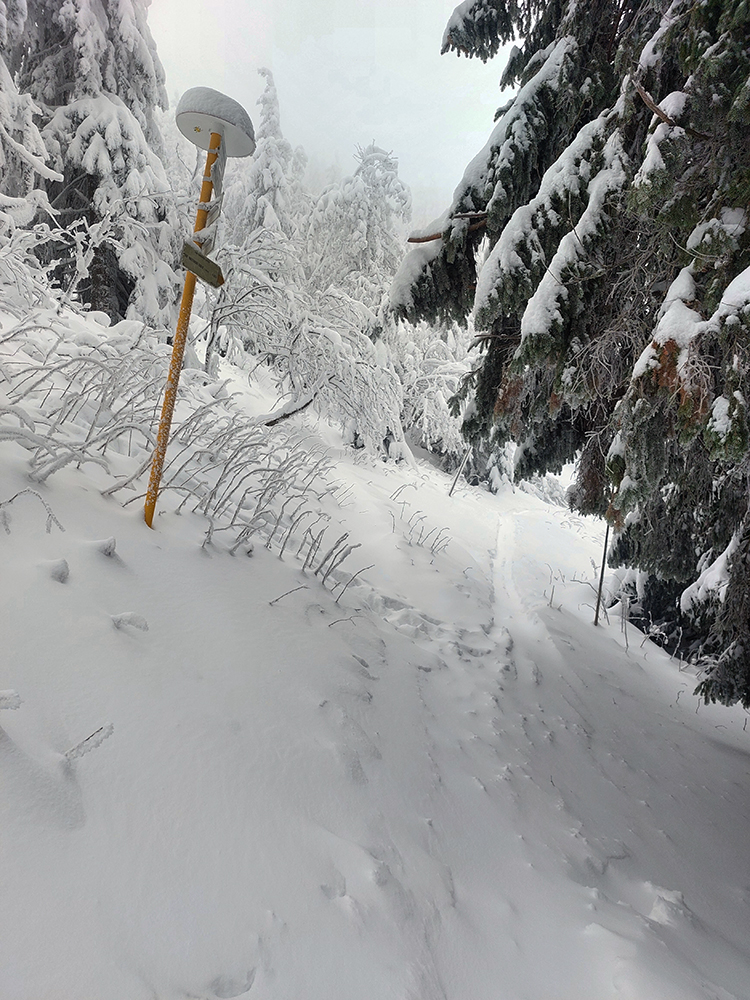 Potom už začala pravá zimná almázia. Medvedia cesta nádherná, štvrtkový odmäk a následné jemné prisneženie v kombinácii s mnohými nohami ju pekne vytvrdili - aj zjazd bude bezpečný pre sklznice. Okolo zimná rozprávka, čím vyššie, tým krajšia. Pri východe z lesa na Vlkolínske lúky pod Sidorovom obzretie doľava – zdalo sa, že zjazdiť by sa dalo aj po ceste. Stopa ďalej už ležala v hlbokej koľaji, hranica mrakov sa zhora blížila a jedinými farbami v okolí boli špičky šípiek na turistickom ukazovateli: