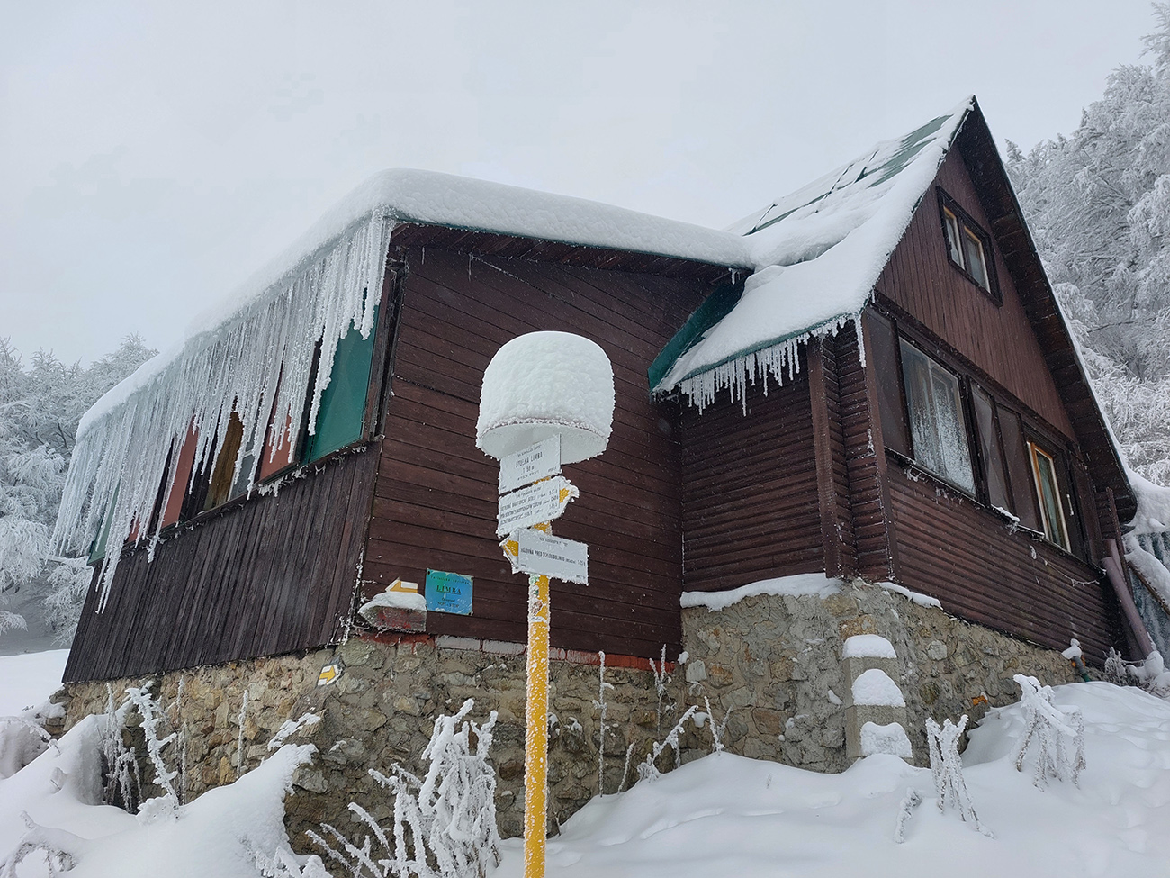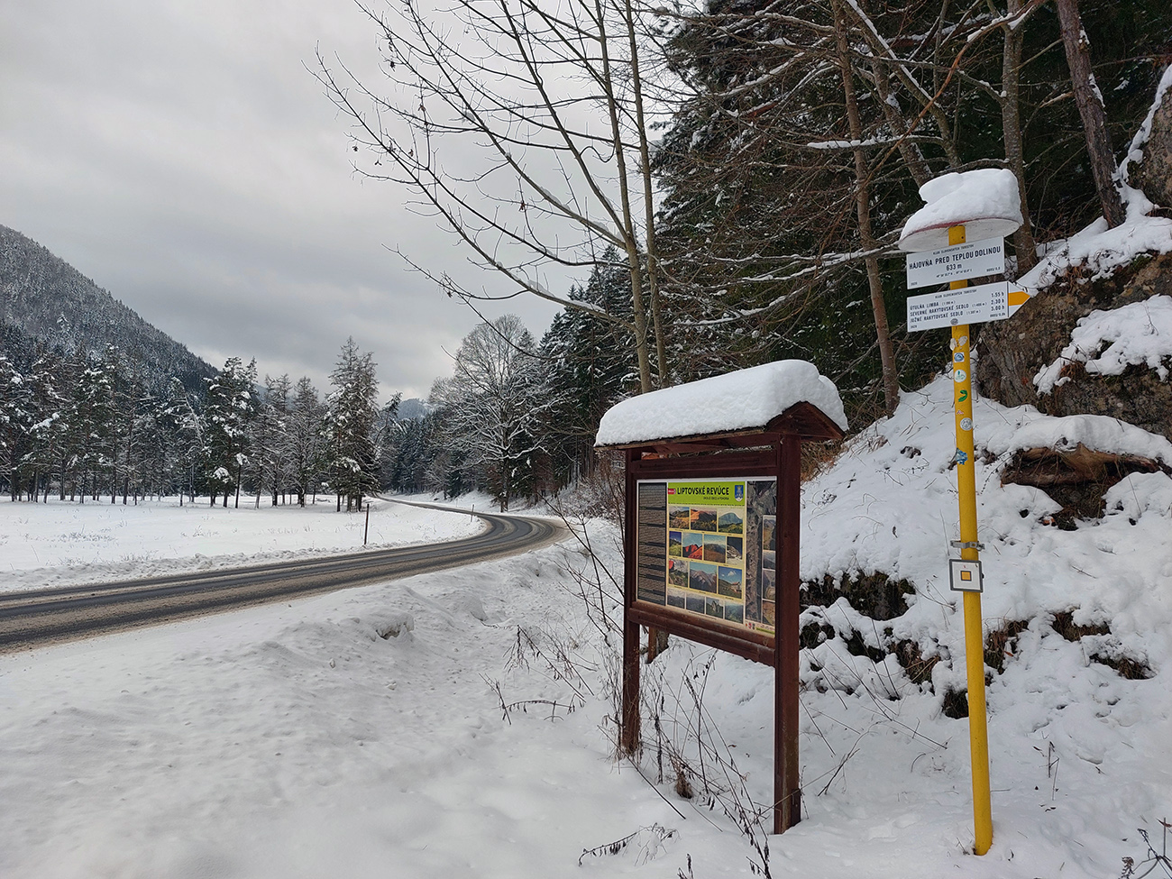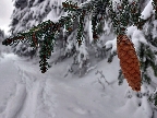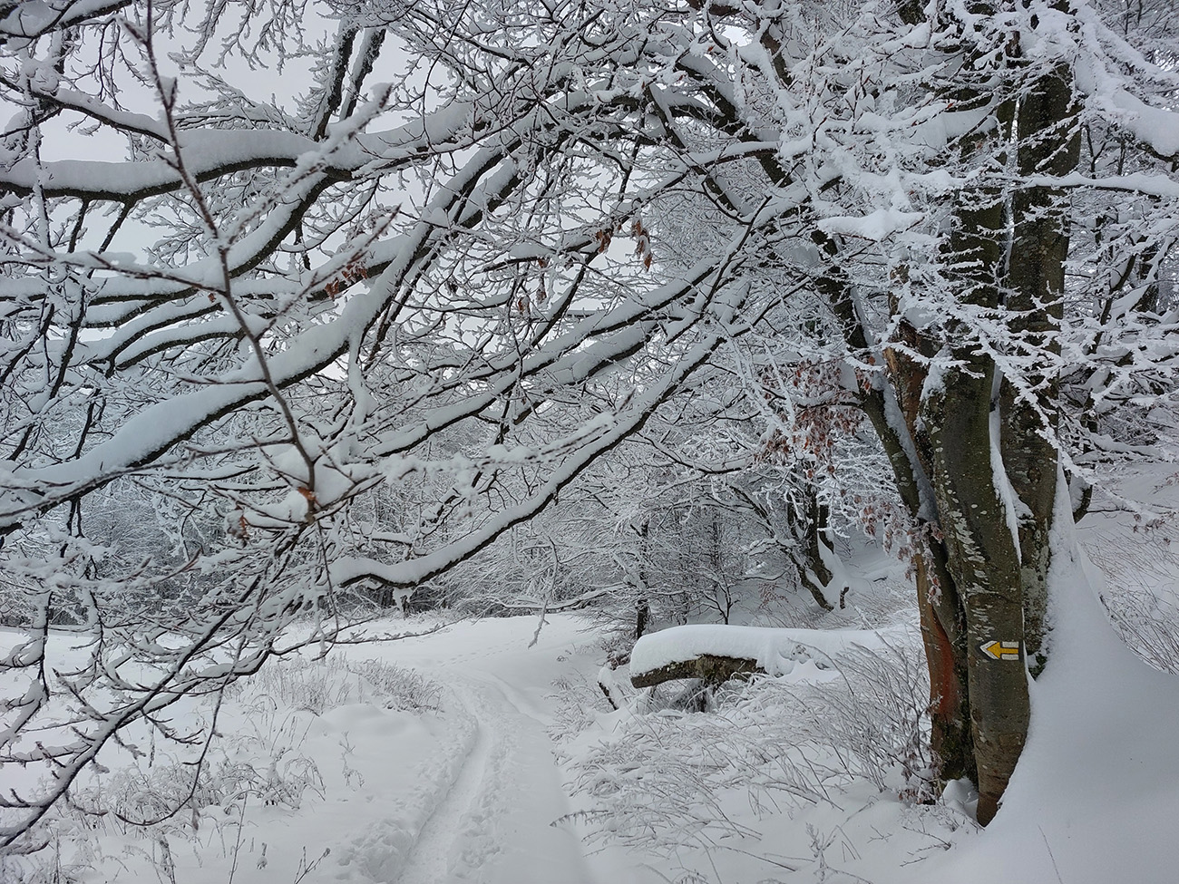Potom už začala pravá zimná almázia. Medvedia cesta nádherná, štvrtkový odmäk a následné jemné prisneženie v kombinácii s mnohými nohami ju pekne vytvrdili - aj zjazd bude bezpečný pre sklznice. Okolo zimná rozprávka, čím vyššie, tým krajšia. Pri východe z lesa na Vlkolínske lúky pod Sidorovom obzretie doľava – zdalo sa, že zjazdiť by sa dalo aj po ceste. Stopa ďalej už ležala v hlbokej koľaji, hranica mrakov sa zhora blížila a jedinými farbami v okolí boli špičky šípiek na turistickom ukazovateli: