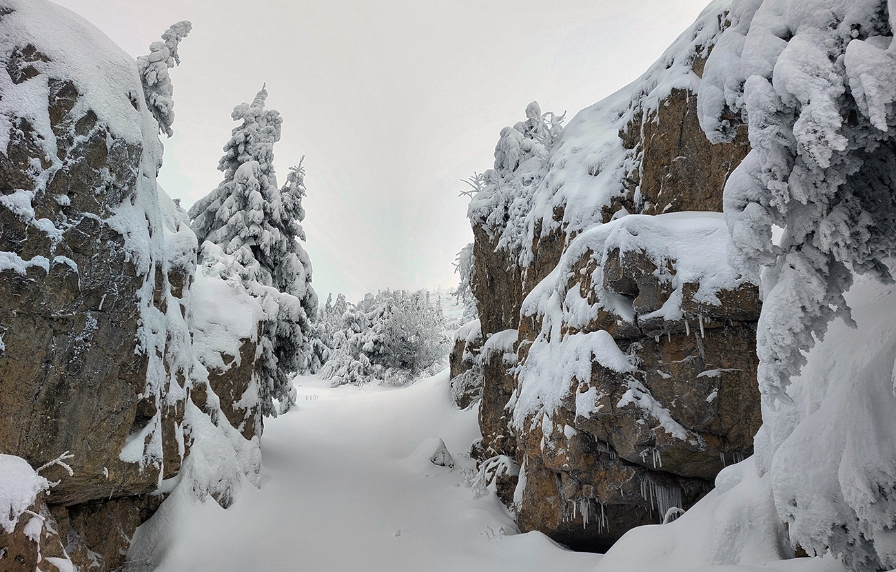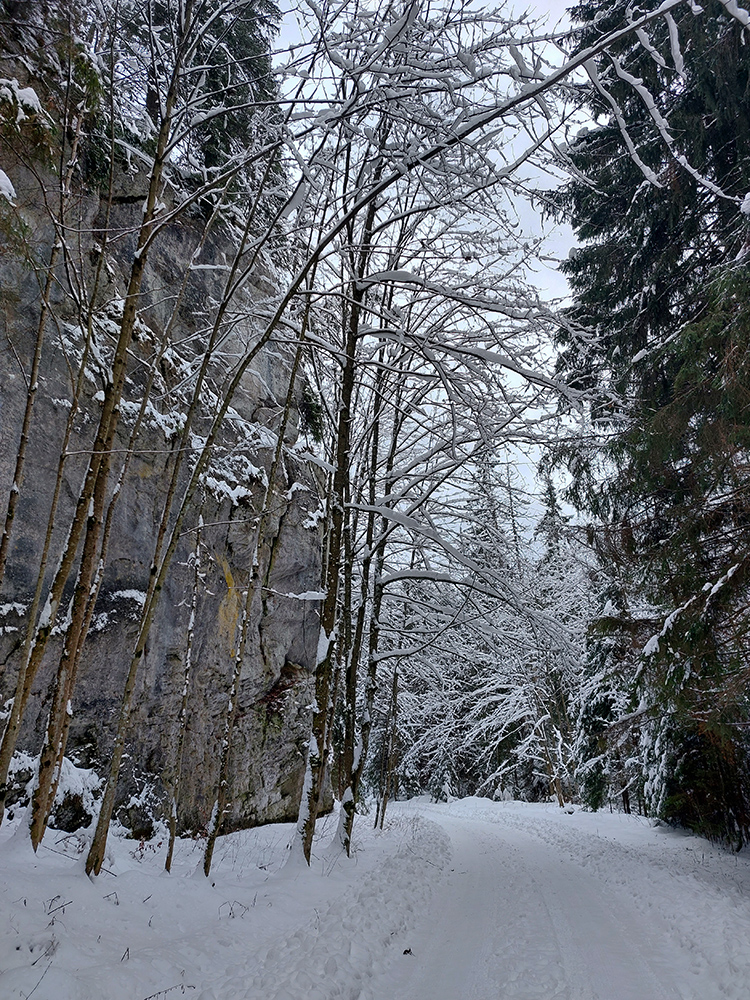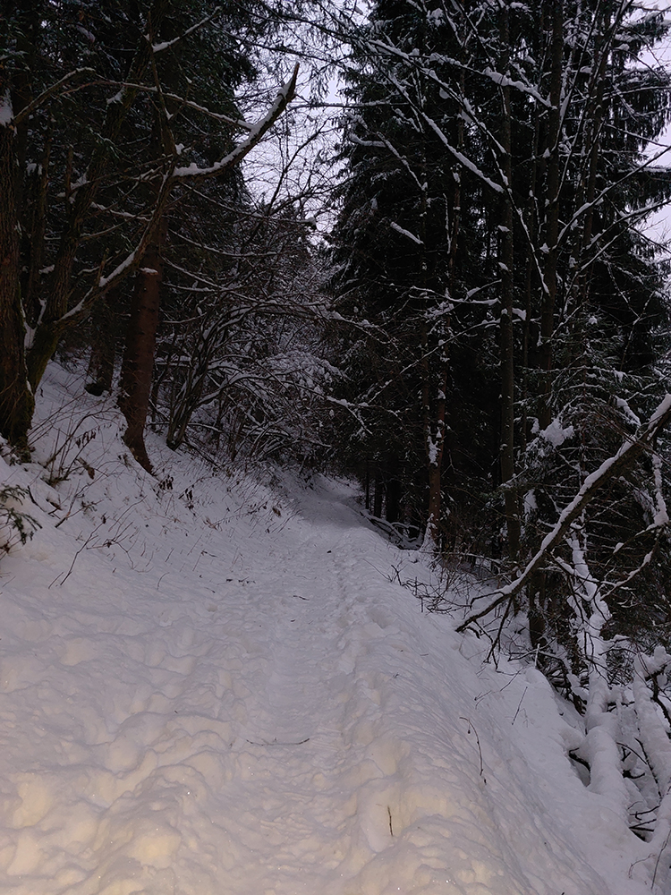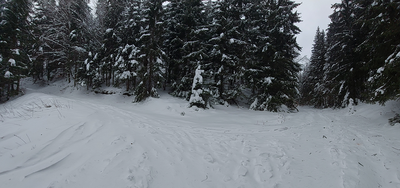 Dolina pod Mederlyčku jedna báseň. Jediný človek predo mnou to otočil niekde v polovici, tak ďalej už stopa viditeľná, ale jemne prisypaná, okolie ako z rozprávky, a tichúčko. Potiahol som rovno, že miernejšie sklonenou serpentínou sa potom vrátim.