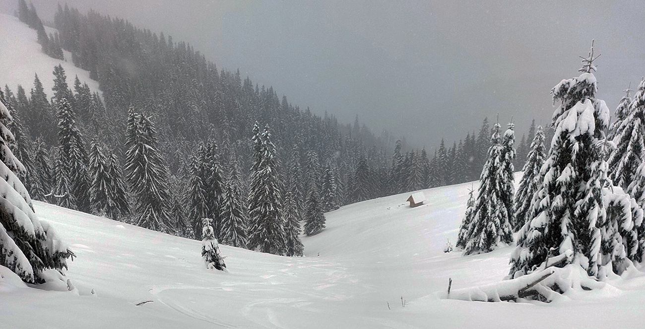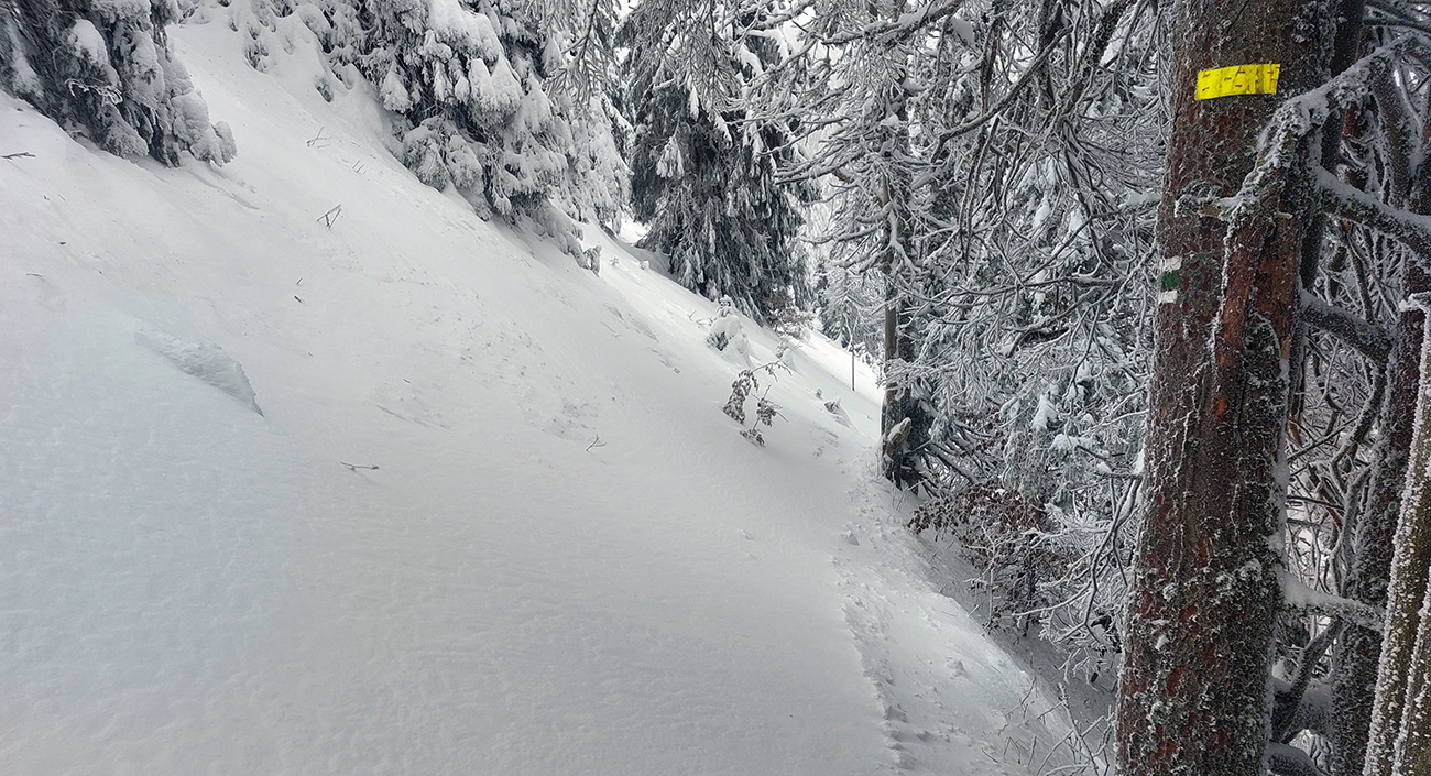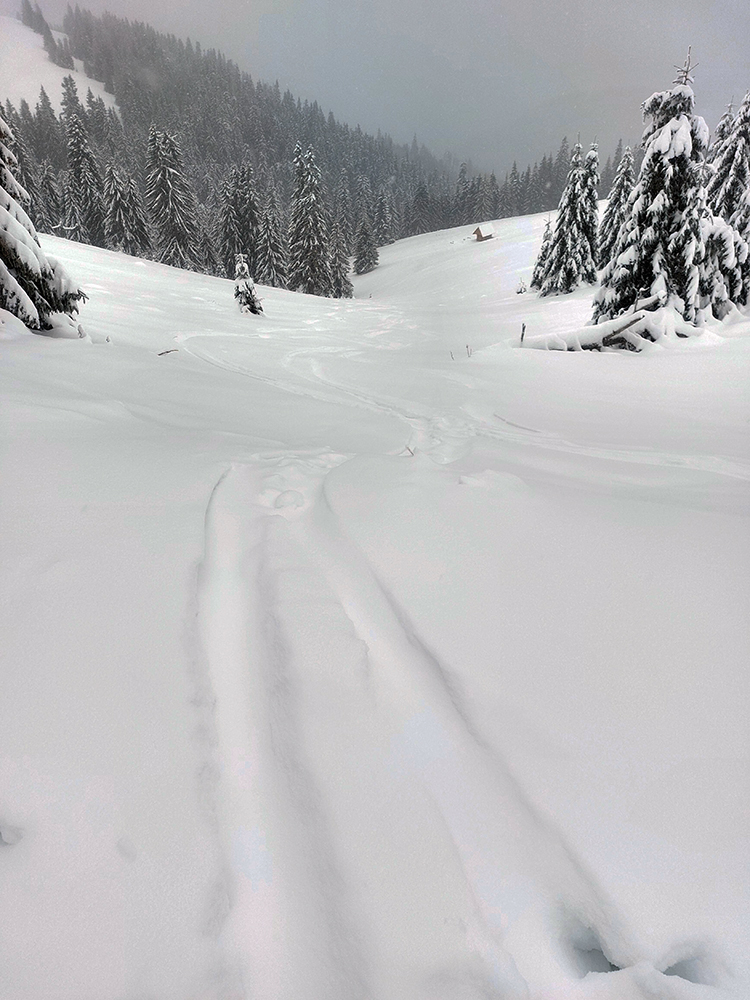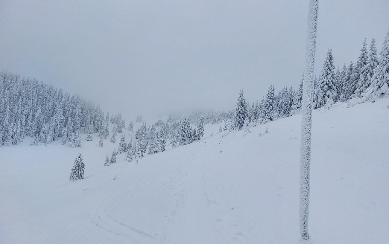 Okolo Šiprúňa klasické preveje, za nimi opatrný zošup do sedielka - na slepo, lebo v hmle. Stúpanie na Jánošíkovu kolkáreň ešte trochu úzke – ďalšie miesto, kde bude nutné zjazdovať cestou nazad opatrne. Na zasypaných lúkach nad rekreačným strediskom to niekoho náramne bavilo, brodiť sa v snehu a zapadávať po stehná. A kaziť stopu – lebo vedľa nej by vôbec nezapadal rovnako, že?