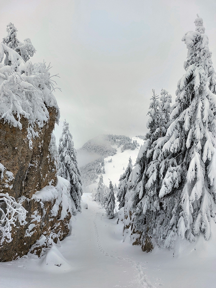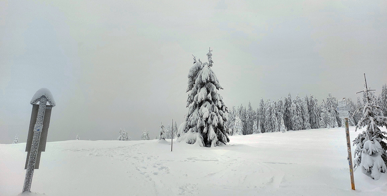 Pozor, toto nie je aktuál, toto je doják, ako sa veci môžu rýchlo zvrtnúť. Navyše spred viac ako týždňa – keď bola nedeľa, koniec začiatku zimy. Lebo ešte zimná rozprávka, ale popoludní už malo začať oteplenie. Deň sivý, nízko zamračený, ale bez vetra a v príjemných mínusových teplotách. Čiže výhľady žiadne, fotky tiež všetky na jedno kopyto, vo všetkých odtieňoch sivej, ale nevadilo. Urodil sa plán potrénovať „prechodové zručnosti“ na hrebeni Veľkej Fatry. Pohodlne, klasicky: od vlaku z Rybárpoľa pešibusom do Hrabova, odtiaľ na Smrekovicu (možno aj polievku druzgnem) a nazad. V známom prostredí, no čo už o tom napísať, že? Ale každý deň v prírode je iný a tento bol navyše mohutne improvizačný. Nakoniec to nebolo tam a nazad, ale jednosmerka. Len pred koncom výrazne „zauzlená“, ako by ukázal podrobnejší pohľad na záznam na Strave: