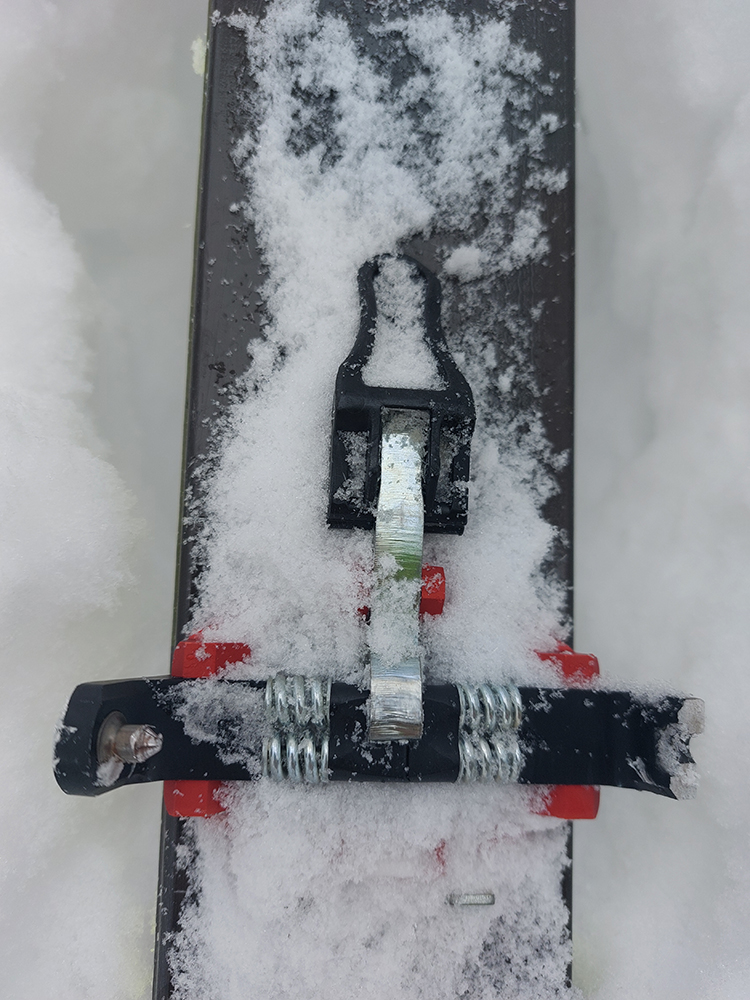 Zrazu pri jednom kroku podozrivo ľahká noha - pozriem dole a lyžu nemám. Čo to? Asi som o niečo pod snehom zavadil a vypla špička. Zacvaknem, ďalší krok a zase! To už som sa špičke bližšie prizrel a - do prdele!!! To čo som o tejto značke počúval a videl až moc často, stalo sa aj mne: odlomené jedno ramienko aj s pinom. Som dopásoval! Noooo, na jednej strane dobre, že nie niekde v strmom svahu pri zjazde, na strane druhej v tom najvajcovejšom snehu. Kam teraz?