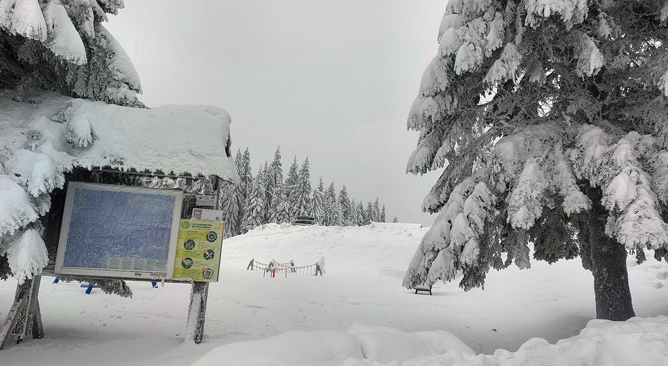 Pri lanovke ceduľa, že zákaz vstupu na zjazdovku, chodia tam ratraky. No, za rannej polotmy ešte nechodili, ale zúrivo tam syčali delá, rešpektoval som – a teda nastala ďalšia improvizácia: direkt hore popod lanovku, na Medvediu cestu. Už na pásoch, stopa komfortná, ale na cestu dole to práve tu nebude. To bude treba zbehnúť po svojich, pomedzi to všetko, čo okolo trčí spod snehu.
