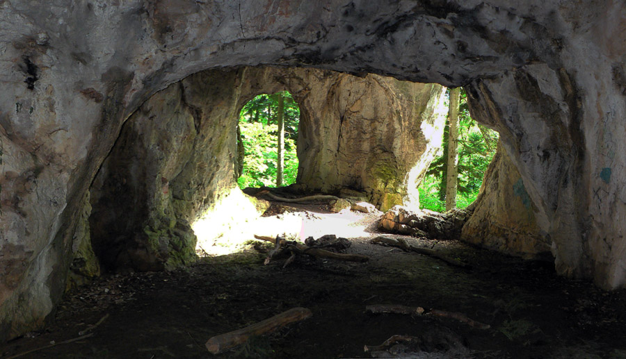 Rútim sa dolu kopcom z Panského Dielu, hlboko podo mnou sídlisko Sásová - Rudlová. Míňam strojovňu vleku a o chvíľu sa chodník ponorí do lesa. Najprv vedie po východnom svahu zalesneného Hrádku. Keď sa prehupne na západný svah a vyjde na malú, zarastajúcu lúku, treba si po pár metroch dobre všimnúť nenápadnú, ale od roku 2012 už oficiálne označenú odbočku prudko doprava, po vrstevnici. Tá po pár sto metroch prichádza nad zráz nad dvojicou jaskýň. Kaplnka je vyššia, Netopieria hlbšia (44m) a krajšie vyzdobená (aj visiacimi netopiermi). Pred tou druhou je aj tabuľka s nákresom jej pôdorysu: z hlavnej chodby, zakončenej Galériou a Kancľom, sa odpája kratšia Partizánska sieň. Bralo s jaskyňami je prírodnou pamiatkou, ale od roku 2008 s povoleným vstupom. Jaskyne majú bohatú a archeológmi doloženú minulosť, už v praveku sa tu žúrovalo. Našli sa tu pozostatky keramiky zo 4. storočia, bronzové nástroje lužickej kultúry spred 3000 rokov aj zvyšky ľudských obetí. Nálezy z mladšej a neskorej doby bronzovej súvisia s hradiskom, ktoré stálo na Hrádku. Podľa bordelu naokolo sú jaskyne aj dnes miestom opiášov a zvyšky jedla samozrejme lákajú všelijakú „dzivú zver“, takže pozor! V zime je na dne oboch jaskýň bohatá ľadovo-stalagmitová výzdoba. Po prieskume sa odtiaľto netreba vracať nazad na značku, ale neodporúčam. Nenápadný chodník vedie síce od jaskýň aj smerom dolu - do Sásovskej doliny, ale cez zaváľané rúbane, žihľavu a lopúchy. Napája sa na traverz, ktorý z horného konca doliny (z asfaltky) vedie lesom popod jaskyne na lúky nad Sásovou a tam sa napája na modrú turistickú značku. Presne na tú, ktorú som pri zostupe z Panského Dielu opustil smerom k jaskyniam.