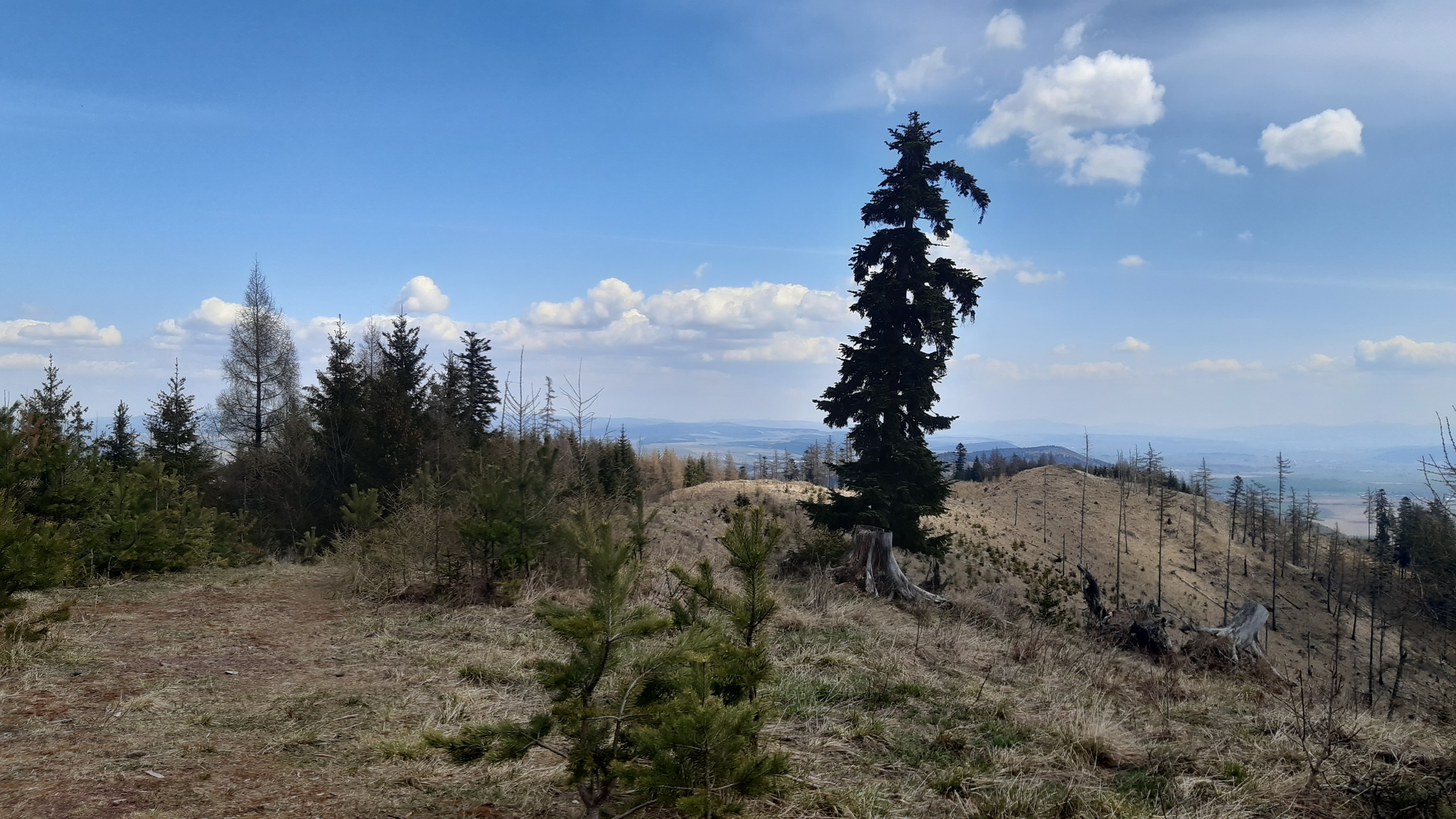 Miestami už stromčekami zarastajúca hrebeňová cesta končíe až na Krížovom vrchu. S dvojkrížom čuduj sa svete. Výhľady stále zajebisté, len my, čo tu chodíme už roky badáme ako mladina naberá na výške. Vy čo by ste chceli ešte zažiť výhľady na Tatry v plnej paráde tak máte ešte pár rokov a potom na nejaký čas bude zase šmitec. Bude treba čakať na ďalšiu kalamitu a to môže trvať. Nové lesy už budú viac premiešané ako tie minulé a tak verím, že aj odolnejšie.