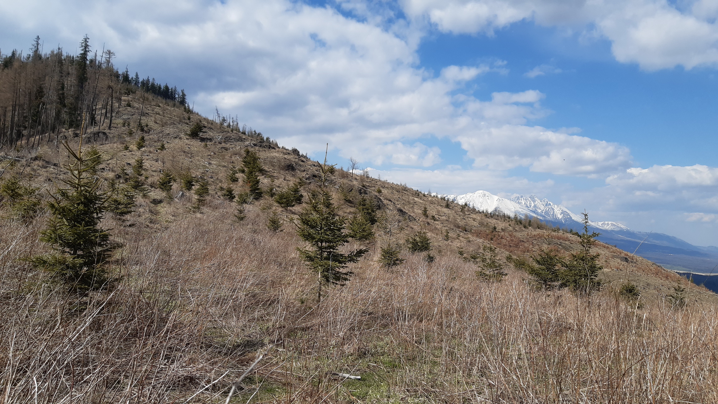 Lesných ciest je tu pomerne dosť. Pred pár rokmi túto oblasť postihla silná veterná kalamita ako už ináč následovaná kôrovcom... Trošku sa to tu presvetlilo a po harvestoroch ťahajúcich drevo ostali ťažobné linky vedúce po spádniciach. Jednou takouto pokračujeme aj v našej túre. Vedie nevýrazným hrebeňom, už je poznačená eróziou a dovedie nás na postupne zmierňujúci sa hrebeň. Ním už vedie krásna lesná cesta s parádnymi výhľadmi na Vysoké Tatry a rovnako na ľavej strane aj na Kráľovú hoľu.