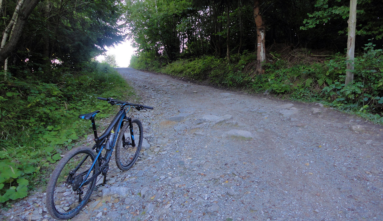 Za poslednými domami Šútova to začne: prvé poriadne stúpanie (po turistickej zelenej) a sranda je tá, že čím vyššie, tým lepší povrch. Nad dedinou hnusný voľný makadam (na ňom jeden z najstrmších úsekov trasy), vyššie na lúke šutrohlina, pod Zajacovou rozbitý asfalt a nad ňou NOVÝ asfalt. Lebo sme vstúpili do národného lunaparku. Z konca asfaltu potom len dákych 100 metrov prudšej kamenistej cesty a sme pri prvom podarenom vtipe: