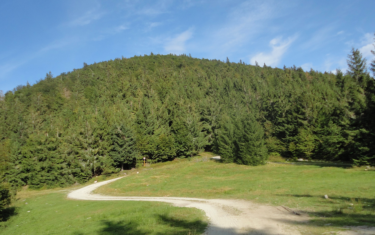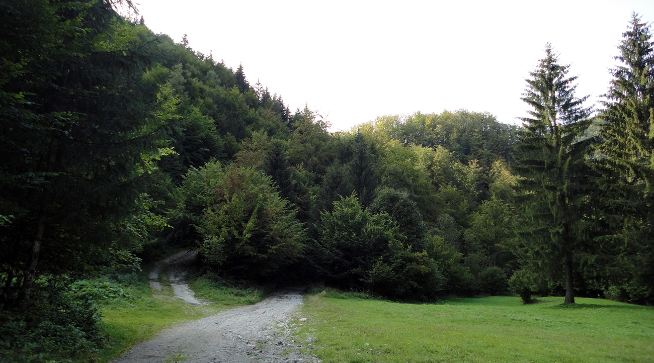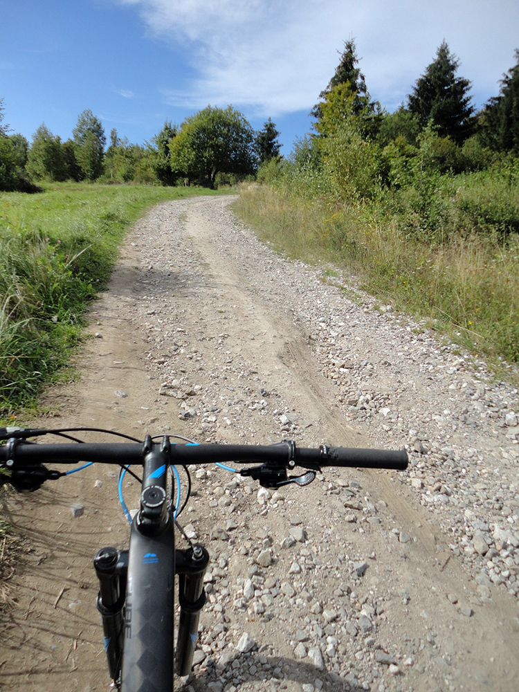 Ďalšia úloha je trafiť na rázcestie Drgová a tam preťať modrú značku (zo Sučian na Malý Kriváň). Najskôr jemne líznem podhorské lúky nad Trusalovou, stúpam zase po asfaltke. Pred jej koncom výrazná odbočka doľava do lesa. Spočiatku je lesná cesta široká, ale staršia, takže pekná, potom pribudnú rúbaniská. Ale aj výhľady dole do podhoria, napríklad na vojenskú strelnicu nad Sučanmi. Asi dve tretiny výšľap a posledná zjazd. Len pred koncom výšľapu sa treba poriadnejšie priprieť (strmo je tam a rozbito) - asi pol kilometra, ale jazditeľné všetko.