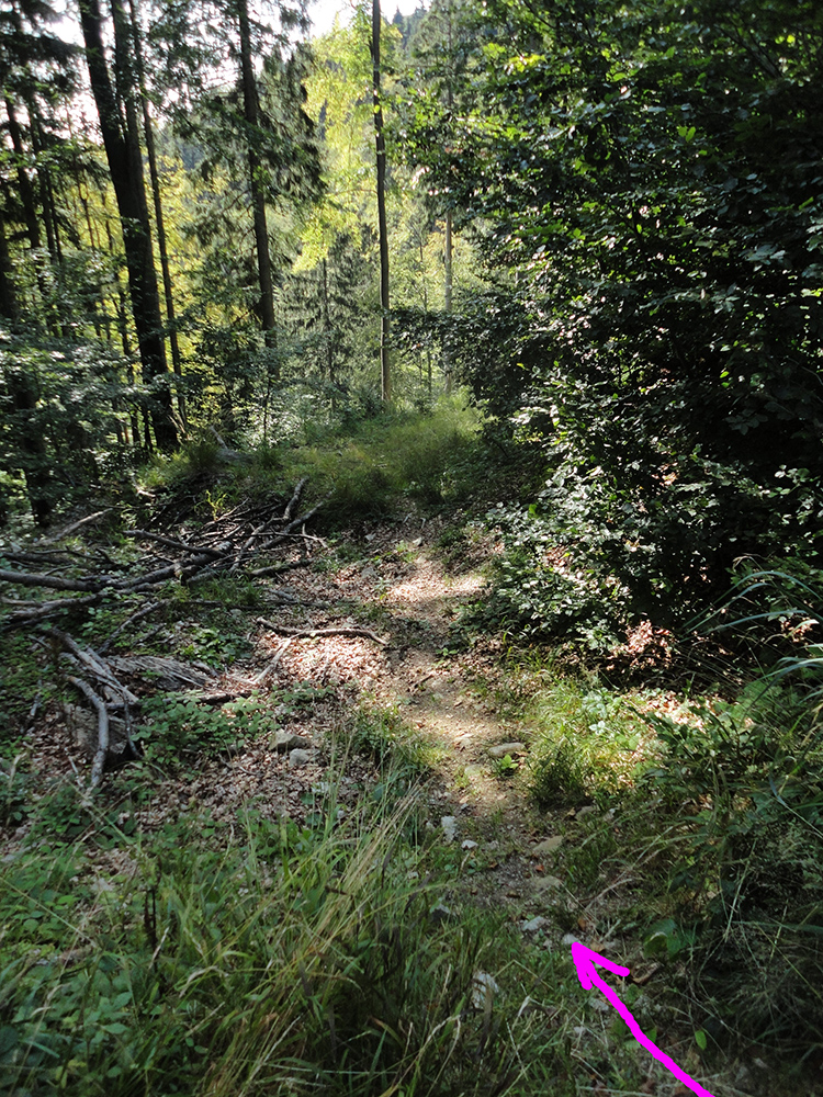 Tentokrát ale nejdem dole dolinou, ale cez mostík do protisvahu, do ďalšieho stúpania. Ako inak, po zvážnici - smerom na juh, ponad dolinu. Mierne. Cestou je jediná výrazná križovatka, z ktorej sa dá tiež zbehnúť do Sučianskej doliny. To by som šiel rovno - ale teraz idem doprava (jediná možnosť do kopca), obtáčam kopec Vinicko z juhu. Cesta postupne pod kolesami zarastá, ako sa blíži ku svojmu koncu. Ten nastáva asi po dvoch kilákoch - a tu je to najmenej dokonalé „prepojenie“ na trase. Vpredu kríky a vybagrovaná jama, ale zjazdný chodník vidno - po jej okraji vedie „za roh“. Hádam len zo 10 metrov, a tam zrazu ďalšia, novučičká zvážnica. Čiže poriadne hnusná, hrboľatá, ešte nezarastená a s poriadne odrúbanými svahmi. Strmo klesá, serpentínou obchádza záver Kľačianskej doliny. Potom ponad „lyžiarsku chatu“ na lúke križuje zelenú značku a napája sa na cestu z Kľačian na chatu pod Kľačianskou Magurou. Asi v jej polovici.