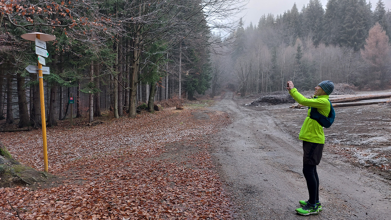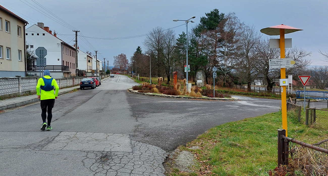 Do Krpelian je to stále príjemné, po tráve, po hrádzi. Potom asfalty preložené krátkym cezpoľným behom, lebo cesta cez oranisko nad Ratkovom tentokrát nie je veľmi presvedčivo vyjazdená. Dočasne sa nám trochu ťažšie dvíhajú nohy, ale na lúke pred Šútovom to opadá. V Krpeľanoch Nová krčma zavretá, v Šútove Stará krčma tiež, tak nestojíme, aj keď „nemáme zpoždění“. Za poslednými domami Šútova nakluskávame do asi najprudšieho úseku celej trasy, čo je ale vlastne nepodstatné, lebo je to len krátka časť cesty. Potom už lúky nad dedinou, napojenie na asfaltku z Trusalovej a povinné fotenie smerovníka na Zajacovej. Vchádzame do NP a chystáme sa spáchať strašný zločin, lebo odteraz takmer až do konca pôjdeme mimo značených chodníkov. Snáď nás na tých zvážniciach žiadne auto nezrazí.