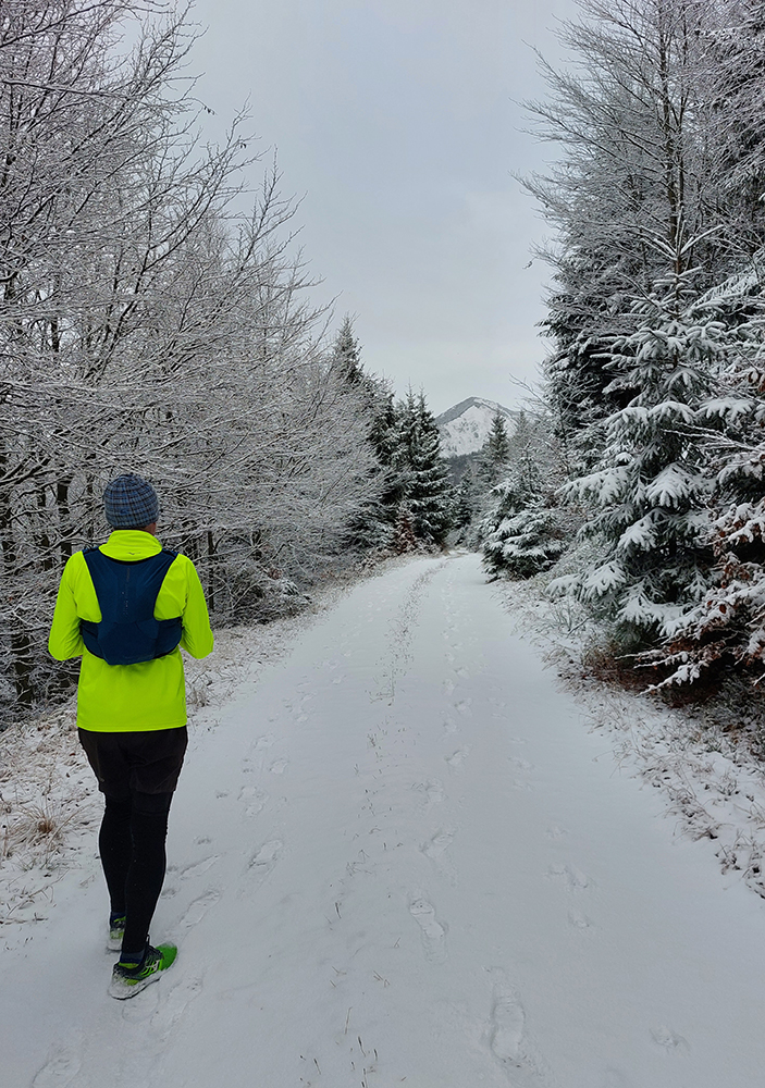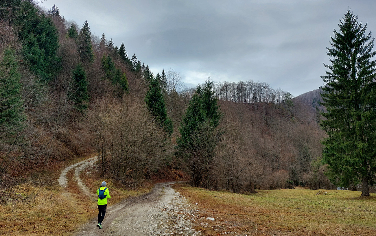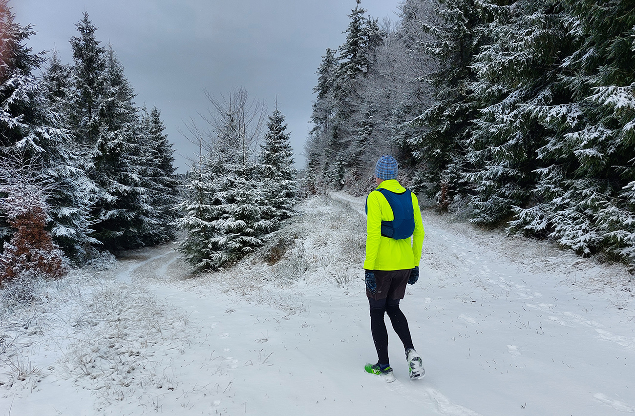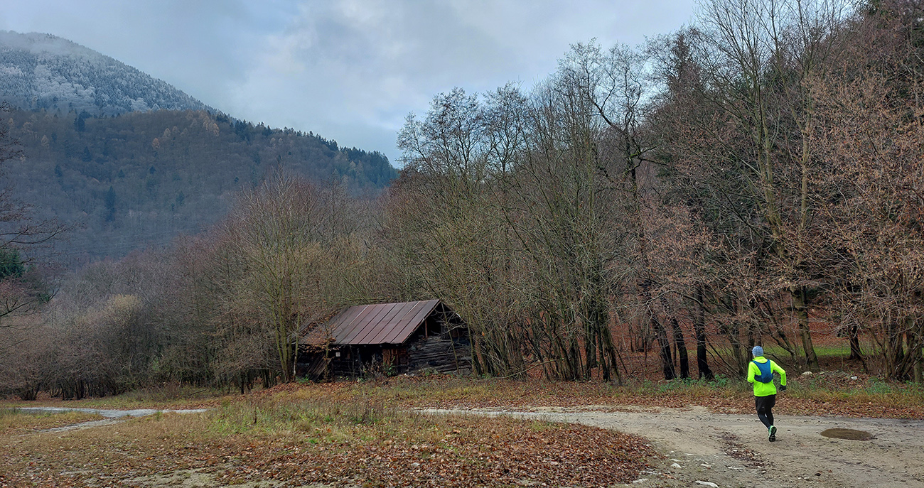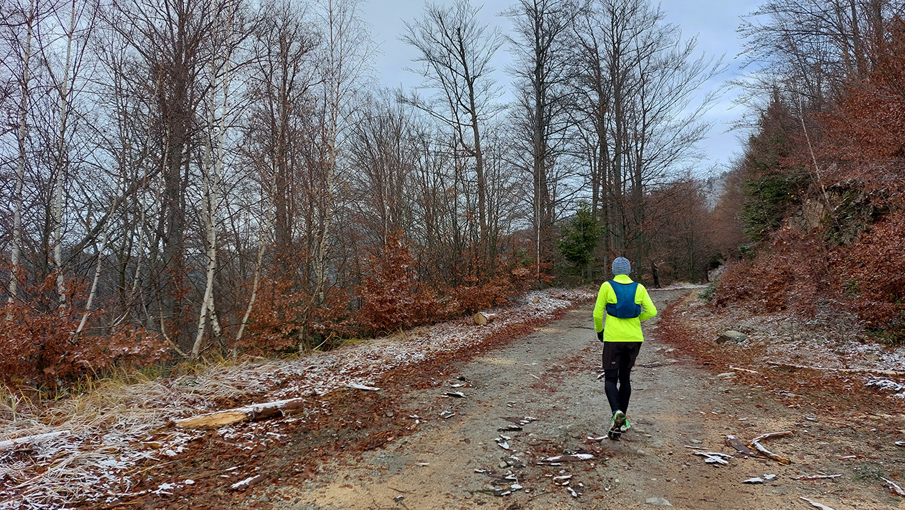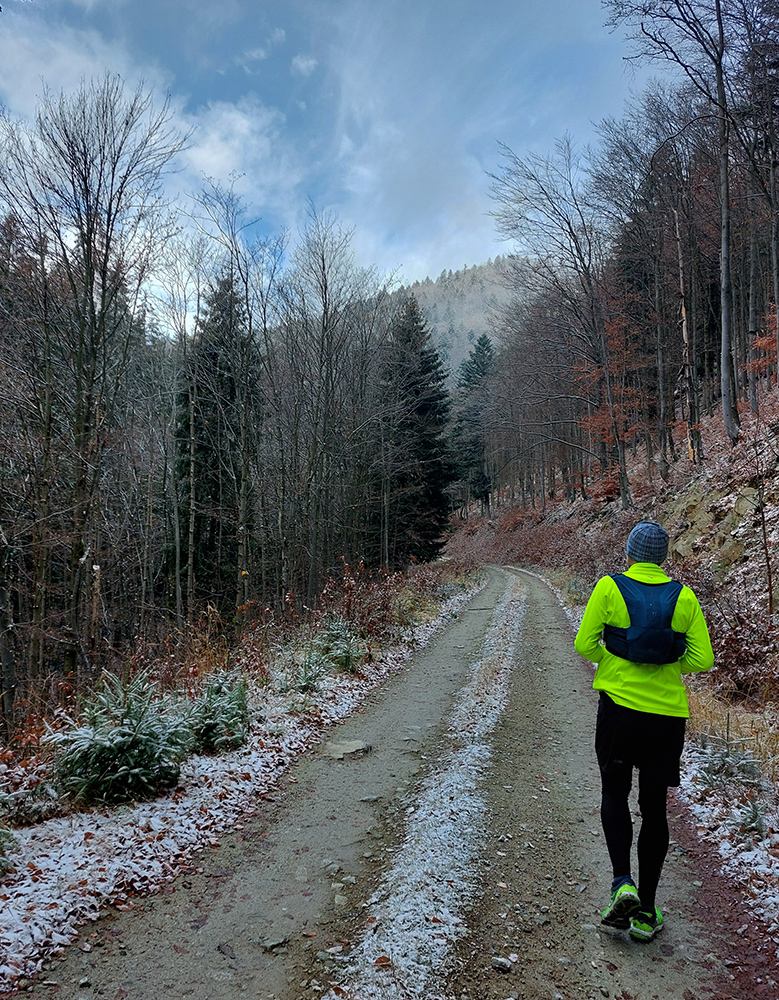 Hneď na úvod tie krásne, nové eurofondové serpentíny – do kopca po asfalte, z kopca do doliny Studenec vymakaná šotolina – takže netreba sa pozerať pod nohy, je tu priestor na obdivovanie prírodných krás (odhodené pneumatiky, dopravné značky, odparkované traktory...). Proste národný park ako má byť! Zo Šútova hore je to asi najdlhšie stúpanie na trase (6 km), ale až na ten strmší úvod nad dedinou sú sklony príjemné, veď zvážnicové, vyklusávacie, vykecávacie. A objavujú sa prvé náznaky prvého snehu.