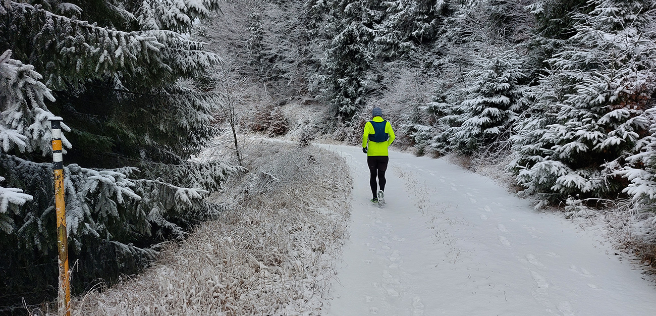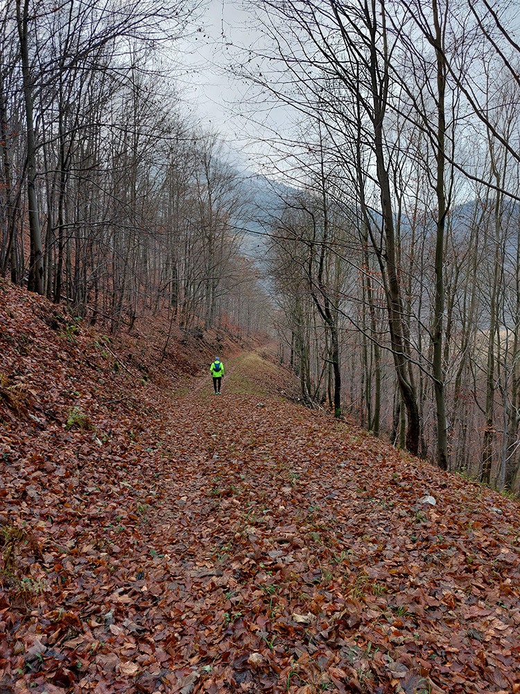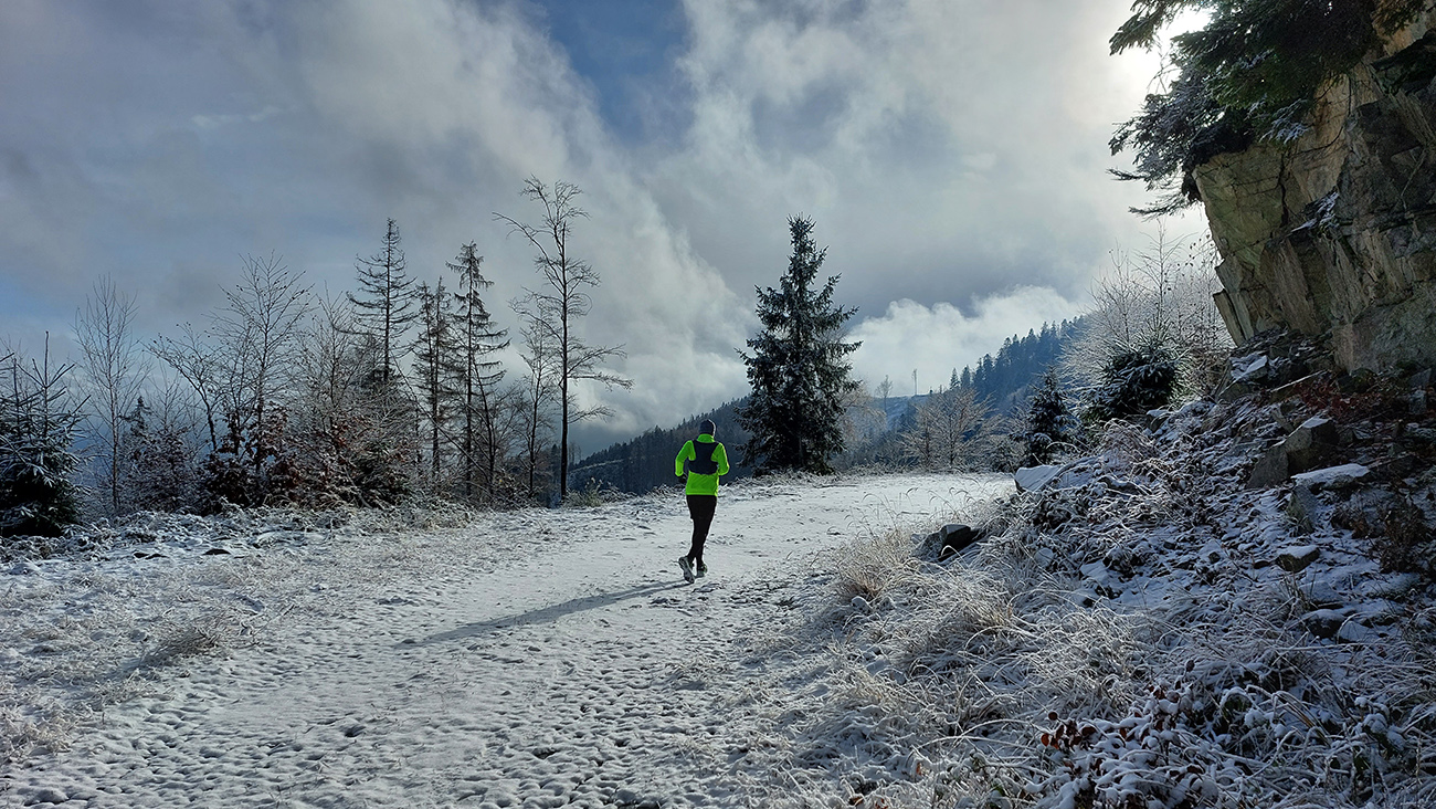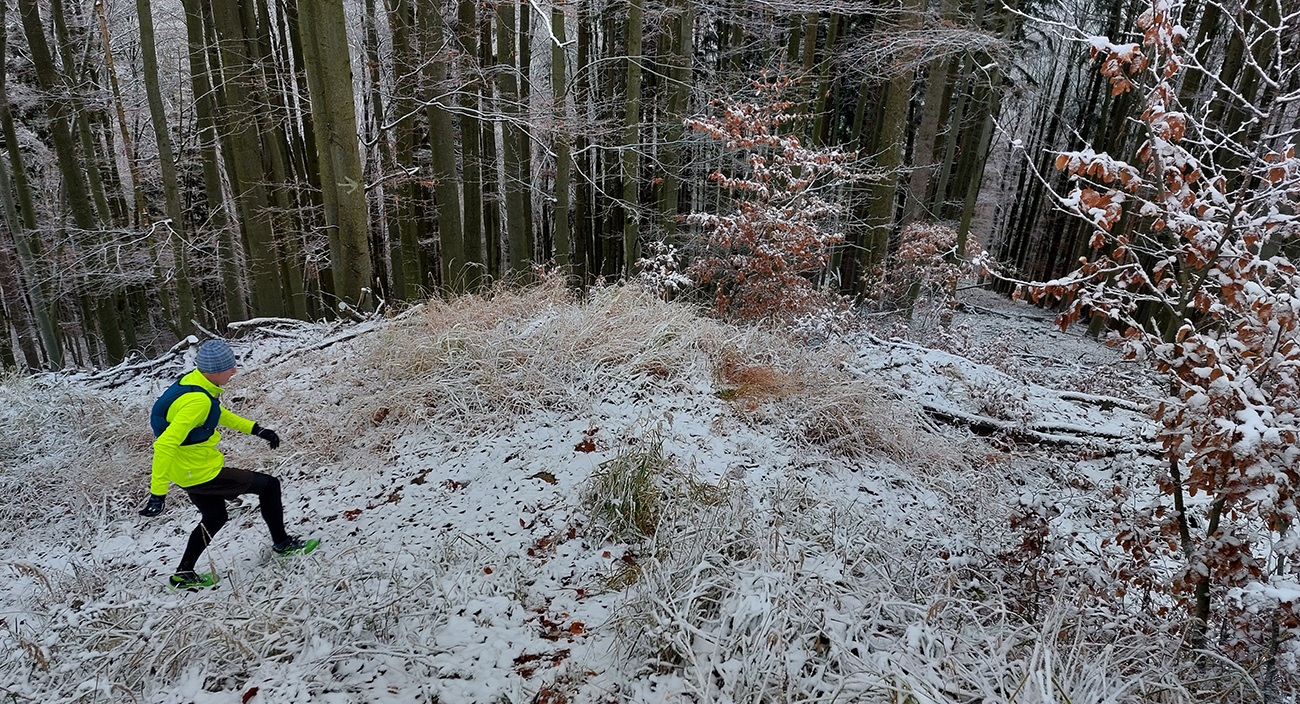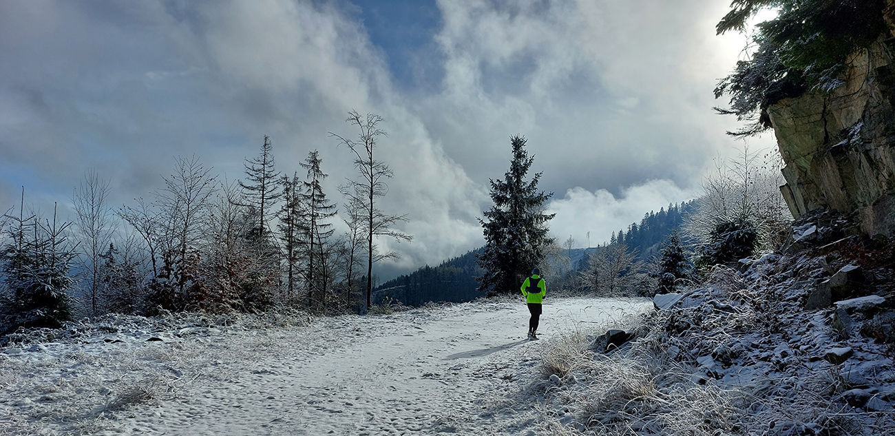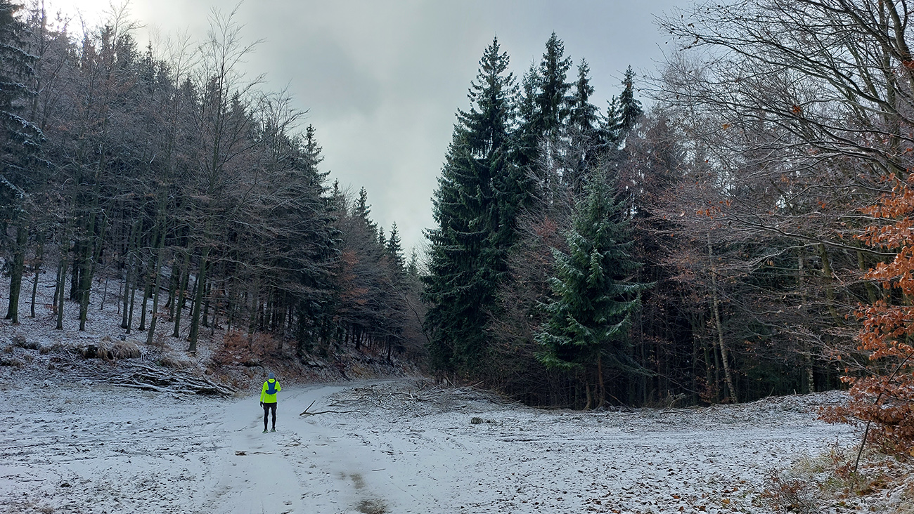 Toto stúpanie nie je dlhé ani prudké, striedajú ho aj klesavé úseky, pod nohami je príjemne – bielo a mäkko, napriek tomu mi to celé prestáva chutiť. Teda hlave to chutí stále, no telo z nepochopiteľných dôvodov stále viac štrajkuje. Nohy začínajú seriózne bolieť, ale čo je horšie, cítim, ako zo mňa odchádza všetka energia. Ale veď baterky dobíjam pravidelne a osvedčeným spôsobom! A natrénované mám túto jeseň toľko, že takýto výlet musí byť pre mňa lahôdka. Nerozumiem, ale kašľať na to - kríza príde a odíde. Akurát, že začínam zdržovať – najhoršie sa mi ide z kopca. Vatové nohy nedokážu vyrovnávať nerovnosti, došľapy začínajú bolieť tiež, periférne videnie sa zužuje... Hrôza toto! Ale aspoň oblaky sa trhajú, sem – tam slnko preblikne a cez „potrhané“ lesy sa otvárajú výhľady do Turca.