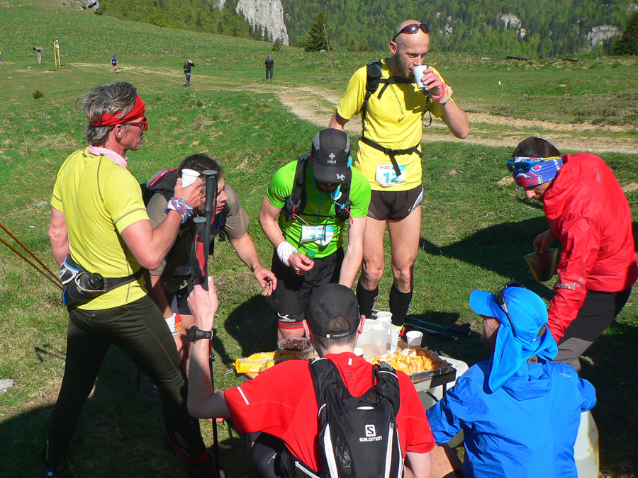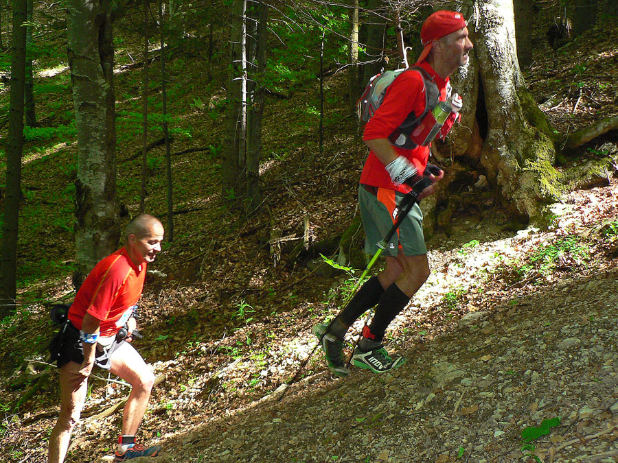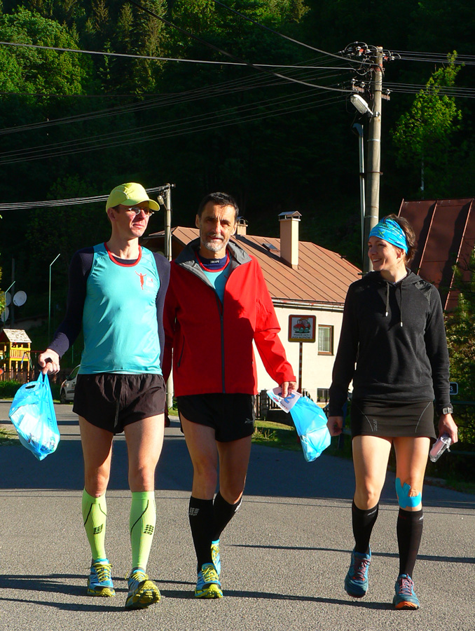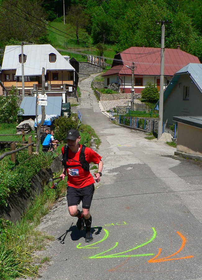 Štart ešte za ranného chládku o siedmej hore dedinou, ale zahriatie asi bolo rýchle do tej steny na Úplaz. Stade dole do Bystrickej doliny, aby sa všetci mohli vyštverať na Kráľovu studňu. Brutálny zbeh do Gadera a brutálny stupák na Ostredok. Trochu vydýchať proti vetru po hrebeni na Ploskú a dlhý zbeh po lúkach do Vyšných Revúc. Asfalt a šotolina cestou na Veľký Šturec a posledný technický úsek po hrebienku do východného Prašnického sedla. Traverzovým lesným chodníčkom do Prašnice. Odtiaľ už len po cestách. Dole do Valentovej, hore cez celé Rybô a po zvážnici, dosť nahusto vystlanej makadamom, kolísavo hore - dole do cieľa.