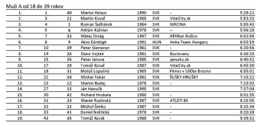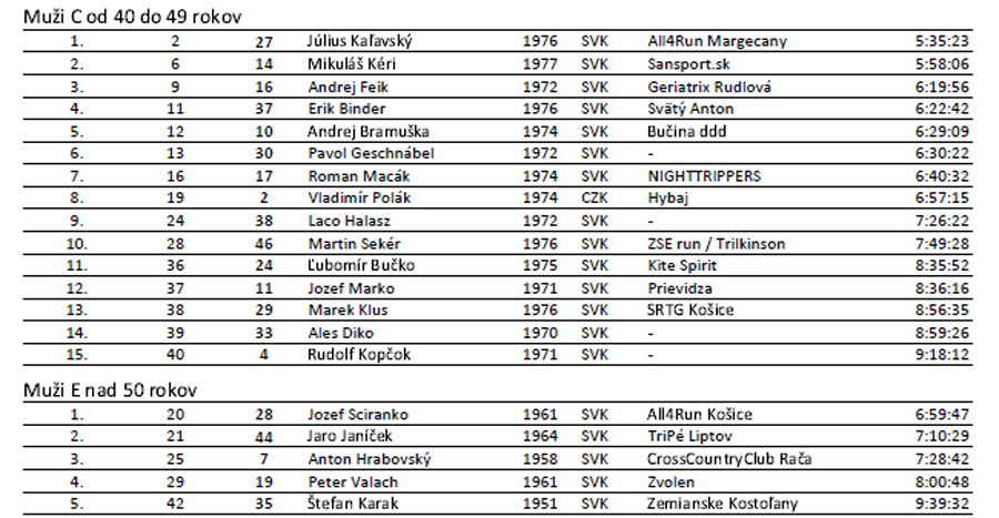 Ostatným trom dievčatám nedala šancu Barbora Šimková (za 7:35), hodinu pred Vikou Drenkovou. Tretia Silvia Petrjánošová ale Vike pred koncom doslova dýchla na chrbát - rozdiel iba dve minúty. Štvrtá Soňa Kopčoková si dobehla akurát na vyhlasovanie po cenu. Hneď ju pratali na bedňu :-) Posledný prišiel symbolicky najstarší účastník, ale zvyknutý na dlhšie štreky, takže stále vo výbornom čase, ale najmä v pohodičke.