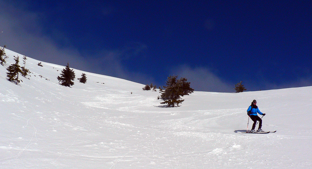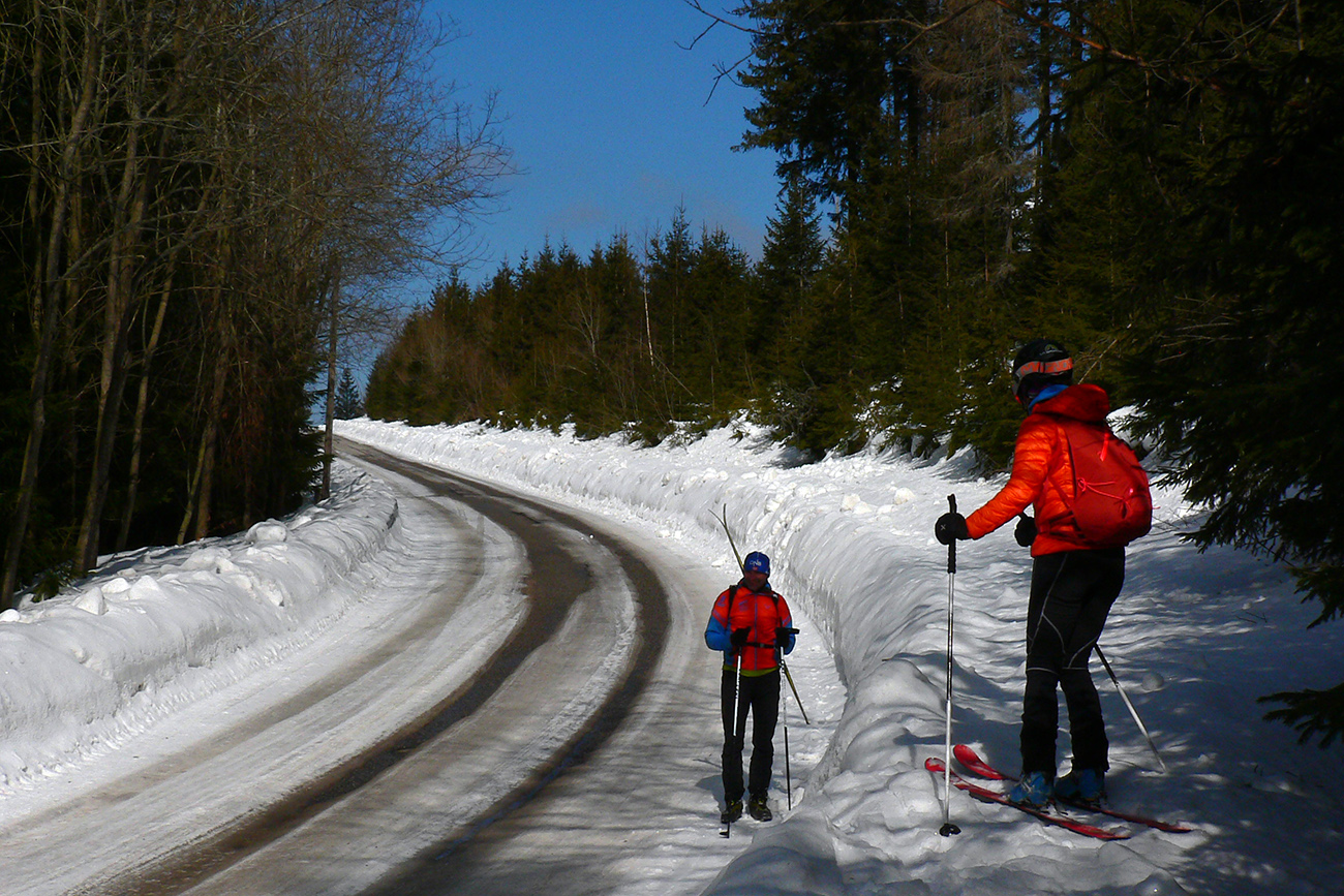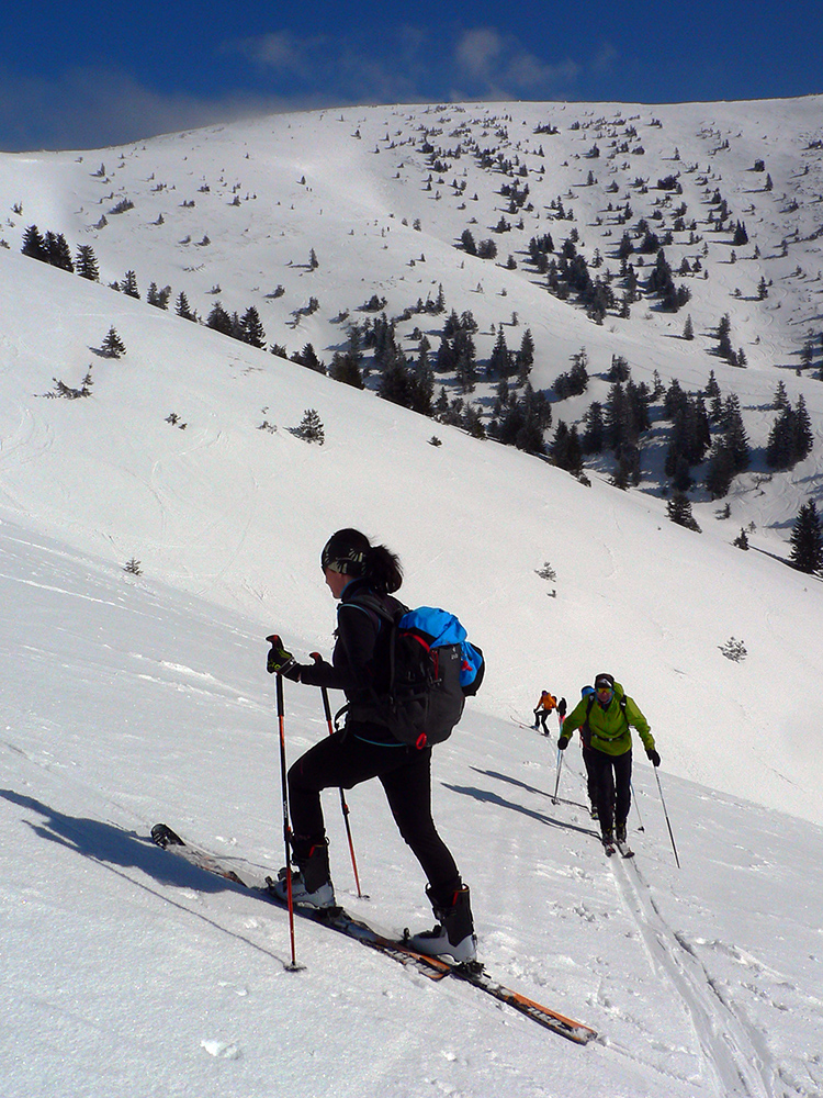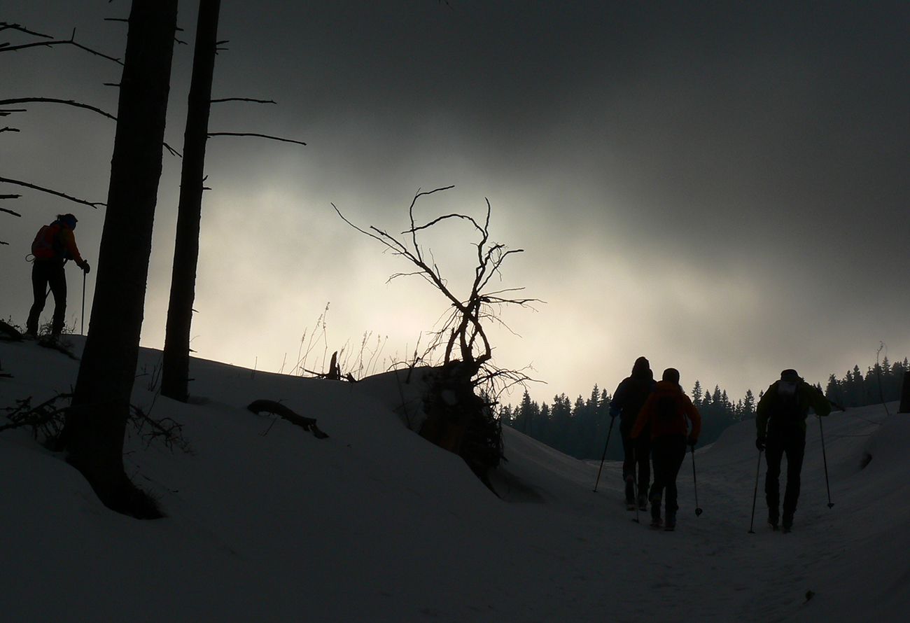 No mali sme byť traja, nakotilo sa nás päť. Na môj samotársky vkus poriadna banda, ale všetko známe firmy, niekedy neuškodí aj takáto „masofka“. Mal som tam byť za sprievodcu, ale známa firma „Majster Z“ sa vyzná lepšie, najmä po kadejakých miestnych zbojníckych chodníčkoch, grúňoch a dolinách. Tak som s radosťou prijal úlohu vzadu sa vlečúceho a miestami z predposledných síl nadbiehajúceho fotoreportéra. Lebo počasie vyšlo na jedna mínus. Jedna preto, lebo aj na hrebeni vládlo bezvetrie, slnko čoraz viac prepaľovalo rednúce mraky a dobré snehy sa dali nájsť ľahko. Mínus preto, lebo nepieklo ani na južných svahoch, slnkom opekaných, v podstate stále bolo mínus a keď už okolo obeda začal prašanček na tých juhoch trošíčka naznačovať, že by snáď mohol aj lepiť, zdrhli sme definitívne do severov.