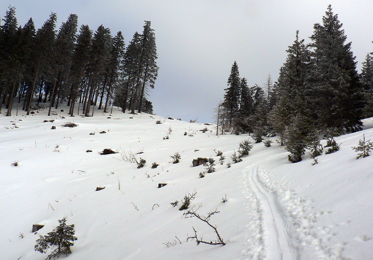 Takmer presne po roku som sa „vrátil na miesto činu“ (odkaz dole), ale teraz už dve expedičné autá sme zapichli vyššie, priamo v sedle Prievalec na takmer prázdnom parkovisku. Len rozospatý pohľad z jedinej prítomnej dodávky nás obviňoval z radosti asi príliš nahlas prejavovanej - pri chystaní do akcie. A sme teda vyrazili: stopy preleštené, aj v lese špina prikrytá novým popraškom, na rúbaniach hygienická bieloba, ešte takmer nepokreslená. Samozrejme som z čistej zaneprázdnenosti zabudol zapnúť hodinky.