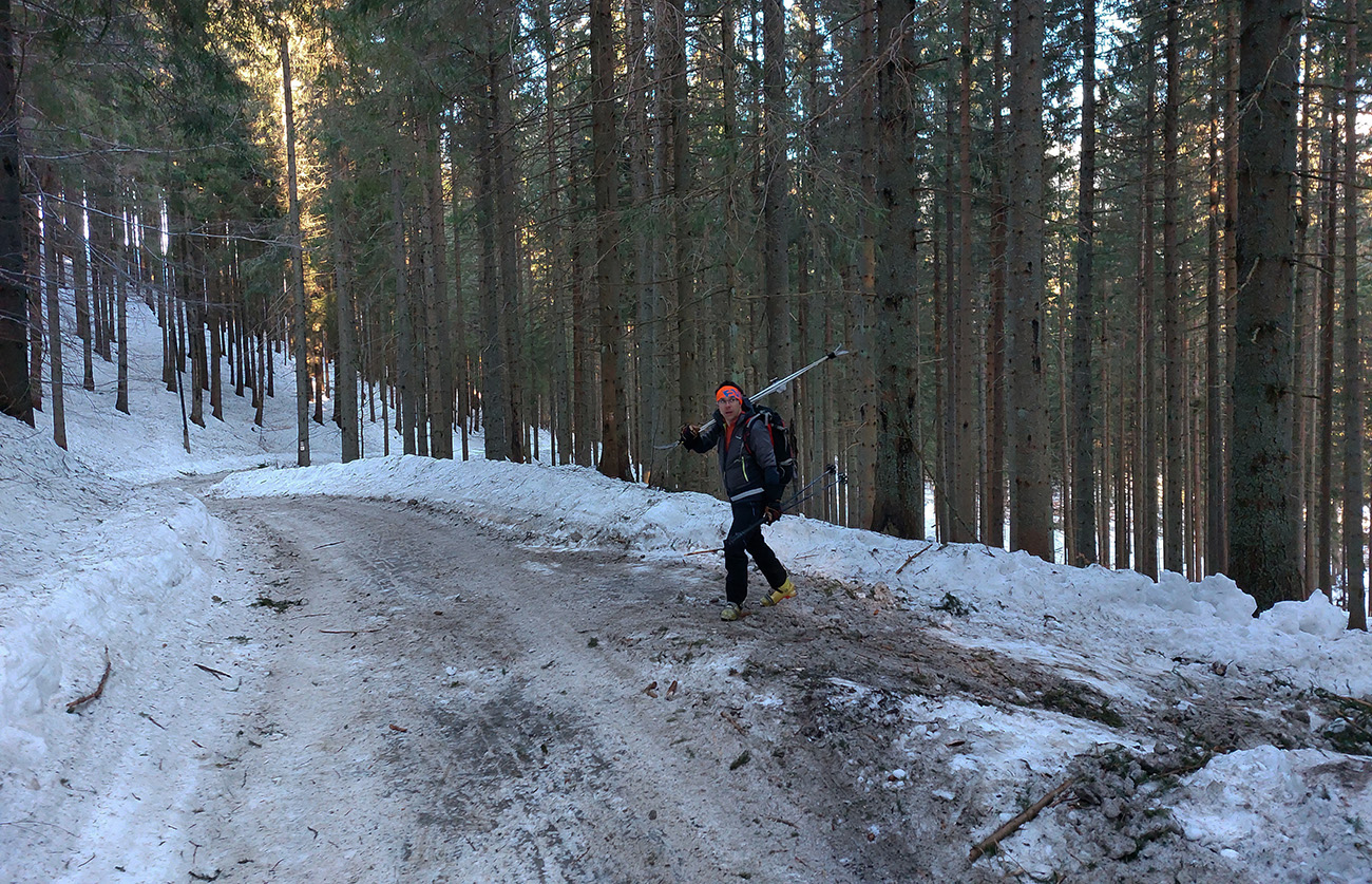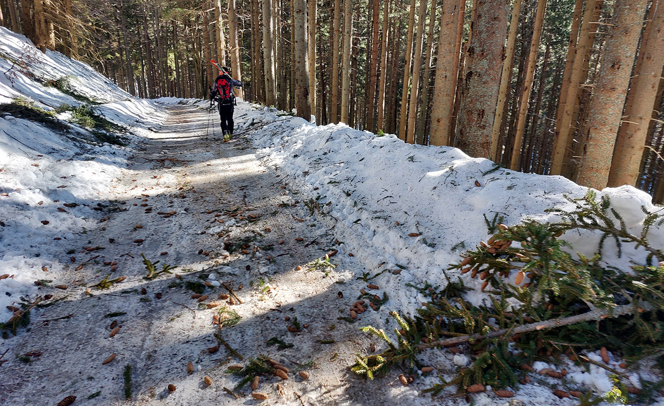 Čo k dispozícii nebolo? Znalosti o prístupe a o stave cesty. Tak sme reťaze nechali v kufri a povoz na Prievalci, že sa skúsime prebojovať na Magurku po ceste, po zelenej značke. Aspoň to tam poriadne obzrieme. Aj sme obzreli, lebo pod cestou lesáci veselo ťažia a po ceste smerom na Prievalec veselo tie stromy ťahajú. Tak pešovačka, ale to by asi bola aj bez toho, lebo odmäky povyťahovali šutre spod snehu, skoro na asfalt odhrnutého. Aspoň sa moc nešmýkalo, lebo inak pod tým bordelom ľady prestrašné: