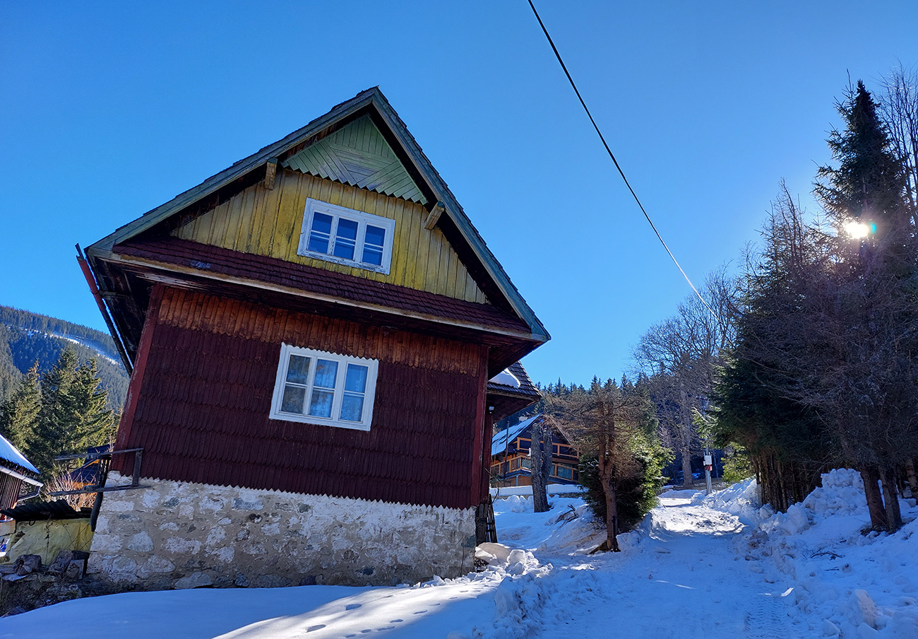 Ako sme minuli odparkovaný harvestor, cesta obelela, tak sme to skúsili na pásoch, ale o chvíľu išli lyže zase na chrbát, až po horný koniec Magurky. Aspoň sme si poobzerali odbočky a trochu hádali, ktorá z nich nás nazad na túto cestu vypľuje na konci. A potom sme si poobzerali domčeky a iné artefakty Magurky a „s piesňou na perách“ sme konečne nastúpili do lyží a do Viedenky.