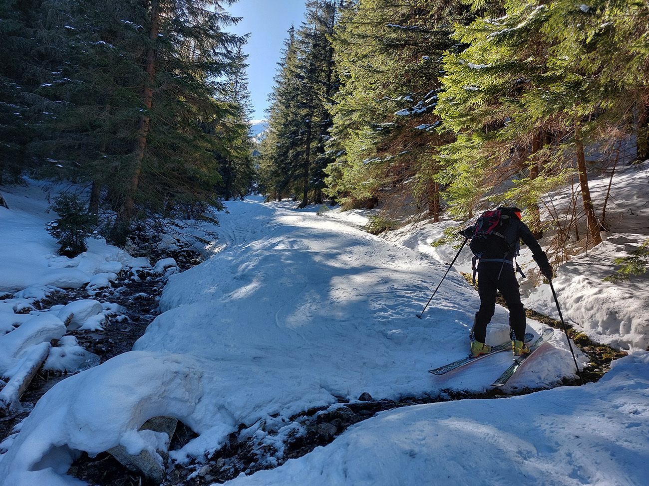 Nástup teda štýlový - cez kopu dreva, zapadanú snehom. Priamo cez potok asi. Ale sme proste nasledovali stopy. Viedenka zato parádne vyleštená, tvrdá, vôbec nie ľadovo šmykľavá. Aj rodinný výlet a pípajúci lavínový kurz sme minuli a bez podklzovania sme sa šťastne dostali až do kotla: