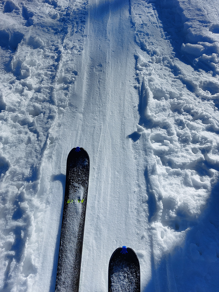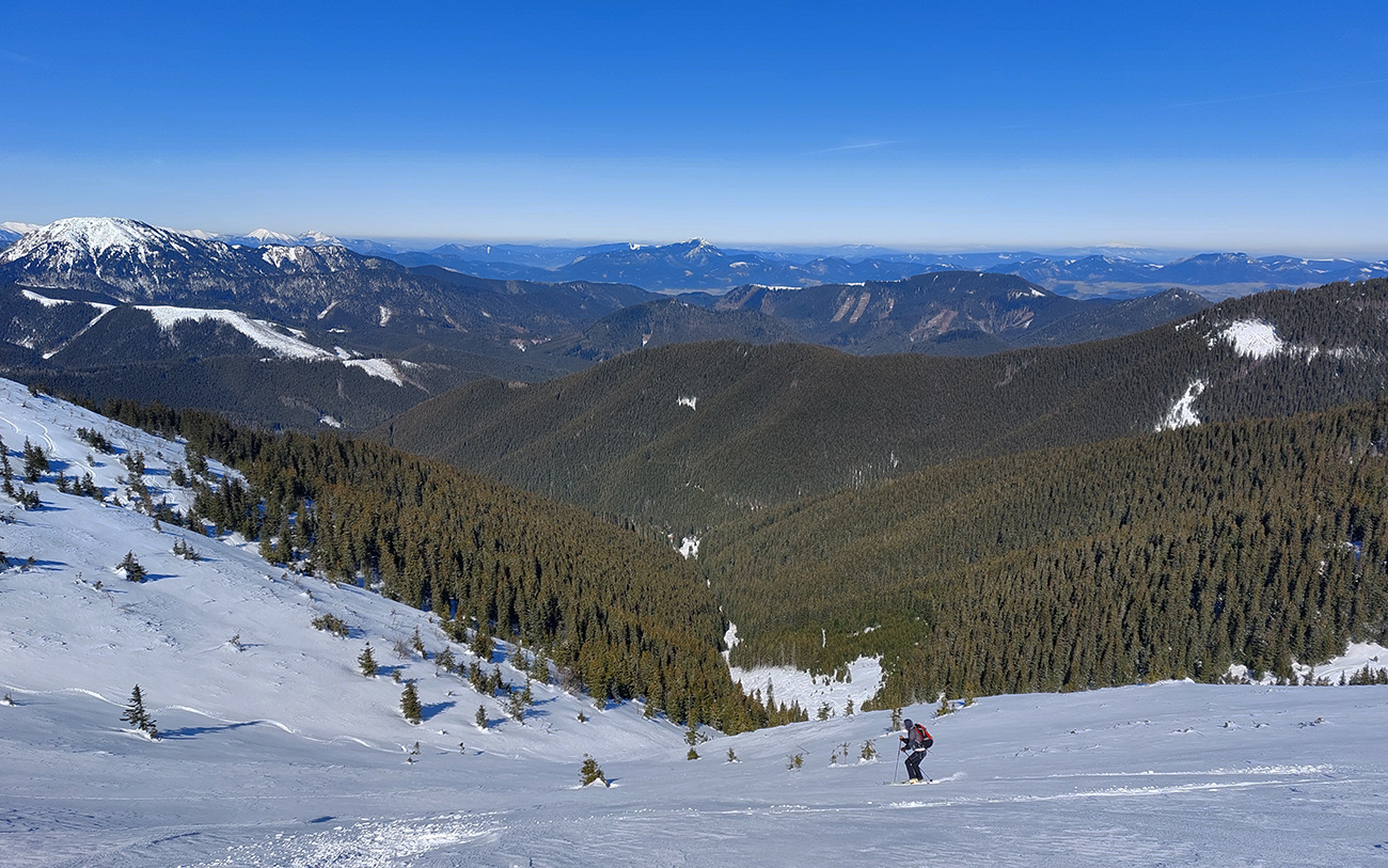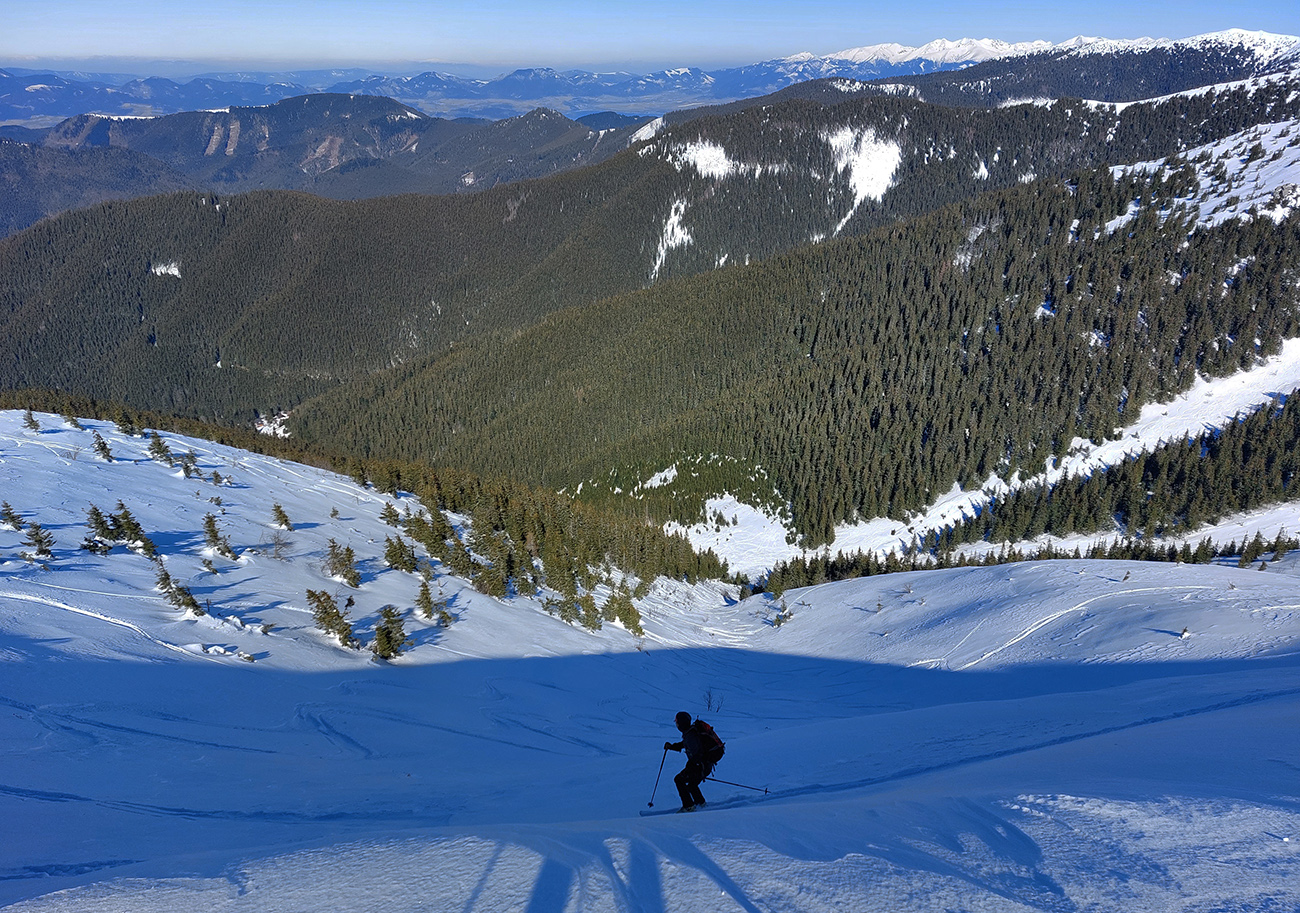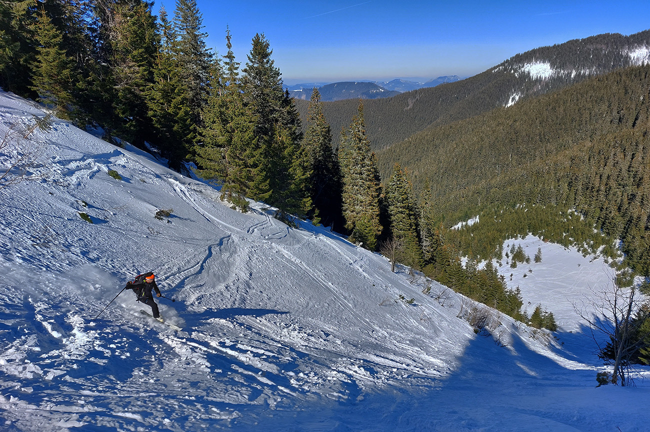 A to najlepšie na koniec. Na úvod konca síce skok cez ľadový prevej na drsný betón (úplne na vršok Latiborskej sme ani nešli), no ten sa po pár oblúkoch zmenil na parádny, konzistentný sneh, prechádzajúci až do takmer neuveriteľného, jemného, premrznutého prášku. A pretože tadeto veľa ľudí neprešlo, našli sme si aj my to svoje, nepočmárané. No rozkoš jednoducho neočakávaná!