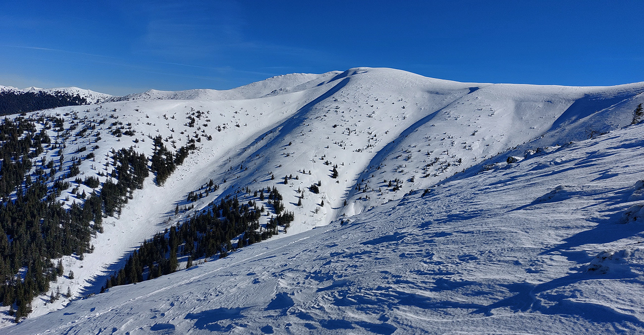 Tie dva kiláky po hrebeni nakoniec neboli až taká tragédia – síce ľadové vlny, šindle, hobliny, hrče a iné pásožravé patvary, ale nejako sme väčšinou pomedzi ne preštrikovali po zvyškoch aj po čerstvých náfukoch normálneho snehu. Do juhov sme ani nenakukli, tam to isto bolo mokré a inak hnusné. Niektoré nešťastnejšie časti hrebeňa už boli samozrejme do hneda, až fuj.
