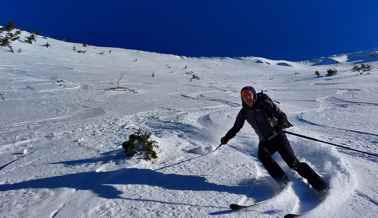 A tam samozrejme dilema, že kade hore. Zhodli sme sa napokon, že to vezmeme zľava a keď sa vyššie rozkukáme, uvidíme čo ďalej. Napokon sme to tam otočili dvakrát. Prvá jazda v parádnom prašane na tvrdom podklade, priamo do severu. Druhá trochu horšia o „zjazdovku“ vedľa, aj nejaké kôrky už za nohy ťahali, orientácia svahov už hrala podstatnú rolu. Ale slniečko sme videli po dlhej dobe konečne inak ako len cez okno pracovne, to bolo hlavné. A teplota ideál, aj vietor len osviežoval, nemrazil.