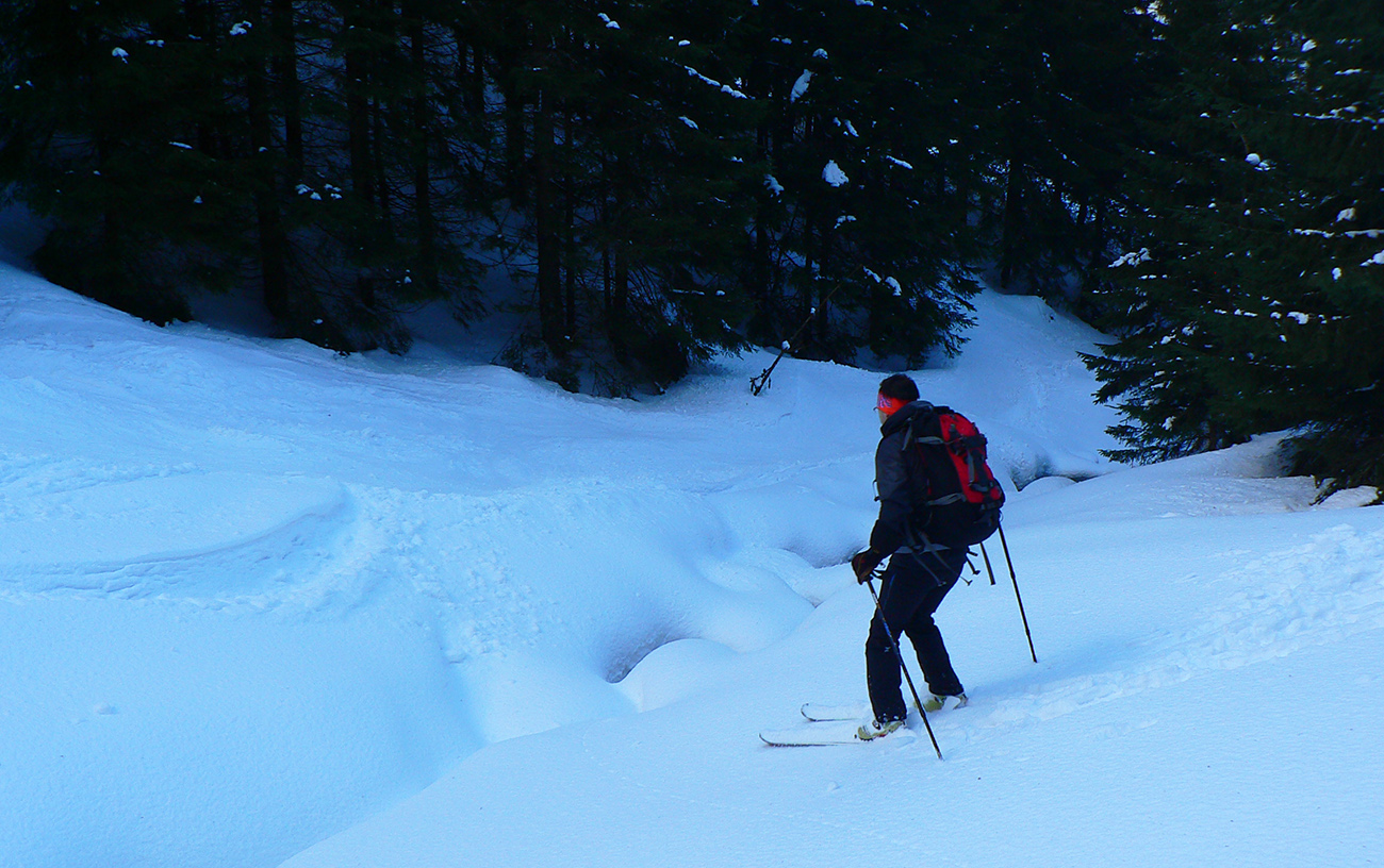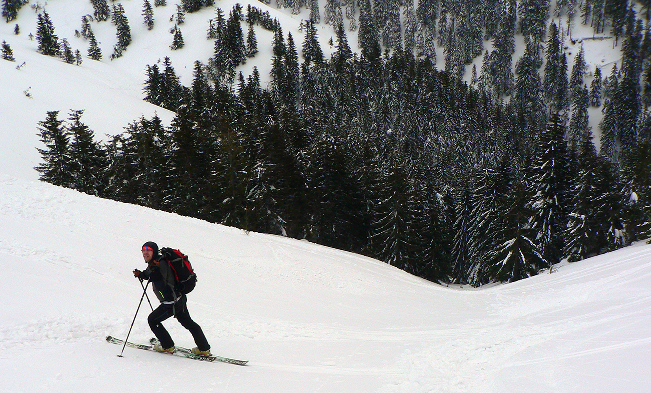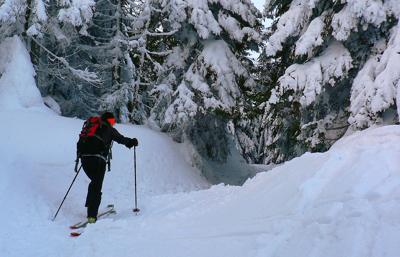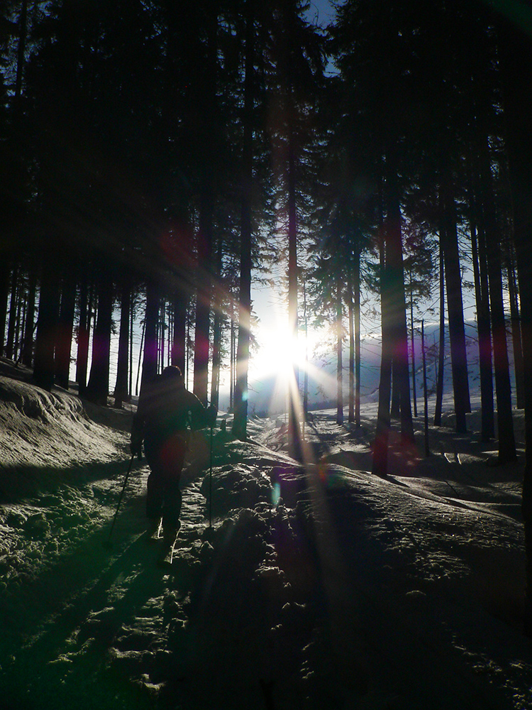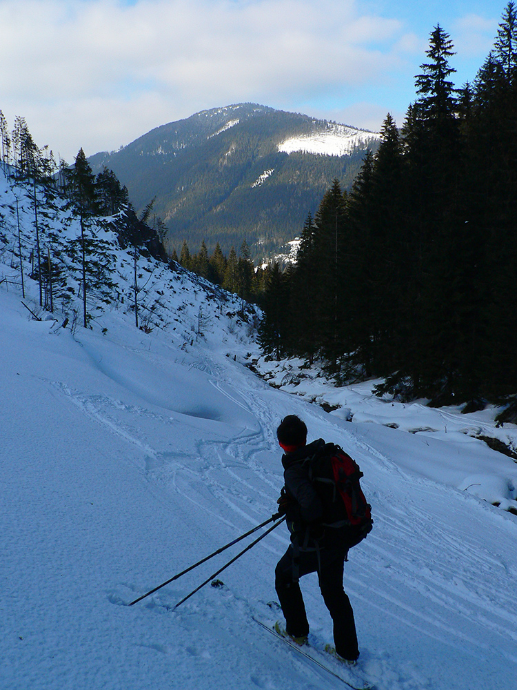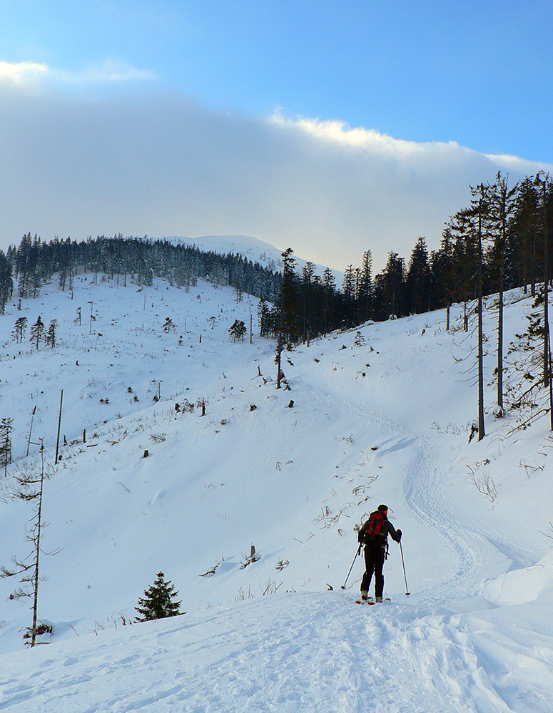 Rýchlo zbalíme a vyrazíme, hor sa do kopcov. No počasie vyzerá zatiaľ neprívetivo: tma, sivo, hore fúka južák. Pekne lesom po chodníčku, trošku strmšie ale na zohriatie akurát. Akurát Rišovi sa zdalo, že som veľmi rýchlo vypálil. Z lesa vyjdeme proti slnku na menšiu rúbaň a po zvážniciach smerujeme strmo hore vpravo. Sneh je celkom dobrý, ufúkaný a ešte suchý. No lebo ideme zo severu. Hore fúka viac a viac, mraky si dávajú preteky.