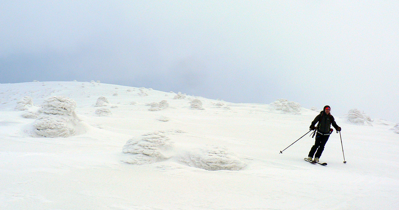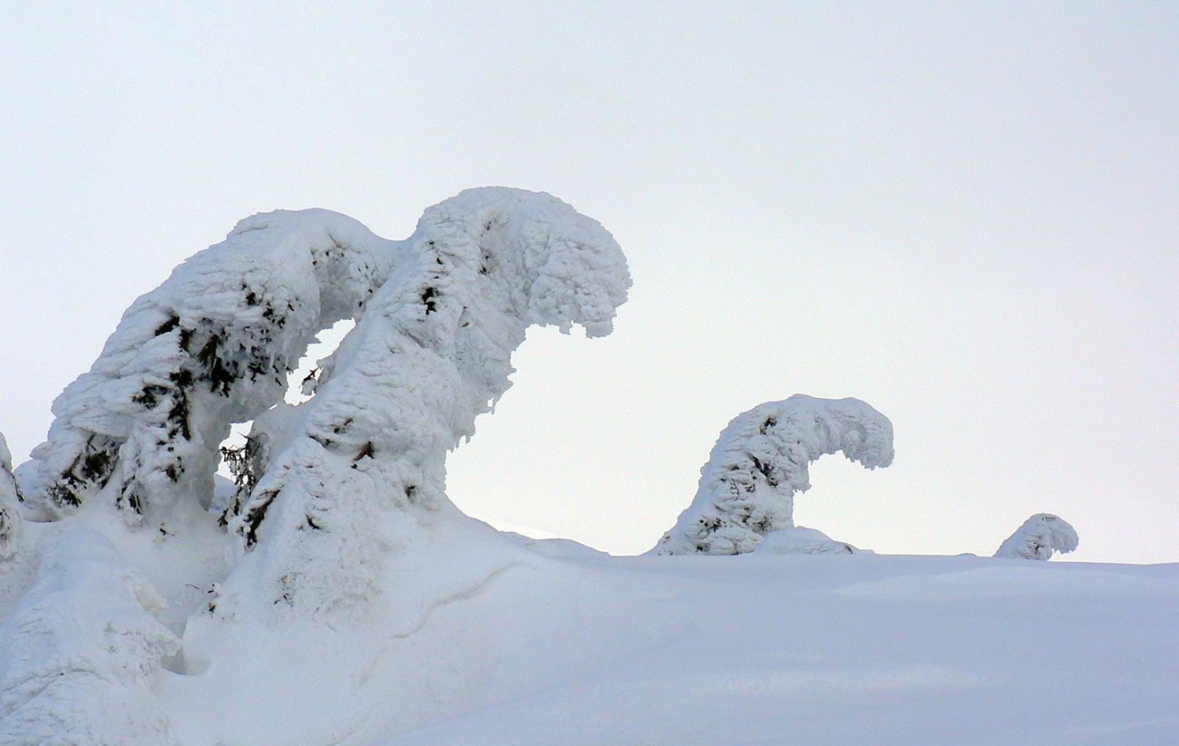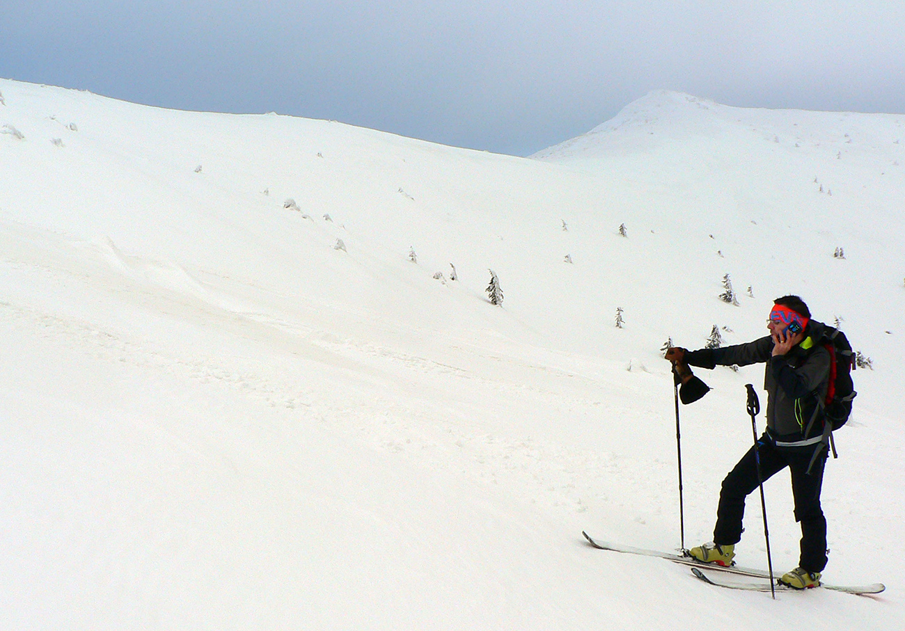 Smerujeme na hlavný hrebeň Nízkych Tatier, niekde okolo Skalky a Veľkej hole vraj ešte tie dobré terény budú. Na hrebeni fičalo slušne, rýchlo zbehneme pár metrov do závetria. Zhodíme pásy a smerom na východ dáme krátky zjazdík: trochu doska, niekde tvrdšie. Výhľad biedny. Ale lyžovačka fajná. Dole v jame dávame pásy a po malej, ale doležitej technickej oprave a uletenej rozprave šliapeme nazad na hrebeň. Dole v jame bolo bezvetrie, nádhera. Čím vyššie, tým viac sa fujak znova pripomína. Nie je veľmi zima, tak sa to dá prežiť, ale na hlavu k pot-čelenke šla veru kapucňa a Rišo si dal aj čiapku! Traverzujeme Veľkú hoľu smerom ku Skalke, míňame rôzne postavičky - krásne tvarované stromky. Vietor a Mráz - kamoši sa tu pohrali ako v ateliéri. Sochy na výstave. Výjavy všetkého druhu, najviac vidíme koní, modliacich sa pútnikov, veveričiek, nejaké obscénne výjavy sa nájdu tiež. Pekná krajina, človek sa hneď cíti lepšie a nie tak sám. Na západ Rišo sľubuje lepší sneh v zjazde, tak smerujeme k rebru, ktorým išiel včera dole do Lúžnej.