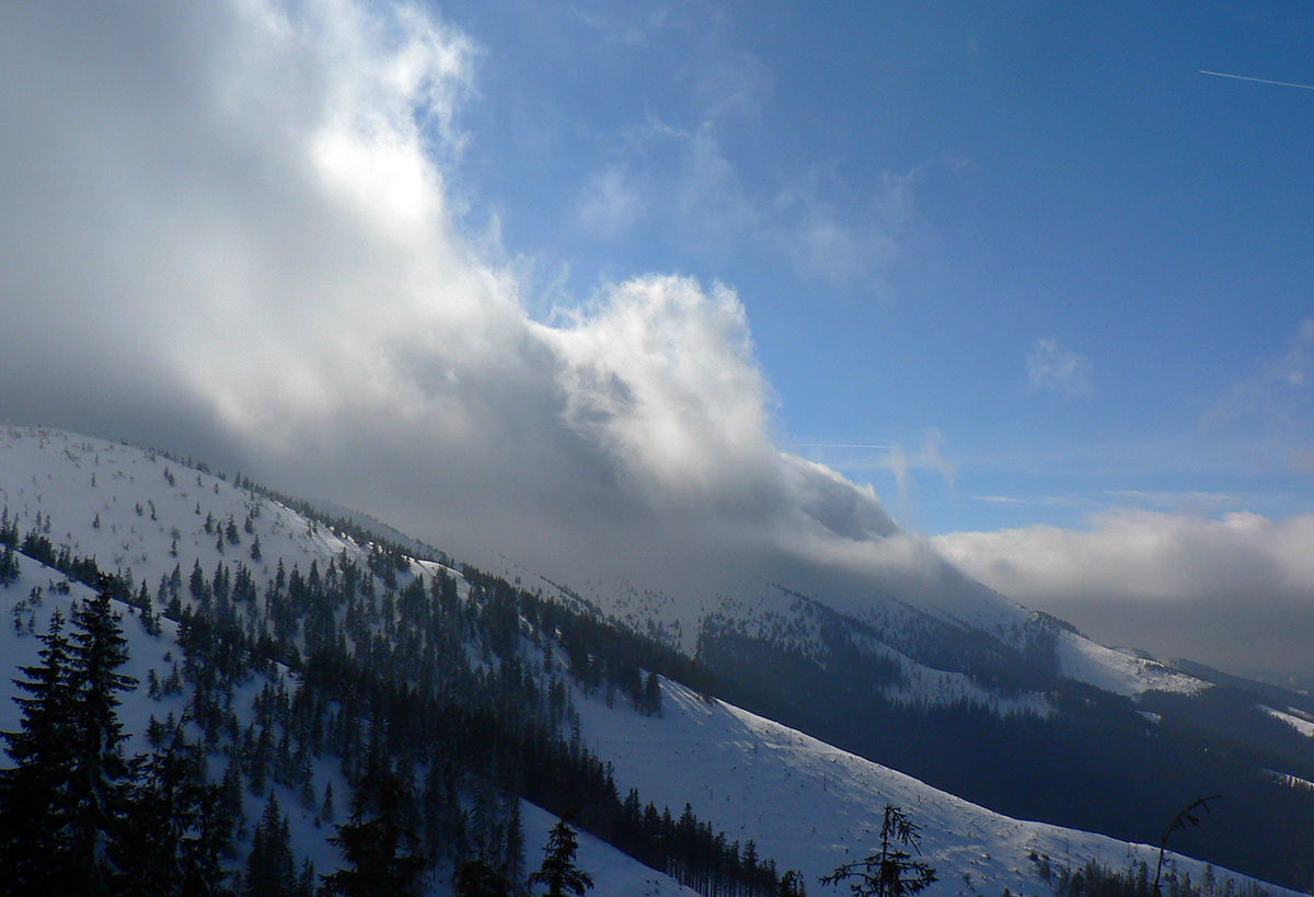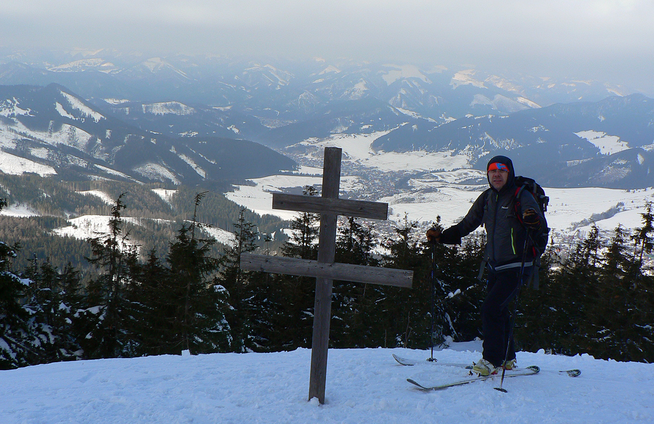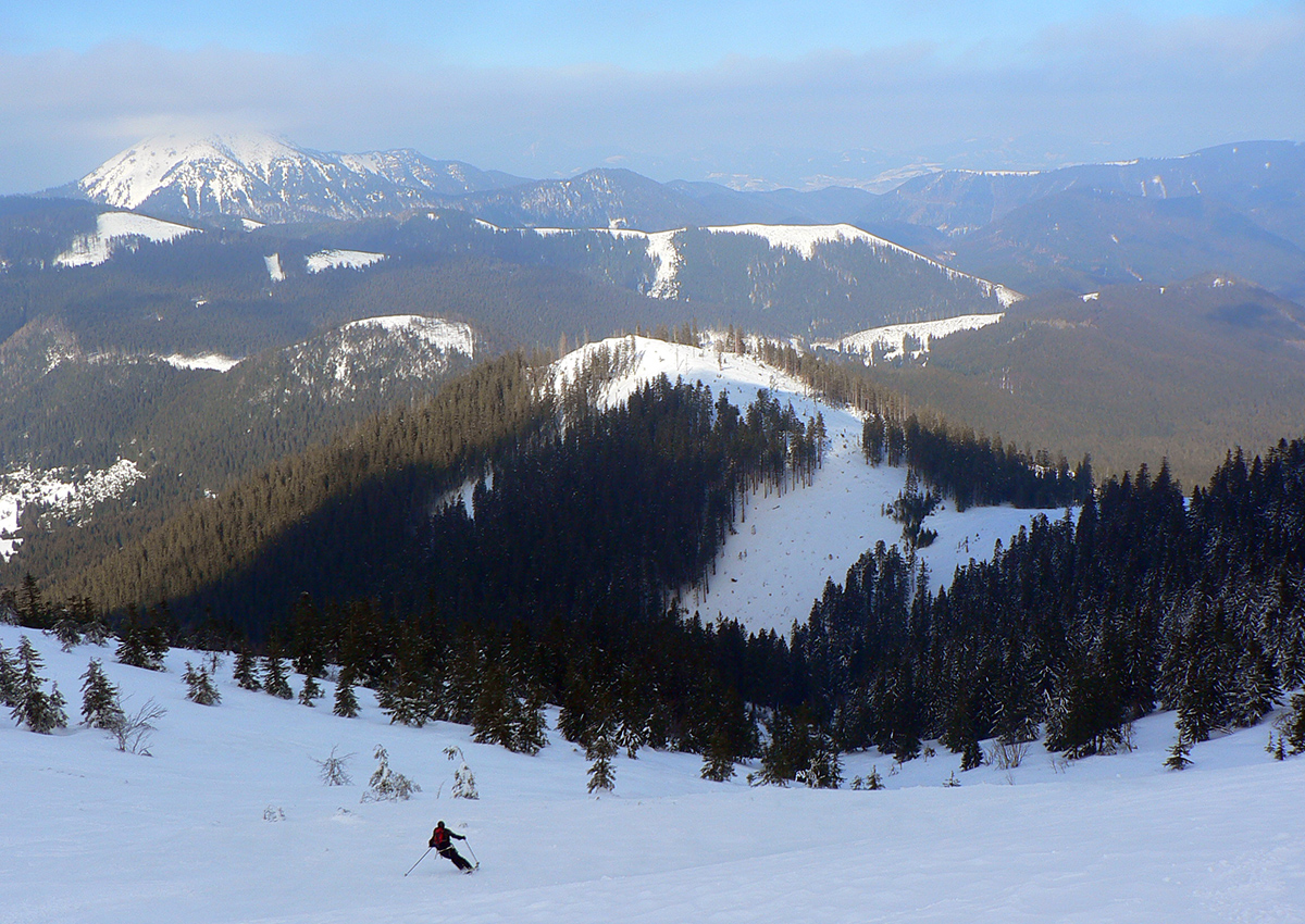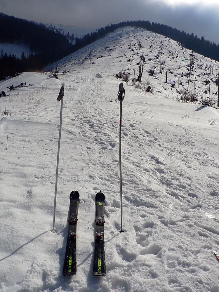 Prvé metre sú slalom v stromoch, ale sneh ozaj dobrý a hlbší, potom sa to otvorí, lebo vyrúbaný úsek. A tam už pekne v rýchlosti a strmosti, pekne točíme. Na dohľad máme dokonca slnko. No to lebo klesáme na ten správny smer. Na slnku v bezvetrí dáme desiatu, debatujeme, fotíme. Výhľad na Prašivú je majestátny, má aspoň o 500 m vyšší profil, vlnový mrak presne kopíruje jej tvar. Dnes asi máme počasovú smolu. Lyže sa vytápajú za tri minúty a stojíme na odmäku. Pošteklíme voskom pásy, nech hore neťaháme tony, a ideme nazad rovnakou cestou. Ale teda dole sa to nezdalo také strmé ako smerom hore. Aj opierku sme si pridvihli a furt strmo, na lyžiach potom kilo snehu zhora. A tak pomaličky až okolo kríža nazad na hrebeň do Sivého Fukarova.