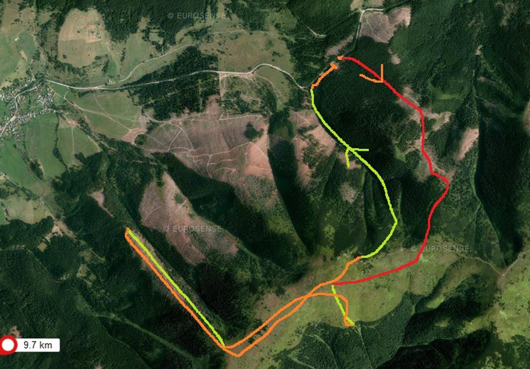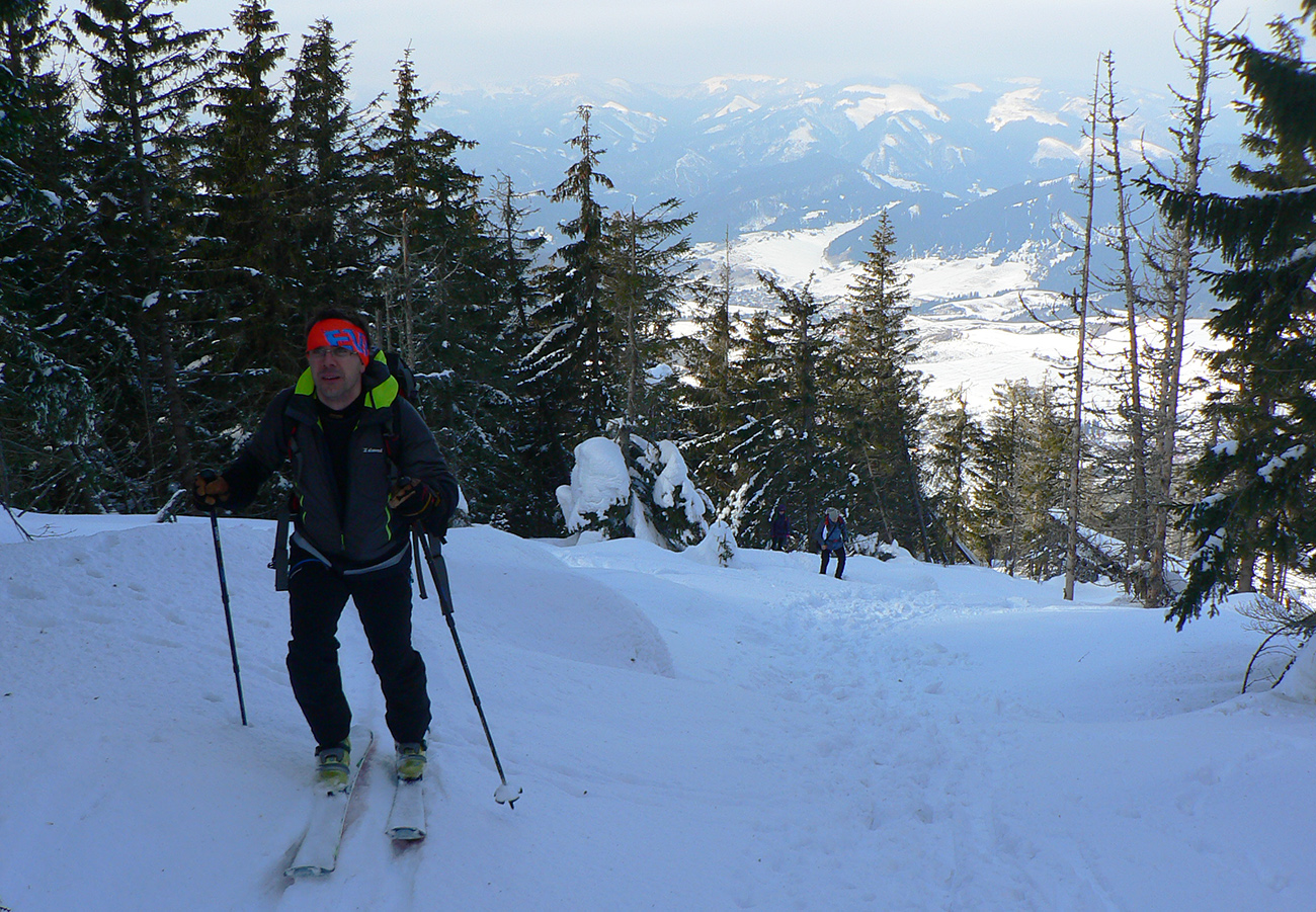 Napešo precupitáme cez dedinu a za apartmánmi u značky dáme lyže a po oficiálnej skialp trase AB sa vnárame do lesa. V lese už mokrý sneh, ale aspoň dobre drží. Horšie je potom v traverze, tam to šmýka na ľavú nohu. Stopa takmer žiadna, tak sme kúsok menisky precvičili. Po chvíli aj tu slnko mizne vo vyššej oblačnosti, no nemáme dnes šťastie. Béčkom smer do sedla Prípor a po hrebeni SNPčky smer na Zvolen. Pri posledných stromkoch po zemi vidím rozvláčené pierka pruhované... Ej dakto tu asi skončil na večeru. Po hrebeni zas prievanovo, výhľady na Nízke Tatry také urezané, vršky nevidno, len tie spodky s V-čkami od lesníkov.