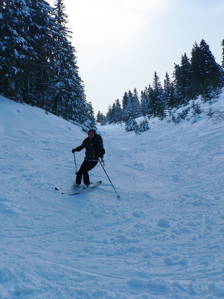 A tak zase krížom cez sochársky ateliér, z druhej strany vidíme zas iné postavičky, len v tej sivote sa to aj zle fotí (ale motohodiny sa točia). Vietor neustal, mraky ostali. Z hrebeňa trošku vidno smer Horehronie v úzkom priezore, ale to je tak všetko tým smerom. Na západ vidno Zvolen, Ploskú aj Smrekovicu, je tam o dačo menej oblakov. Ale inak naša motačka = čistá deka. Od Veľkej hole na sever vidíme pekný kotol na zjazd, inou ako výstupovou trasou, a tak to riskneme, veď isto to dôjde niekde k ceste nad dedinou a auto si nájdeme. V žľabe najlepšia lyžovačka dňa, sneh parádny, hore jemná ale nosná doska a po prvých stromoch aj hlboký (25 cm), sadnutejší, ale stále nelepivý sneh. Pristrmuje sa to aj zužuje, treba opatrne, ale s radosťou. Na spodku ešte chvíľu premýšľame, či si to nevyšliapať znova... Ale je to také strmé na pohľad, že cikcaky sa nám nechce ťahať a napriamo napešo to by bola morda nad kolená. Unavení sme už, tak to necháme tak a po doline preskakujúc potok ideme po stopách miestnych predchodcov.