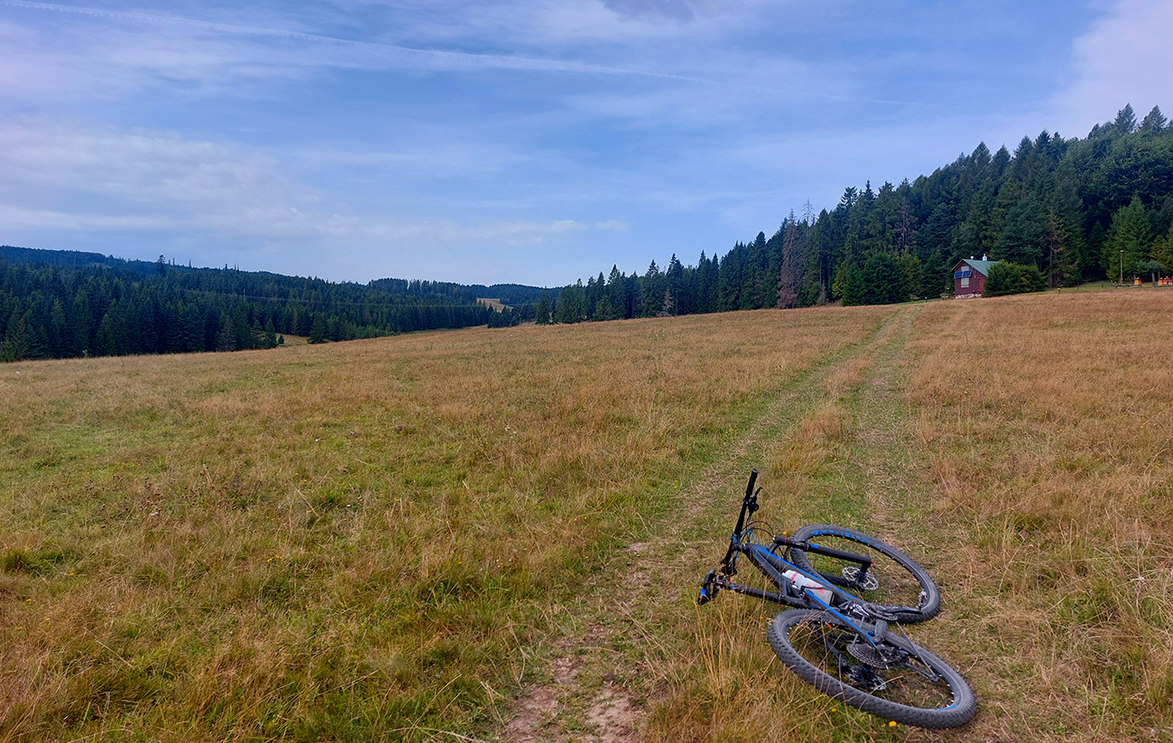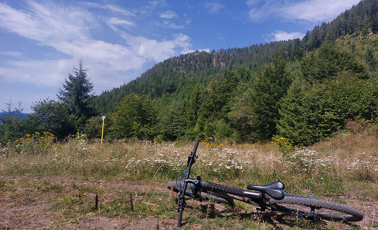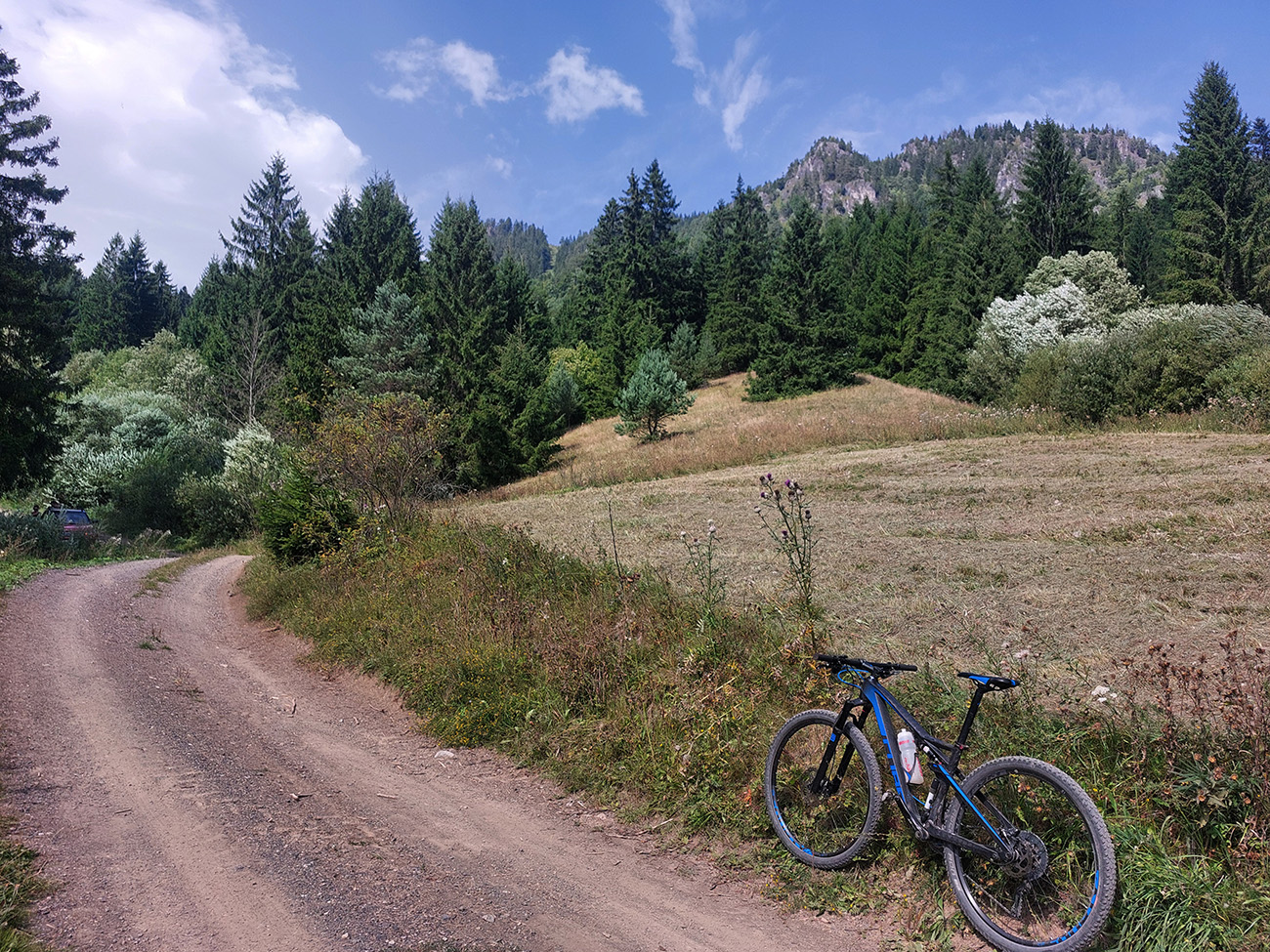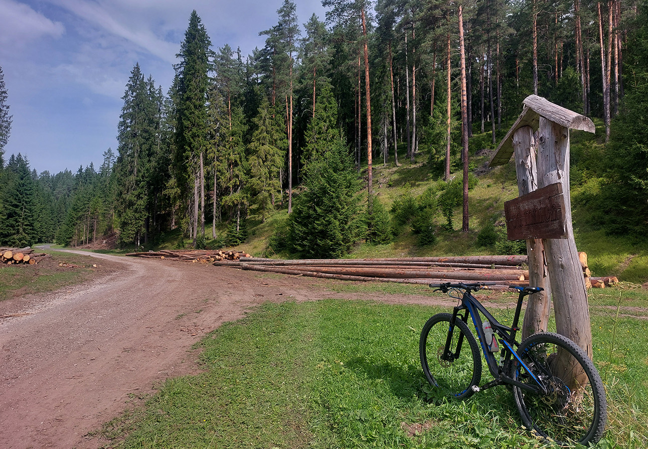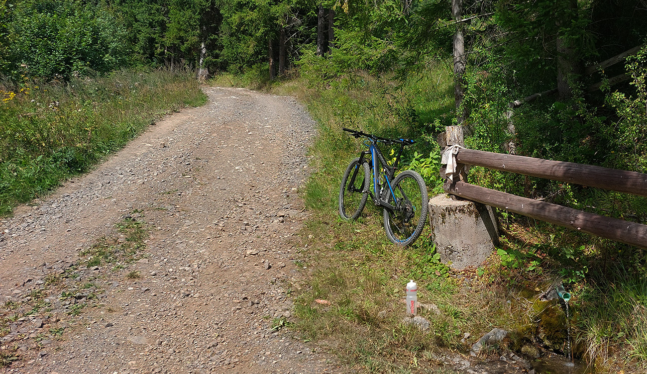 Najväčší „záhul“ ma čakal pod Selnicami, v stúpaní po zelenej značke do svahov nad Michalovskú dolinu. Na pár stovkách metrov je to superstrmé. Ono by sa to dalo vyjsť, len prach, voľné kamene a erózne ryhy... Ale v úvode strminy studnička dobre padla, nad hlavou krásne bralá a okolo lúky, lesy, chaty. Naopak zjazd na horný koniec Liptovskej Porúbky je potom rýchly, rovný a pohodlný.