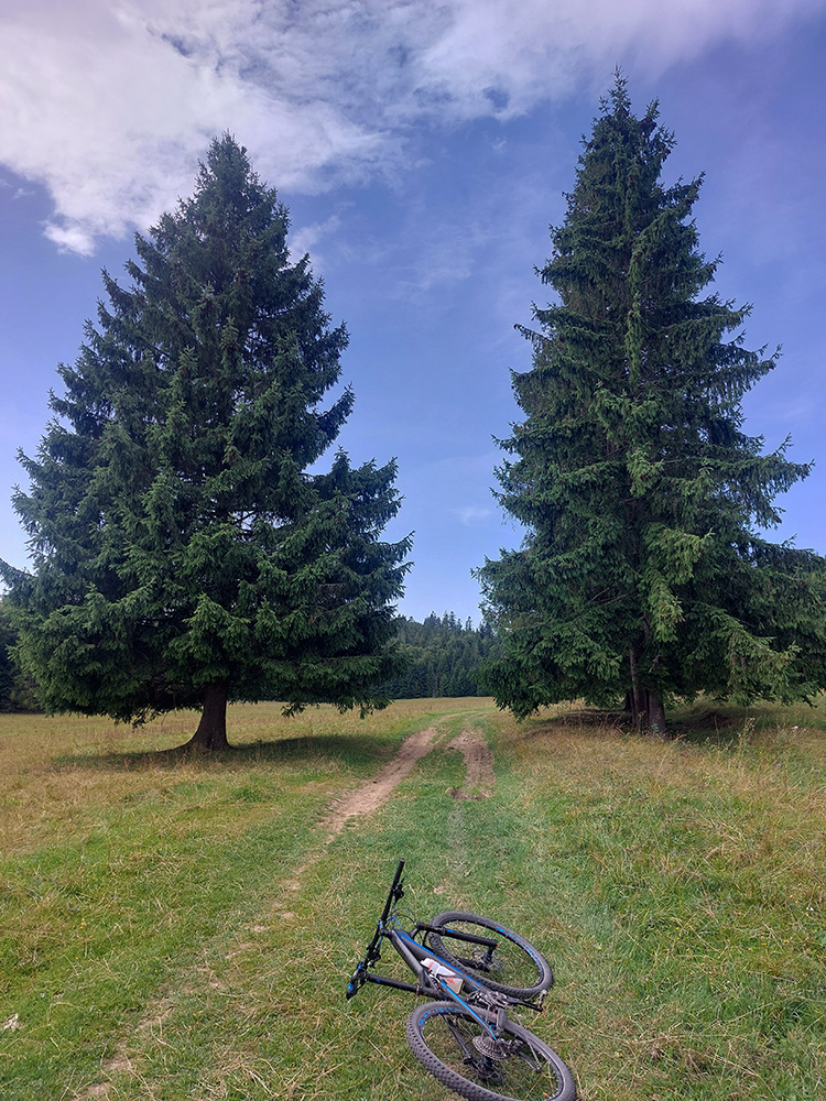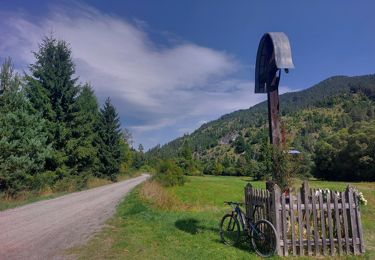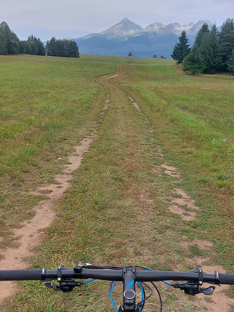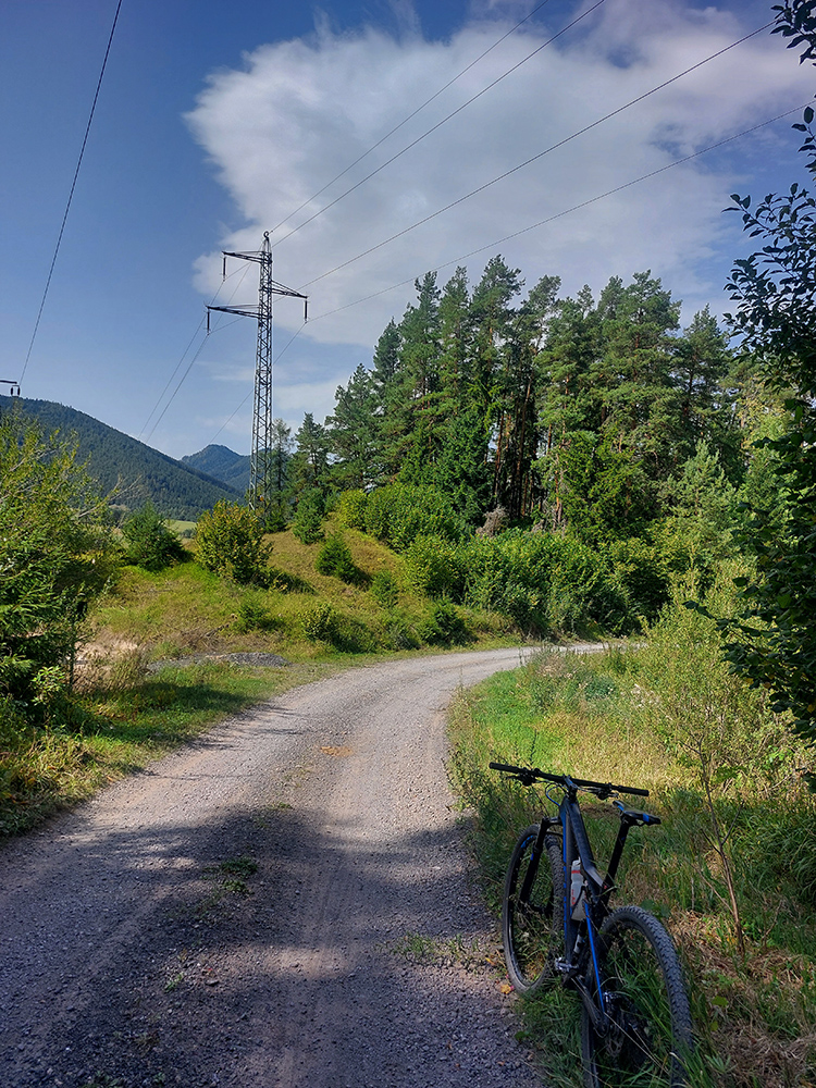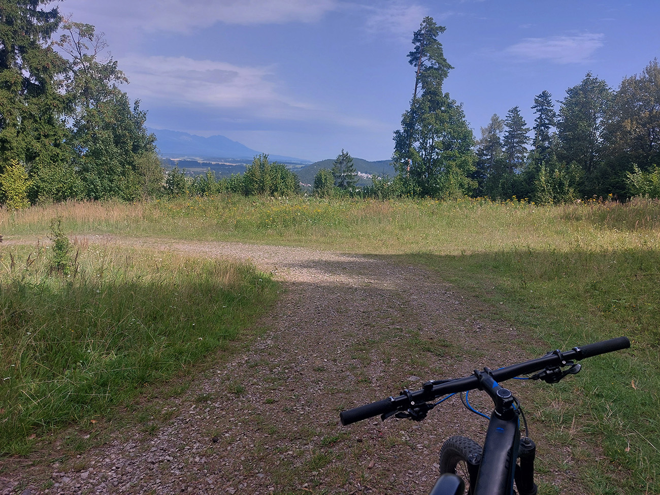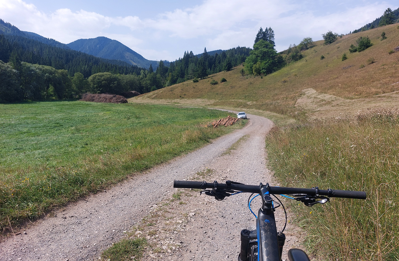 Až do Važca som ale nezišiel – obchádzal som dedinu z juhu. Striedali sa tam pekné lesy a udržiavané pasienky, pod kolesami najprv tráva, ale potom zväčša šotolina. Len jeden menej pohodlný, strmší, hrboľatejší úsek na začiatku klesania do Východnej, popod Klobušov (955 m). Isteže, celé by sa to dalo aj inokade, napríklad okrajom dediny, popri jaskyni a dolinou Bieleho Váhu. Ale toto bol myslím krajší variant, aha: