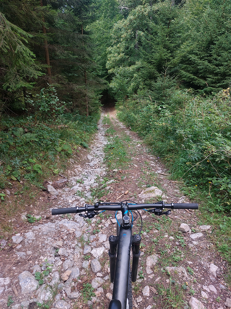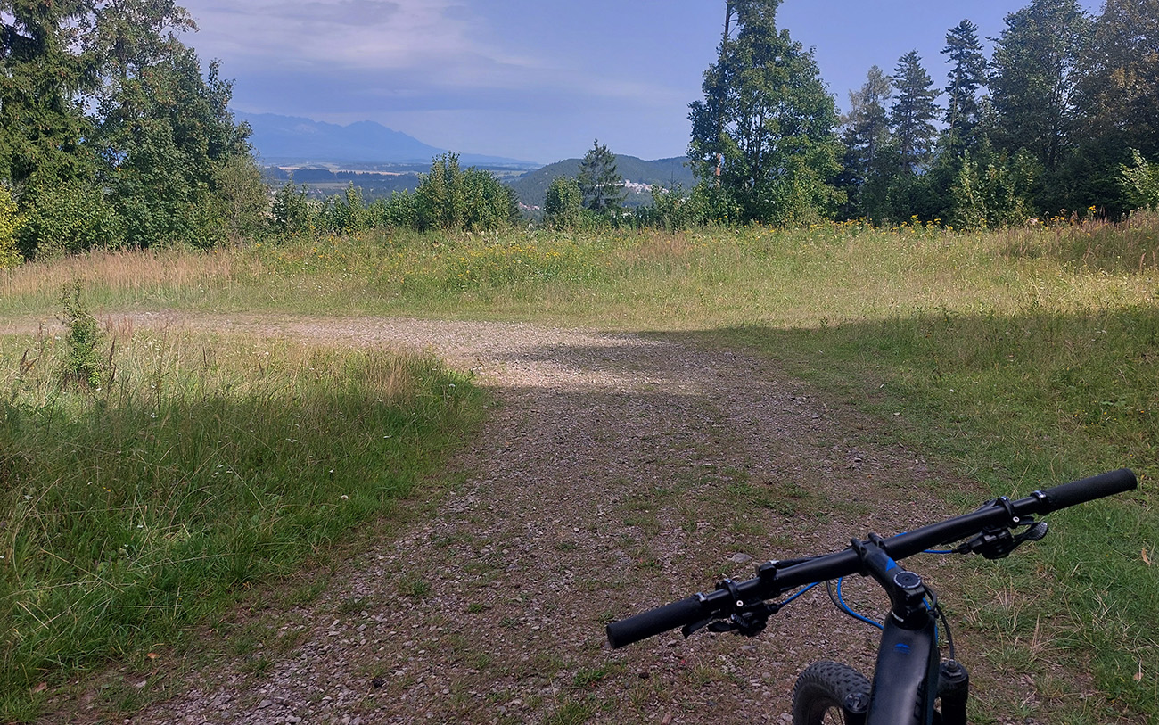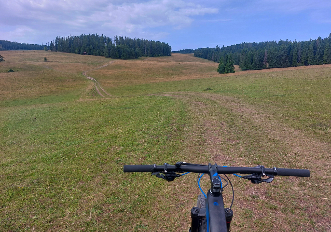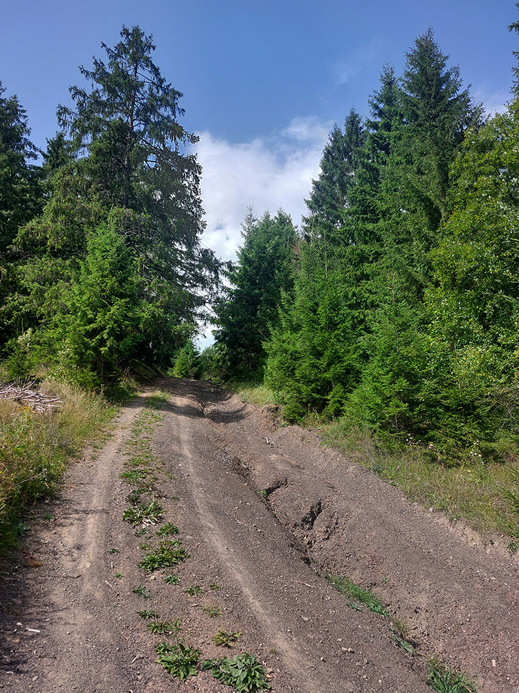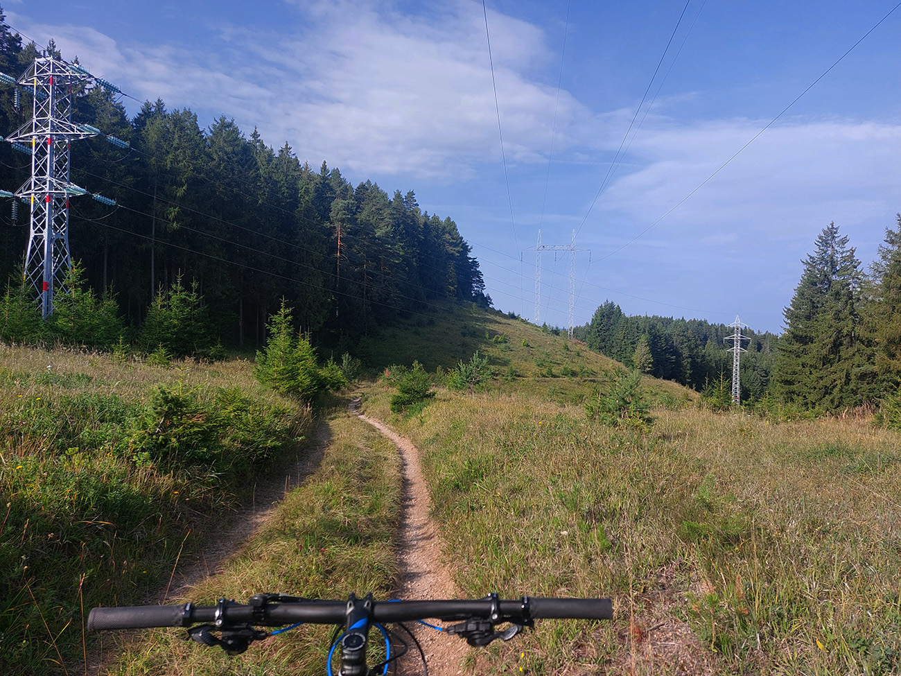 Až do Važca som ale nezišiel – obchádzal som dedinu z juhu. Striedali sa tam pekné lesy a udržiavané pasienky, pod kolesami najprv tráva, ale potom zväčša šotolina. Len jeden menej pohodlný, strmší, hrboľatejší úsek na začiatku klesania do Východnej, popod Klobušov (955 m). Isteže, celé by sa to dalo aj inokade, napríklad okrajom dediny, popri jaskyni a dolinou Bieleho Váhu. Ale toto bol myslím krajší variant, aha: