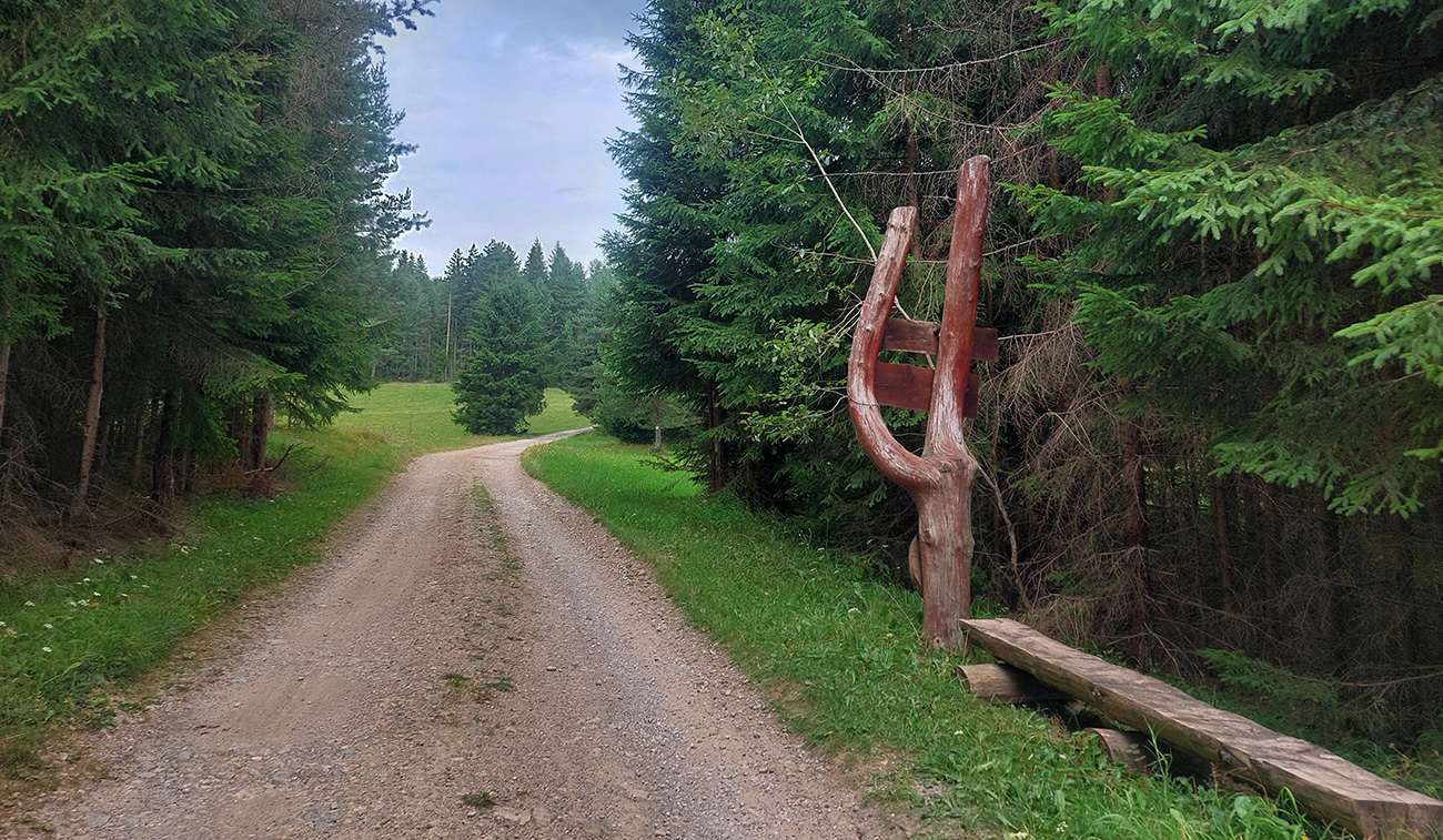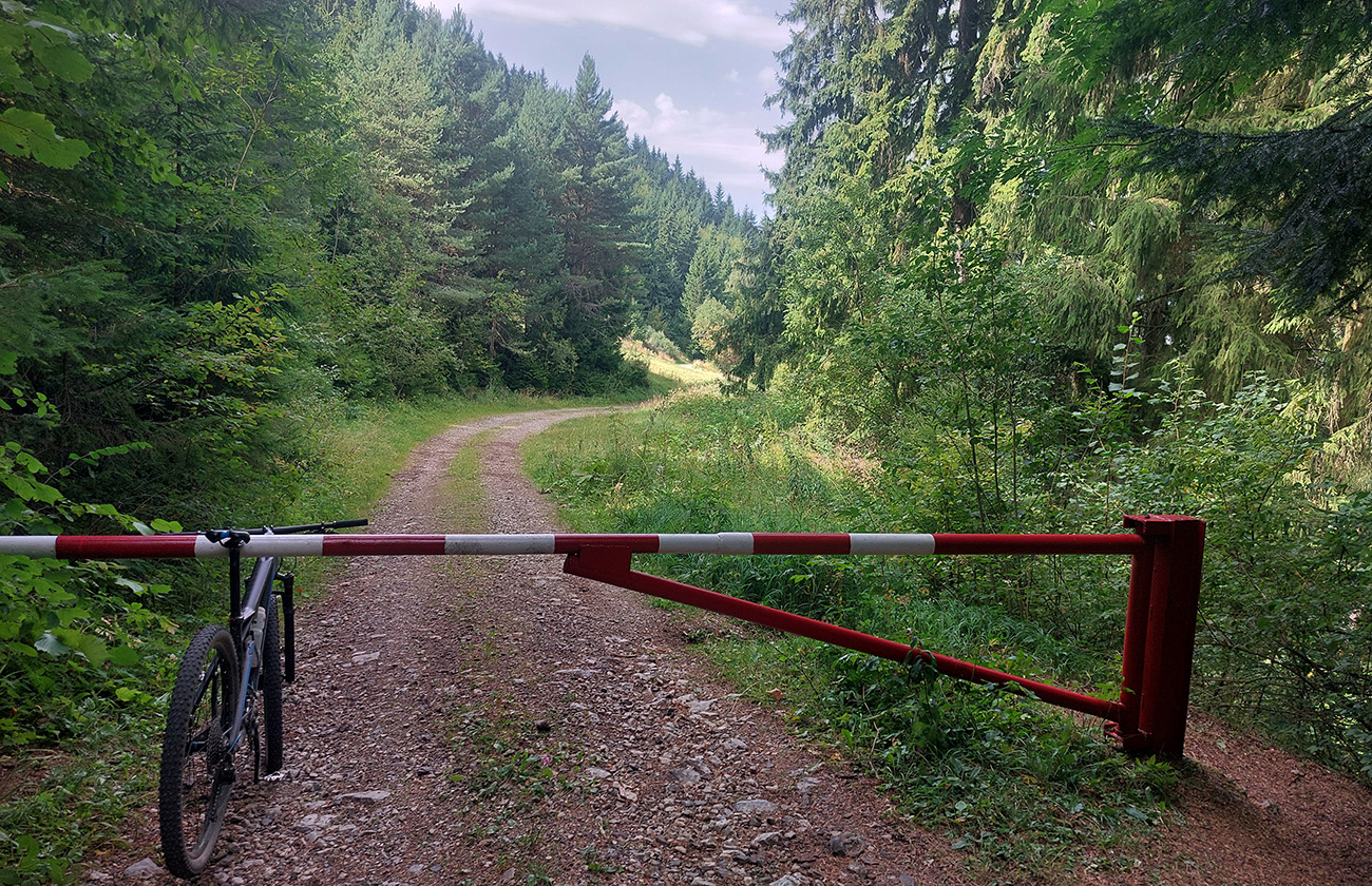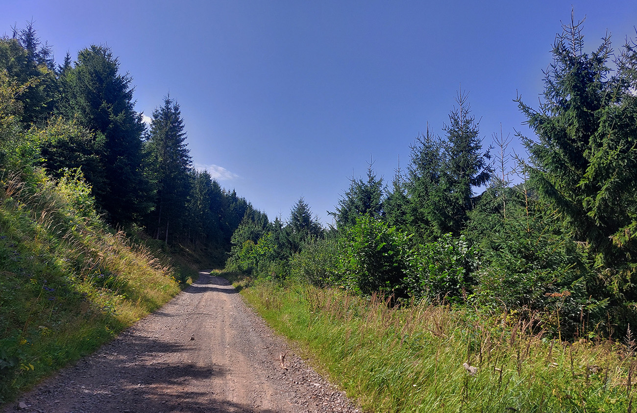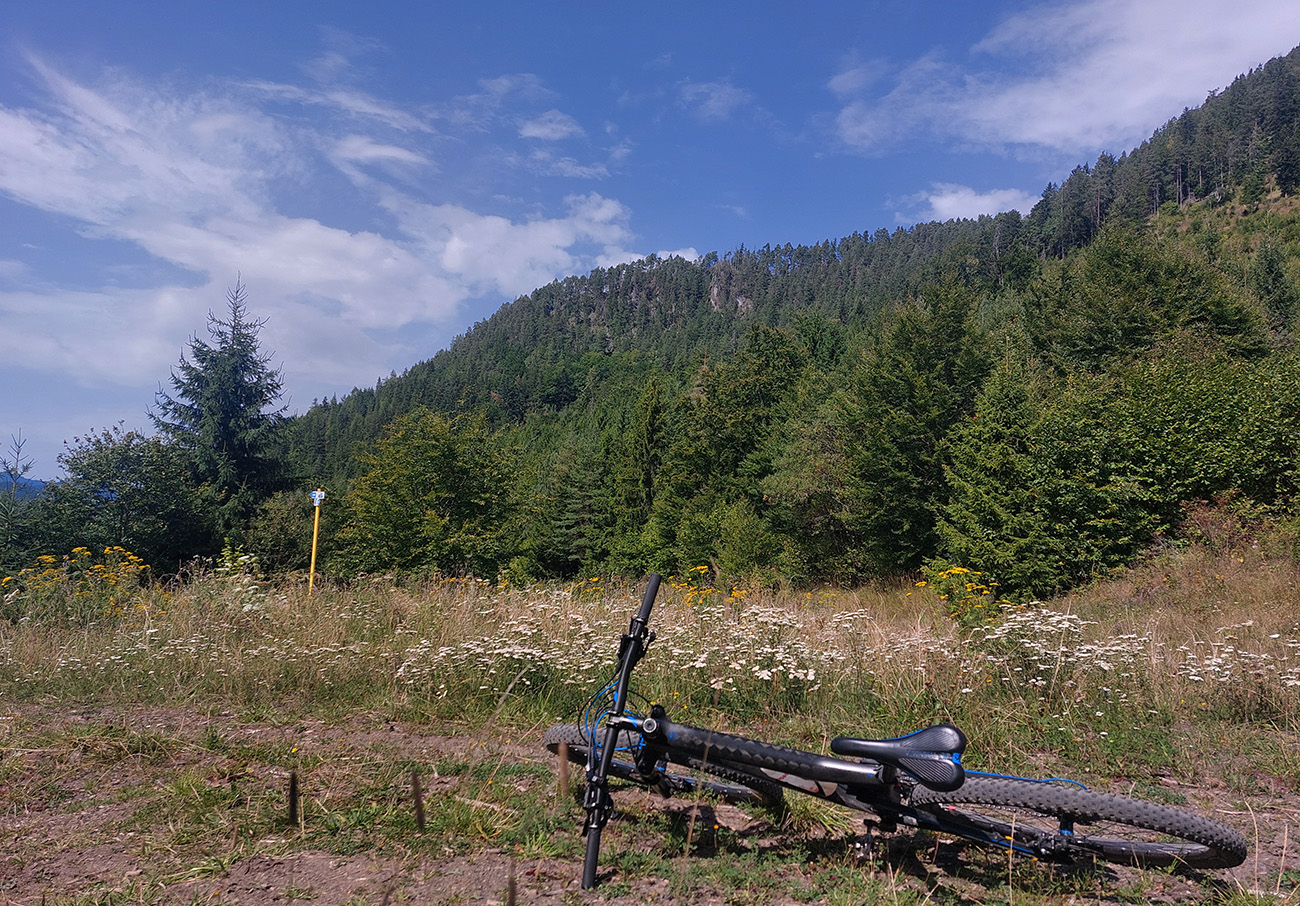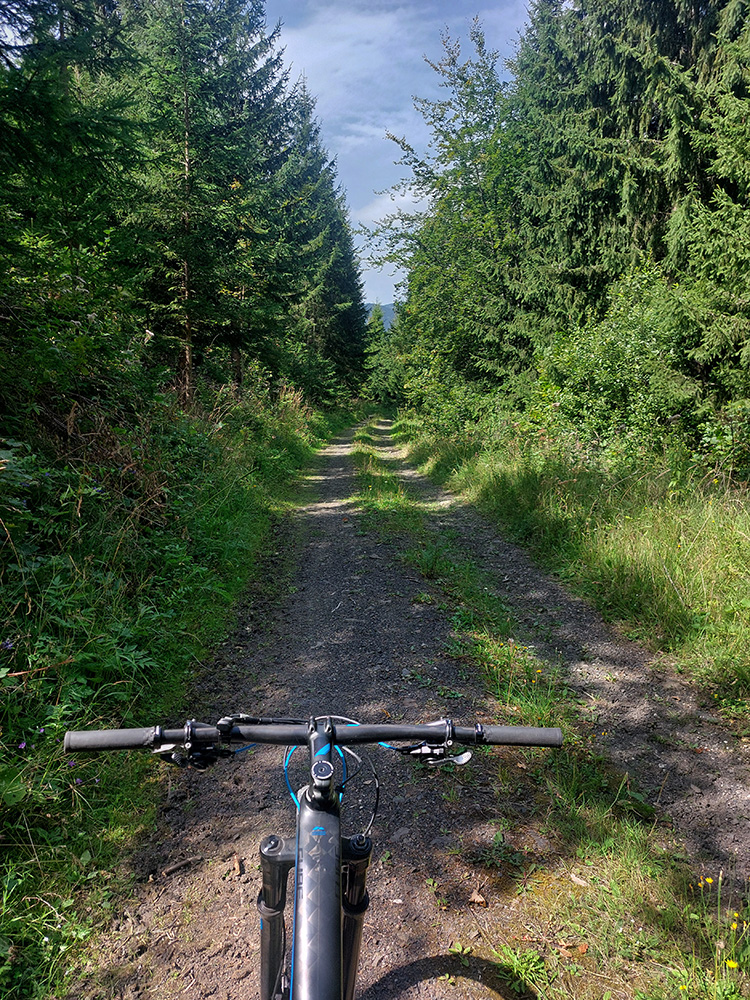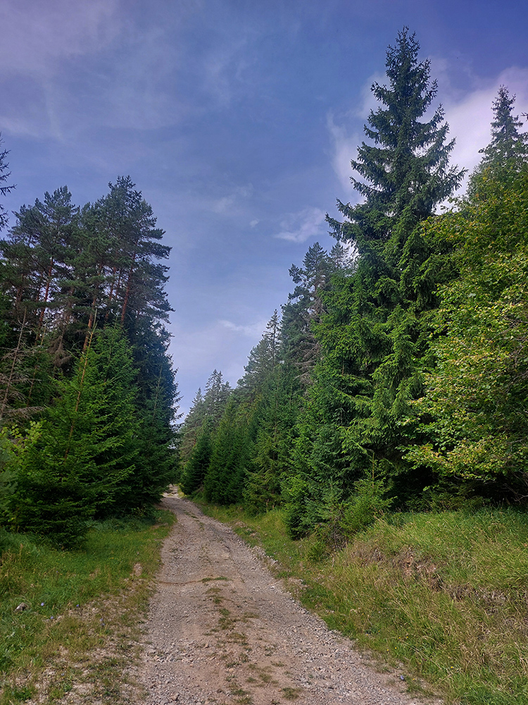 Až do Važca som ale nezišiel – obchádzal som dedinu z juhu. Striedali sa tam pekné lesy a udržiavané pasienky, pod kolesami najprv tráva, ale potom zväčša šotolina. Len jeden menej pohodlný, strmší, hrboľatejší úsek na začiatku klesania do Východnej, popod Klobušov (955 m). Isteže, celé by sa to dalo aj inokade, napríklad okrajom dediny, popri jaskyni a dolinou Bieleho Váhu. Ale toto bol myslím krajší variant, aha: